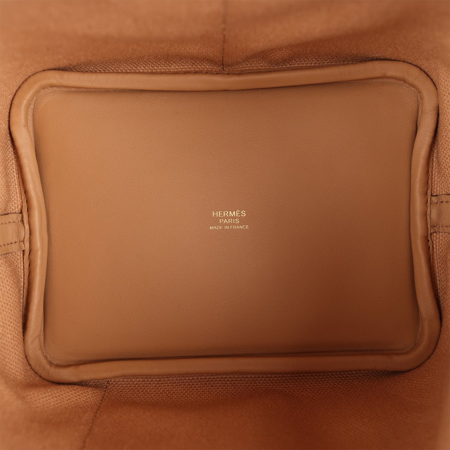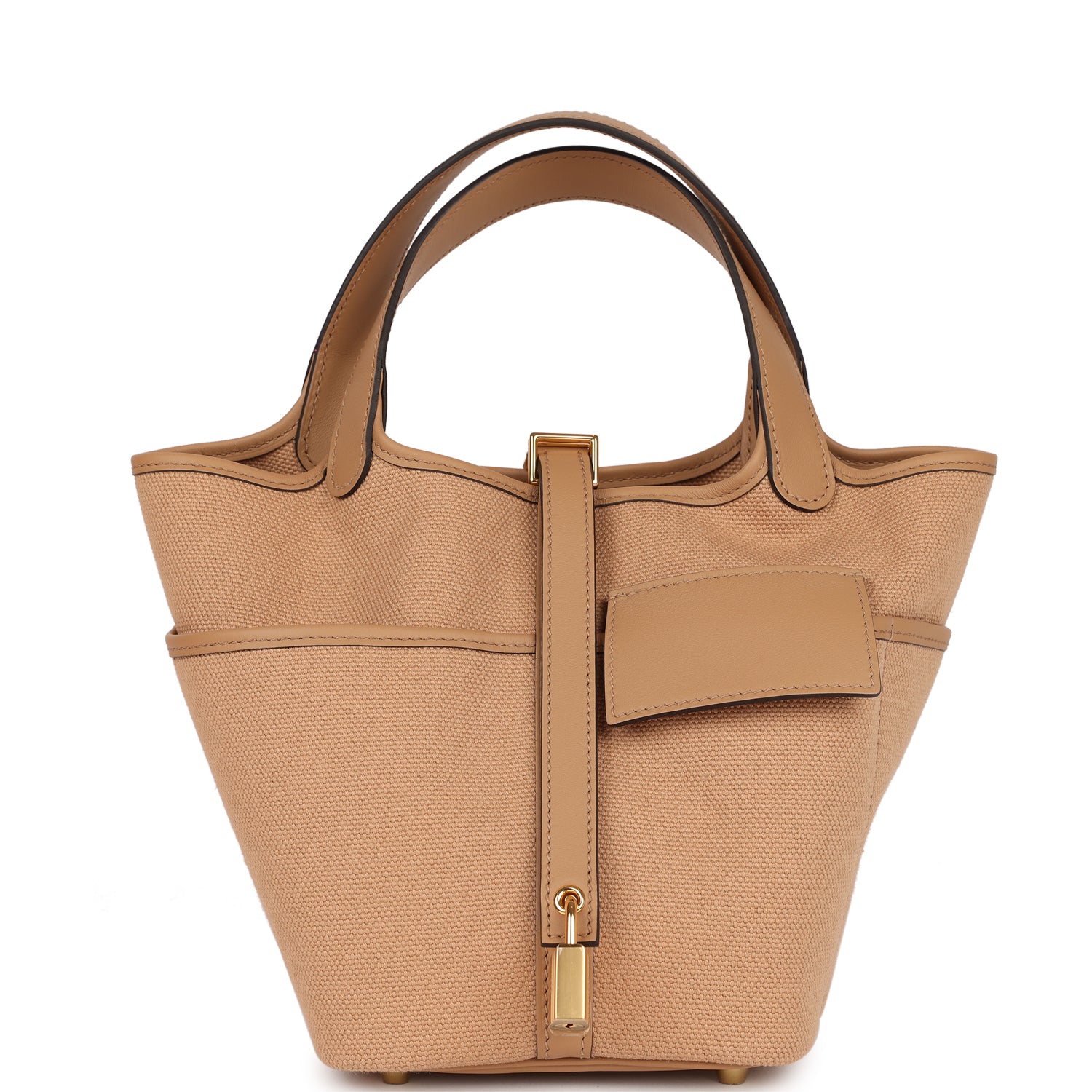 This Cargo Picotin Lock is in Chai swift leather and toile with gold hardware and has tonal stitching, four exterior pockets with two top handles.
