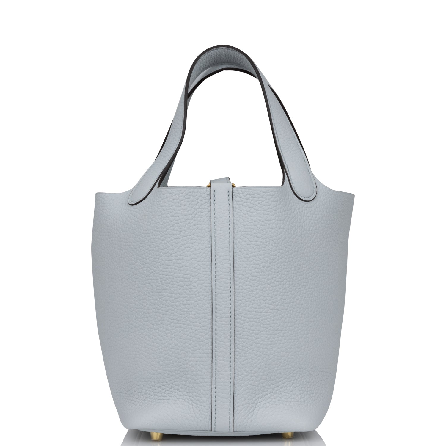 This Picotin Lock is in Bleu Pale clemence leather with gold hardware and has tonal stitching with two top handles.