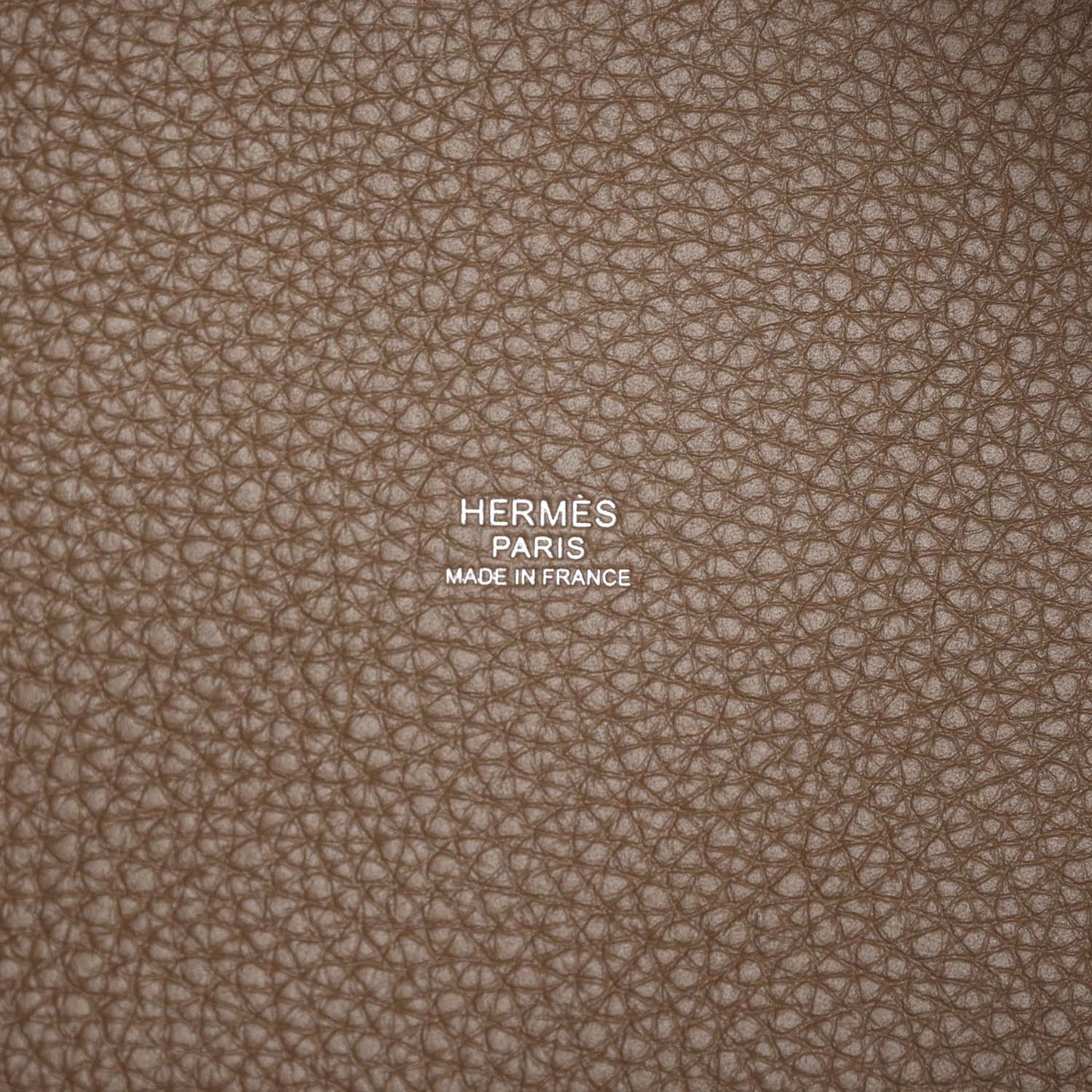 This Picotin Lock is in Etoupe clemence leather with palladium hardware and has contrast stitching with two top handles.