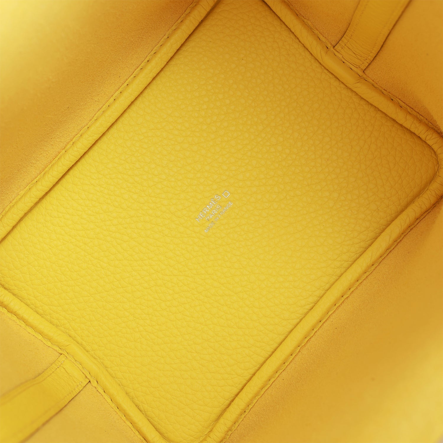 This Picotin Lock is in Mimosa matte alligator and Lime clemence leather with palladium hardware and has tonal stitching with two top handles.