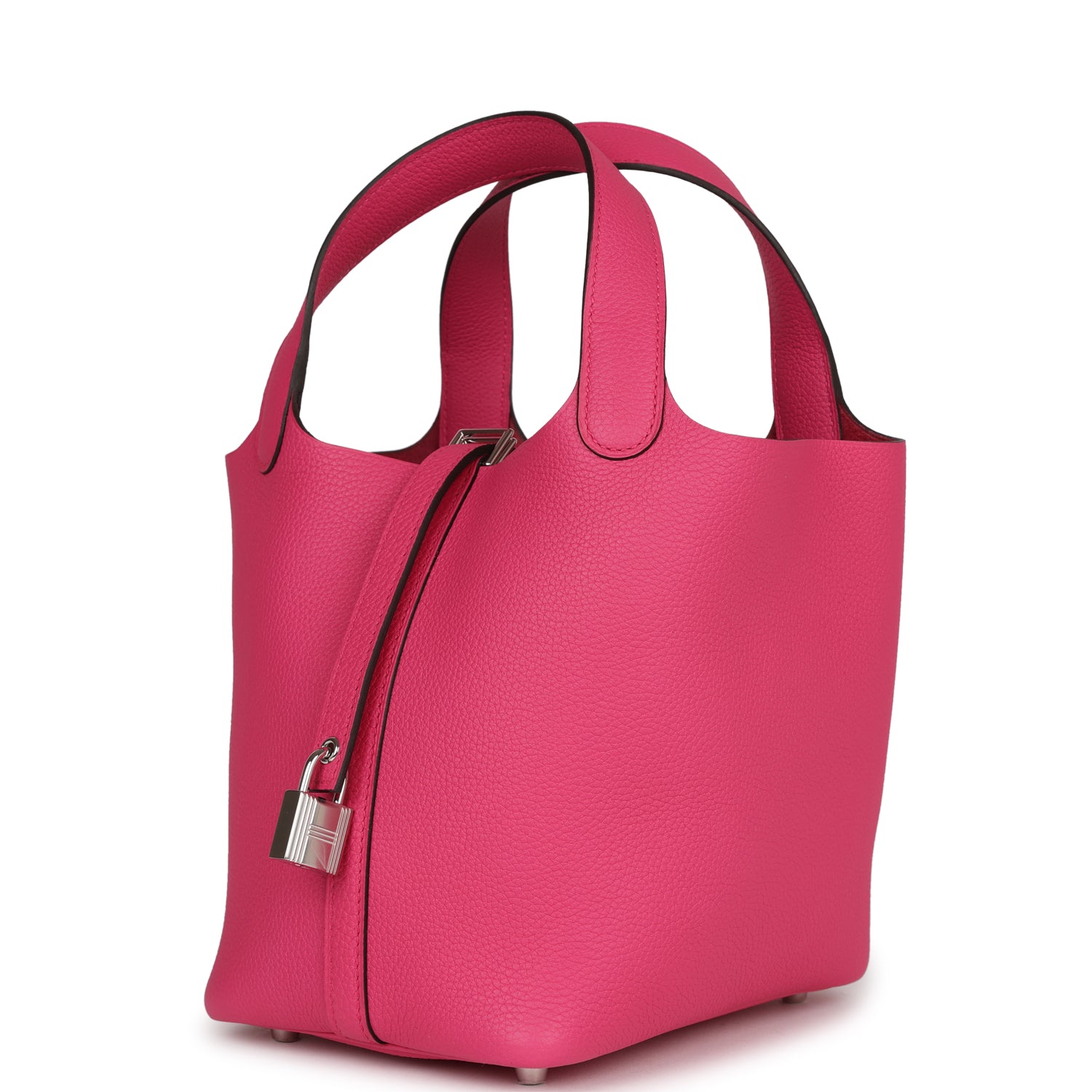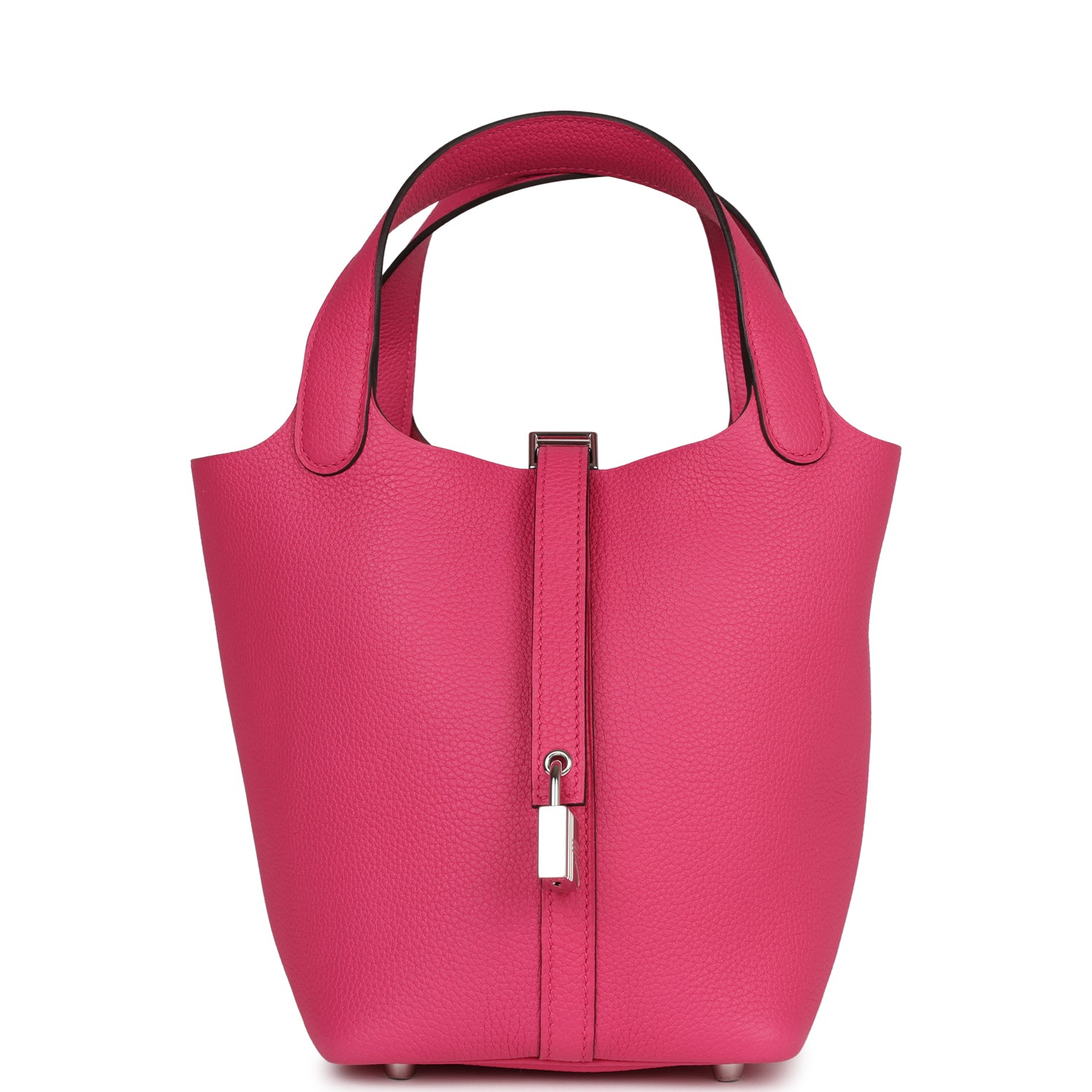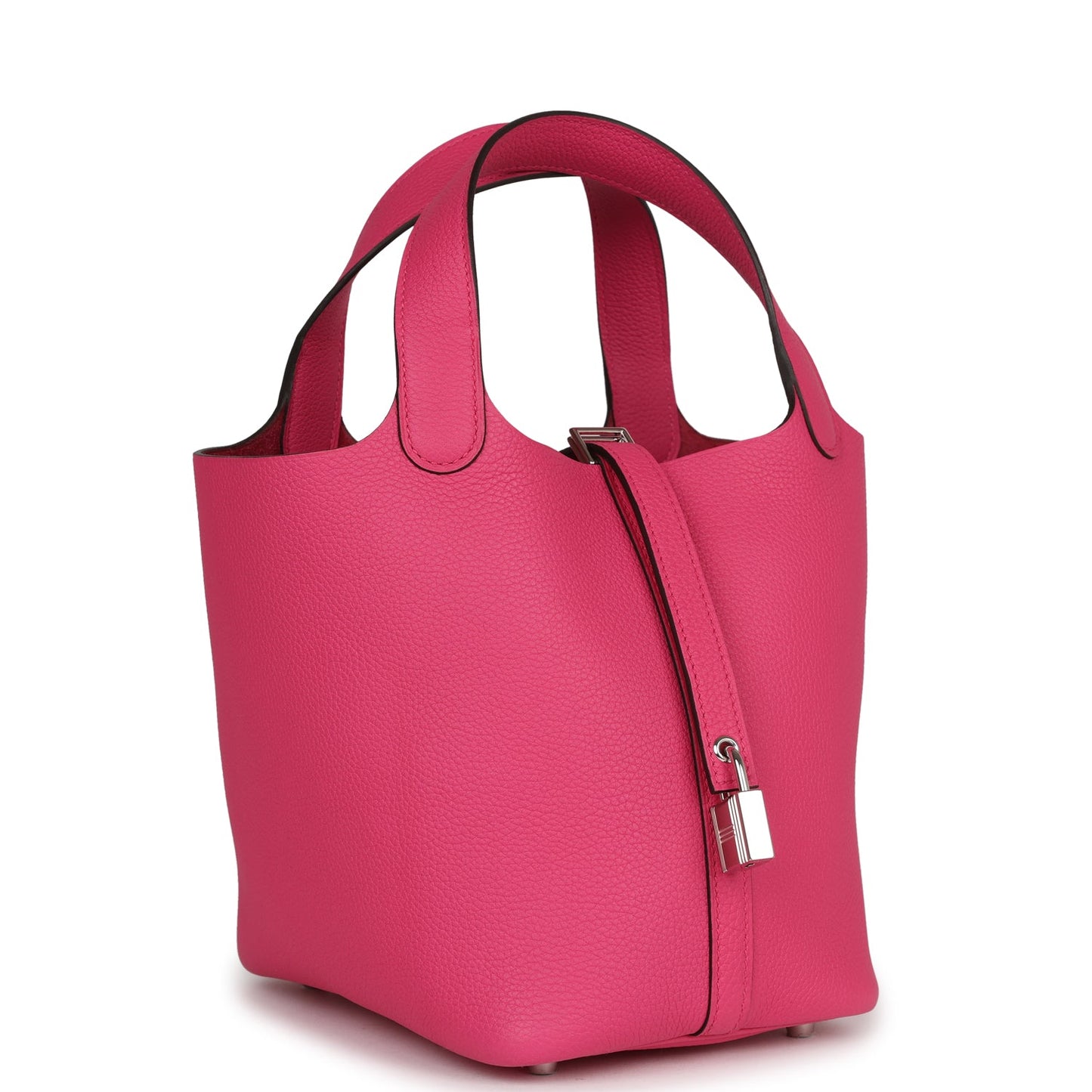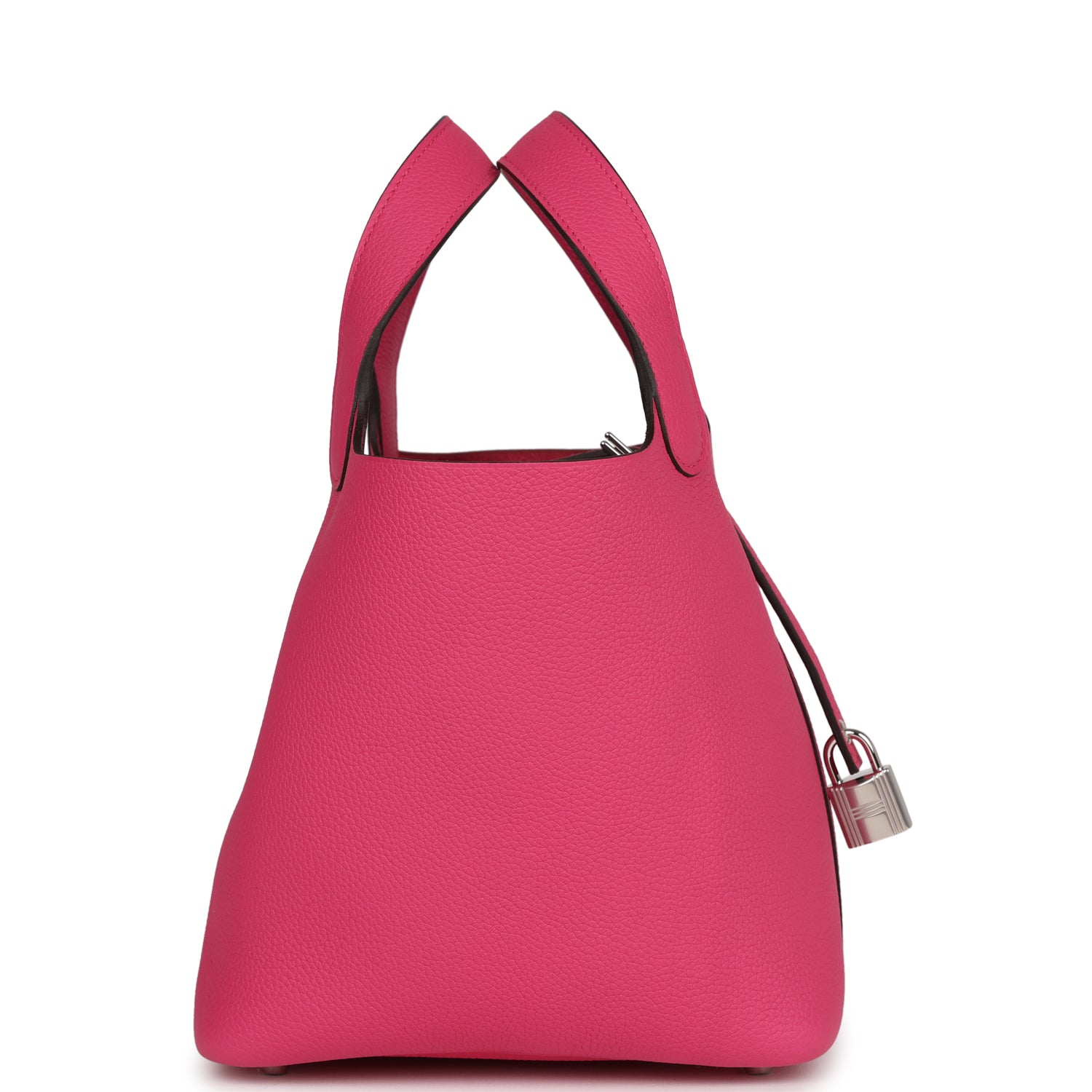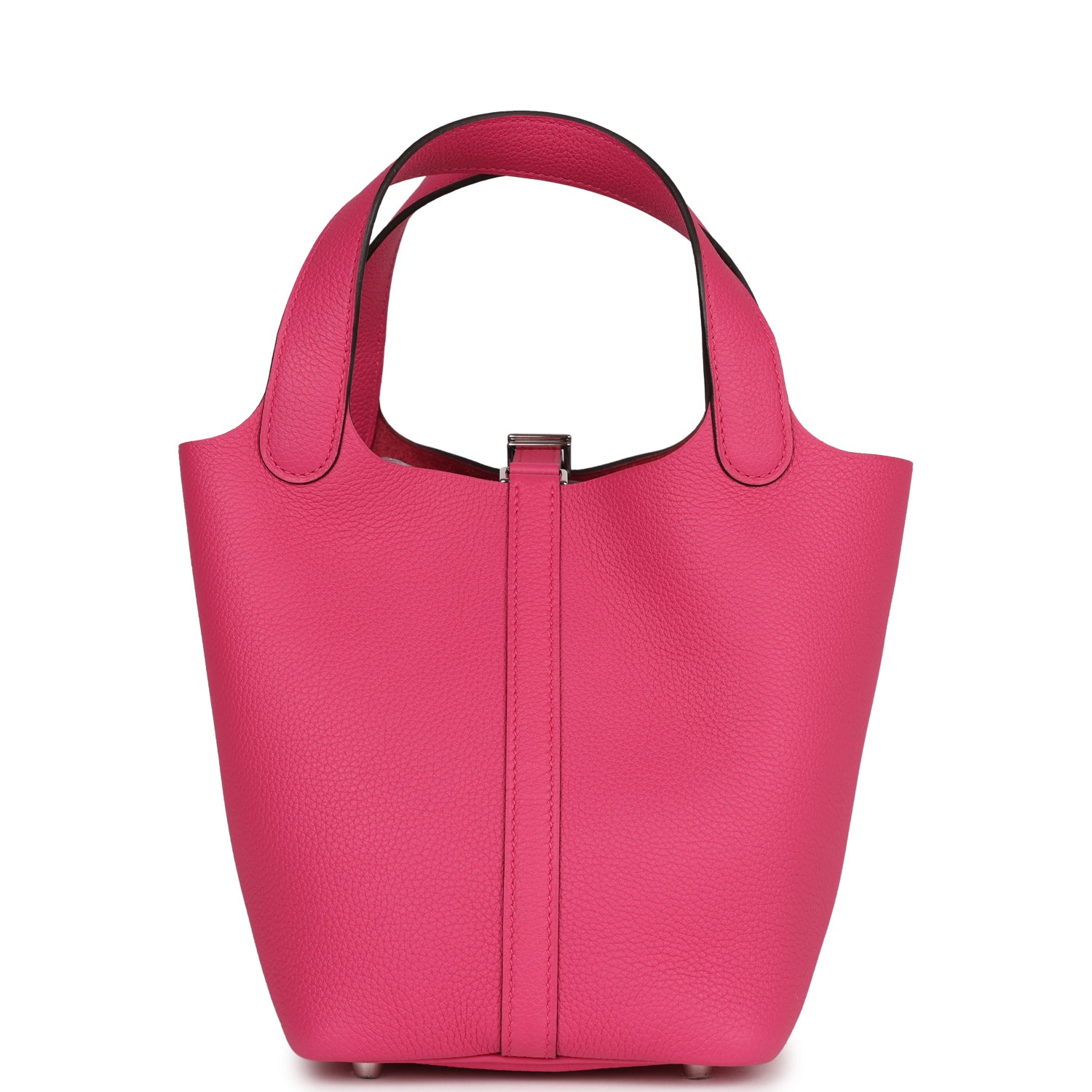 This Picotin Lock is in Rose Shocking maurice leather with palladium hardware and has tonal stitching with two top handles.