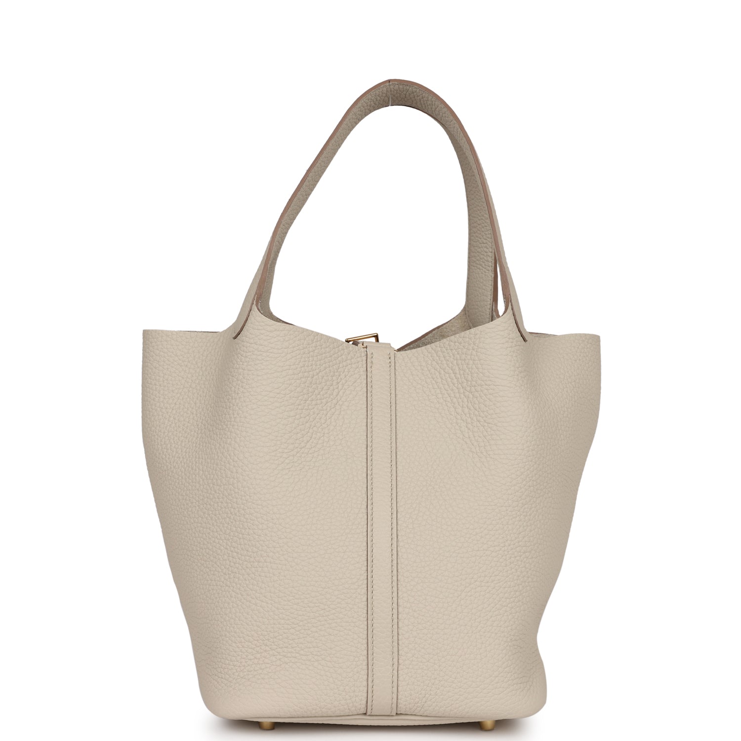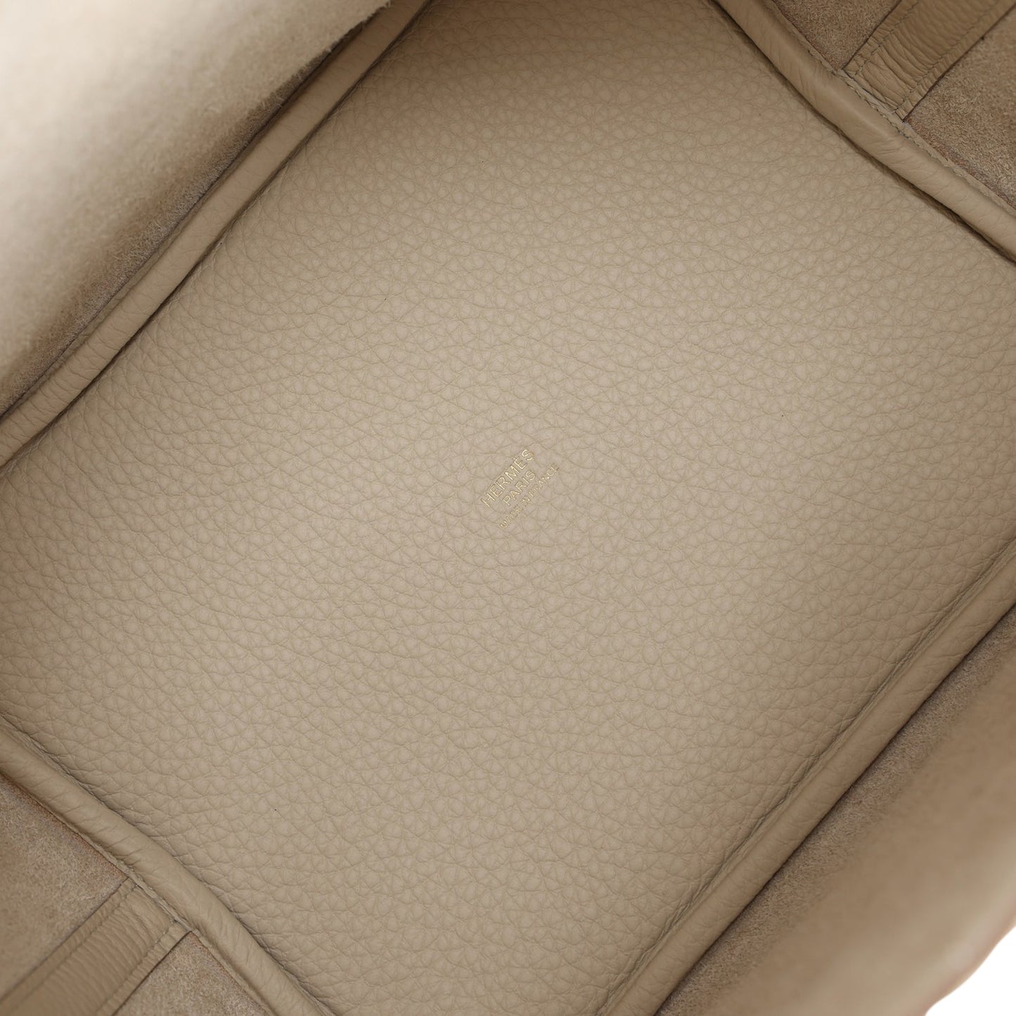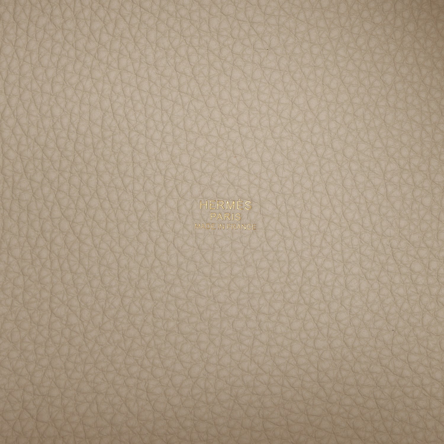 This Picotin is in Beton clemence leather with gold hardware and has tonal stitching with two top handles.