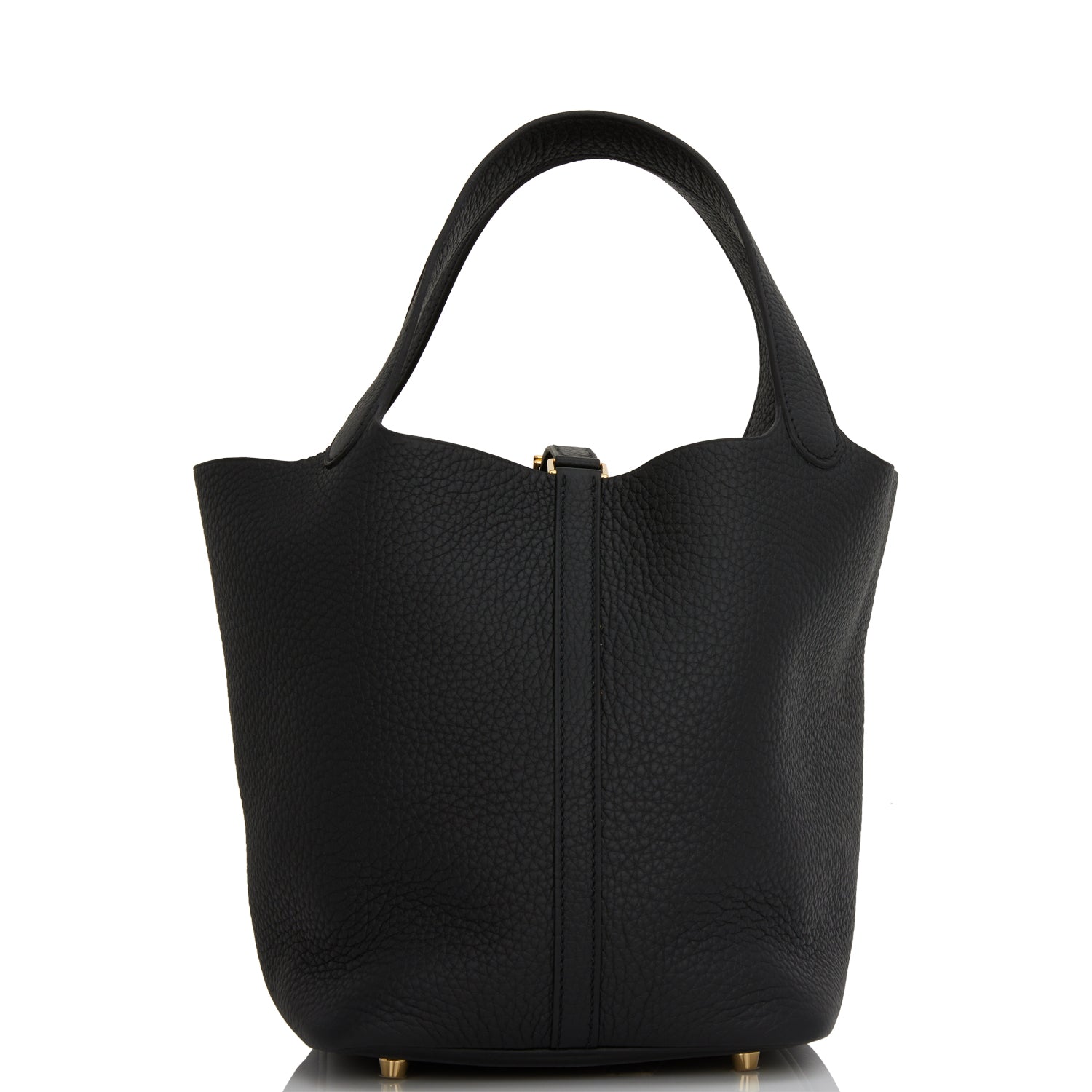 This Picotin is in Black clemence leather with gold hardware and has tonal stitching with two top handles.