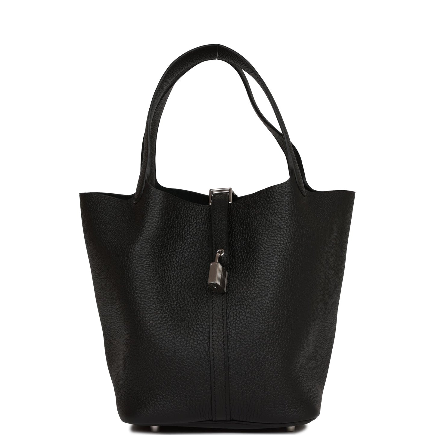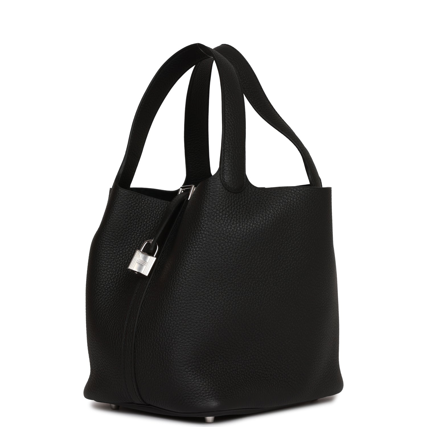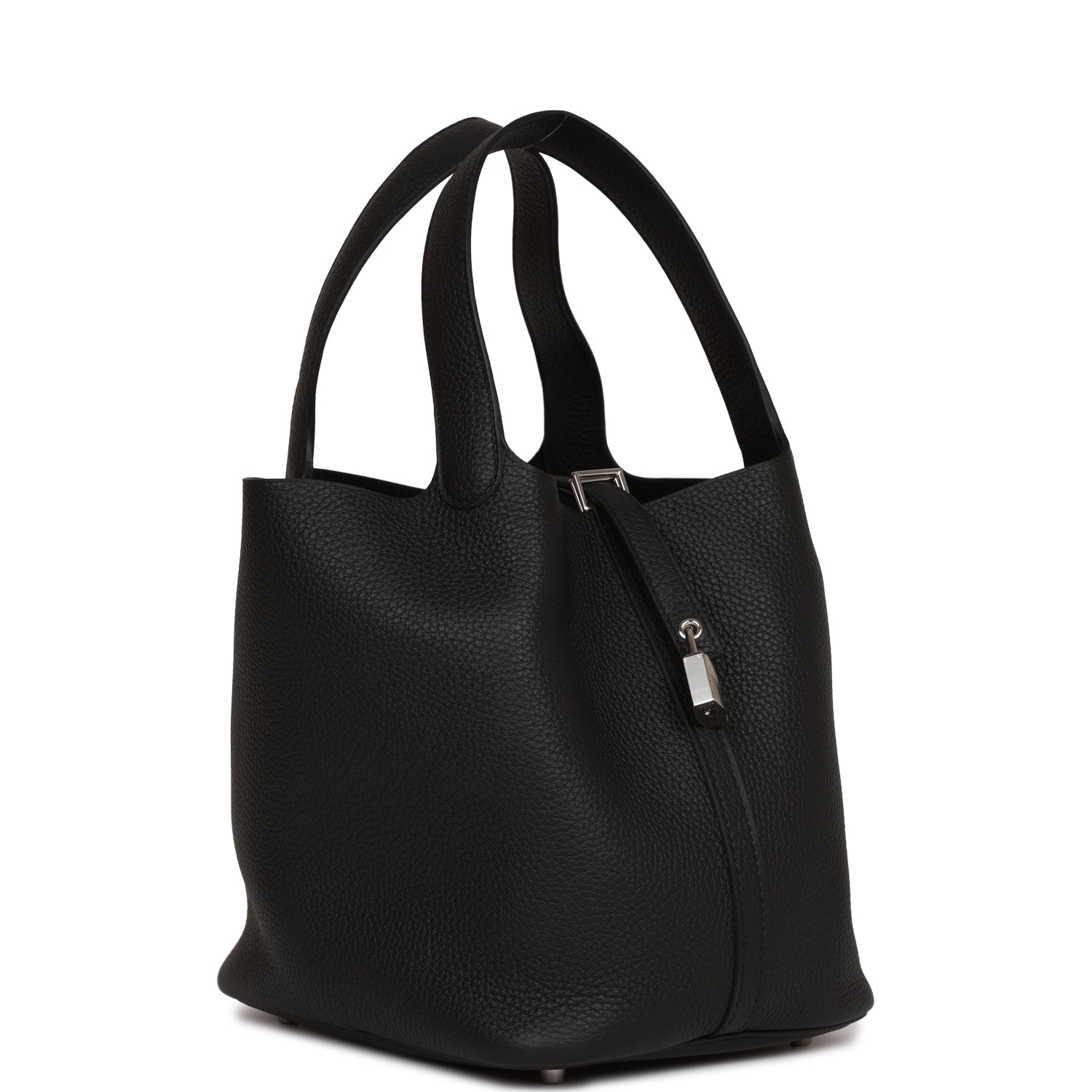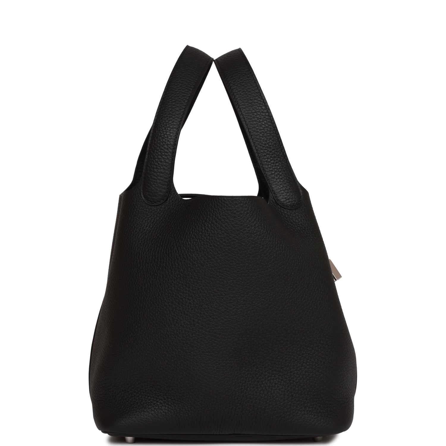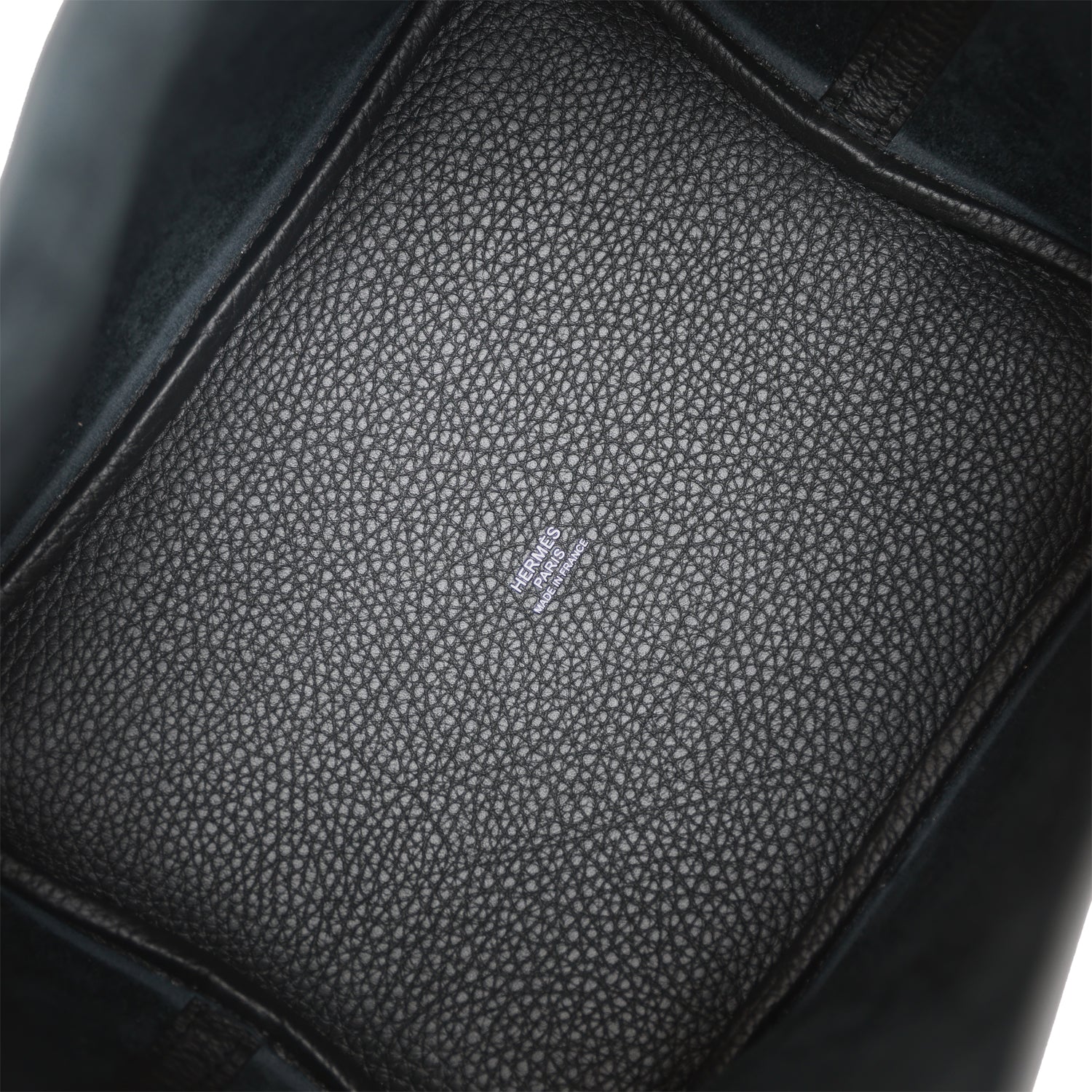 This Picotin is in black clemence leather with palladium hardware and has tonal stitching with two top handles.