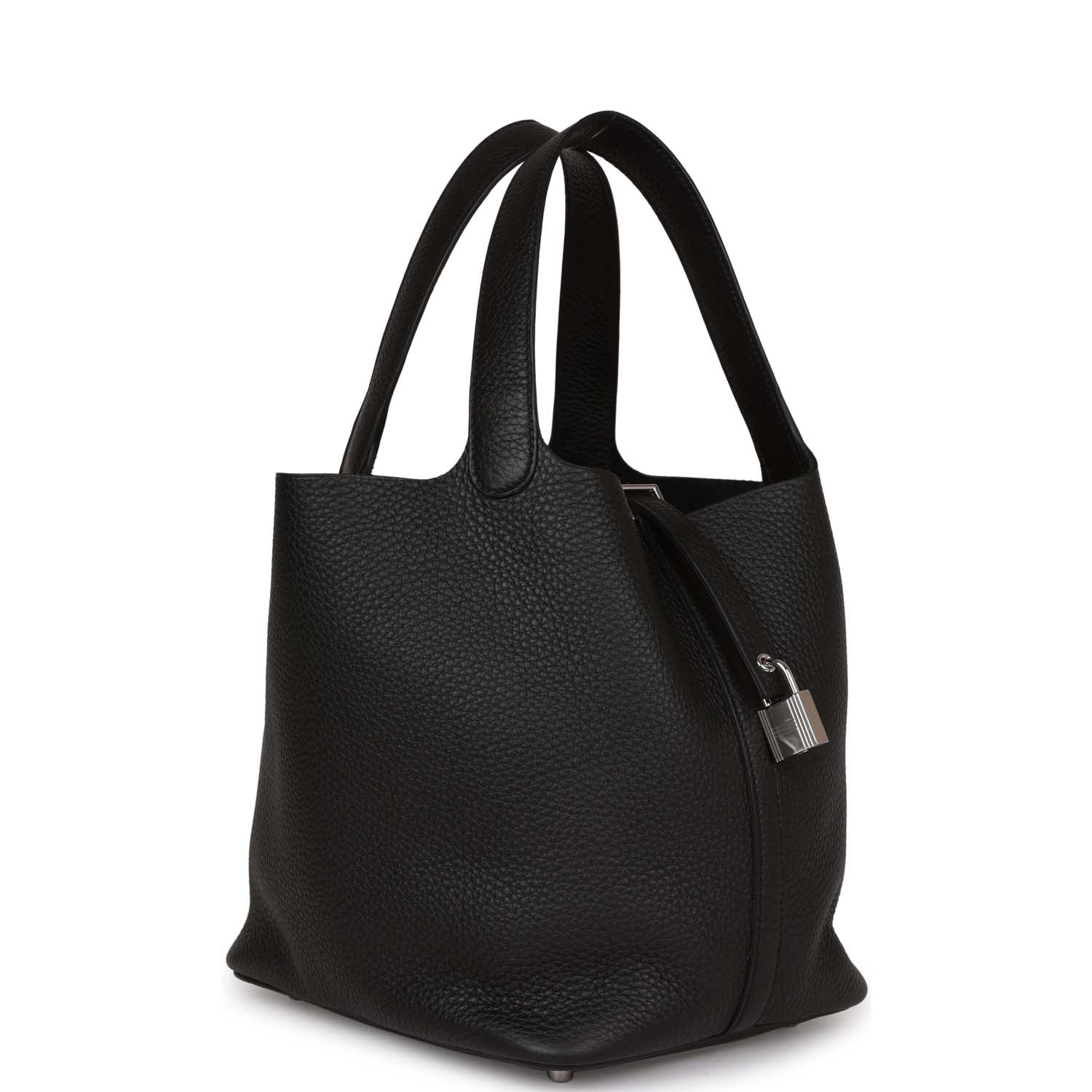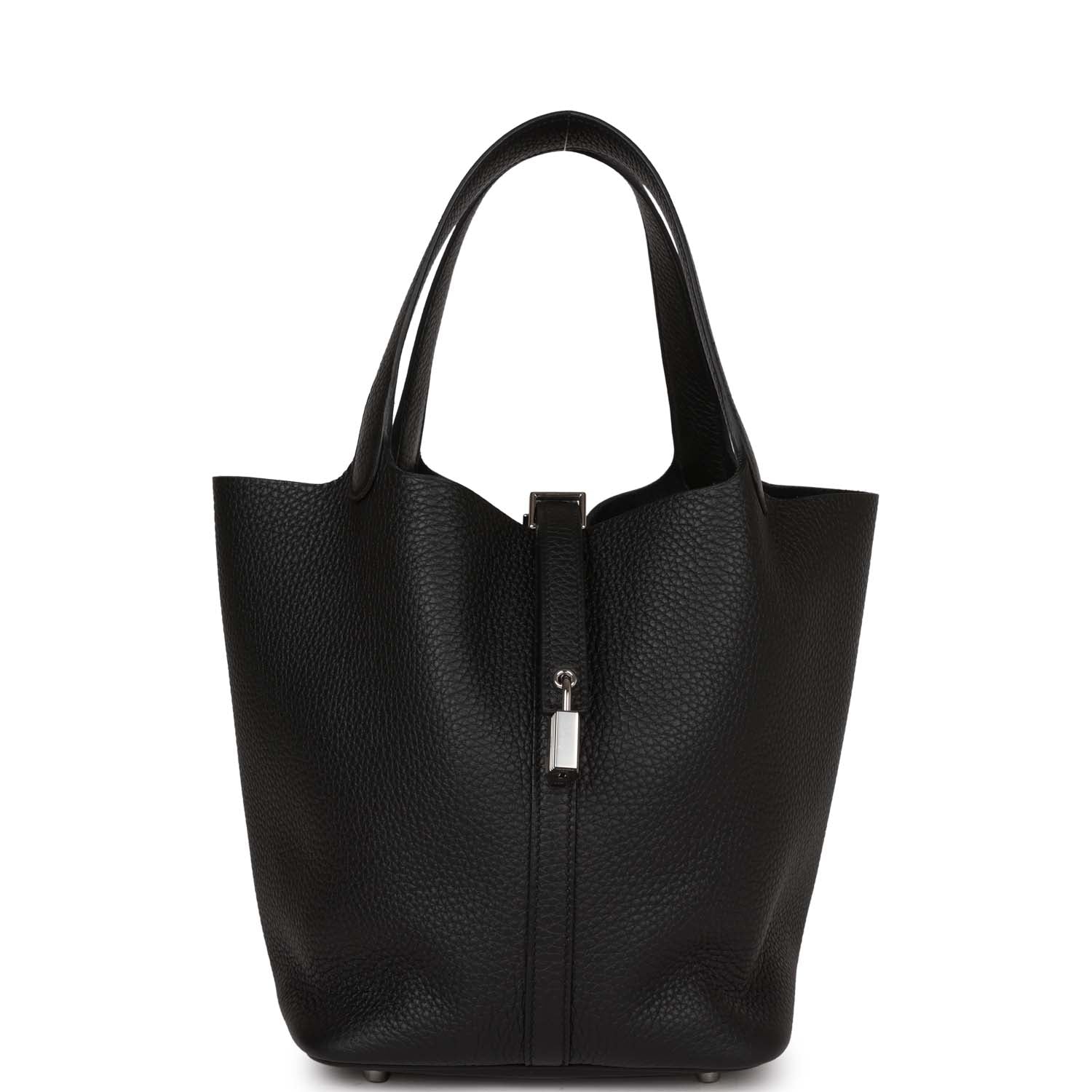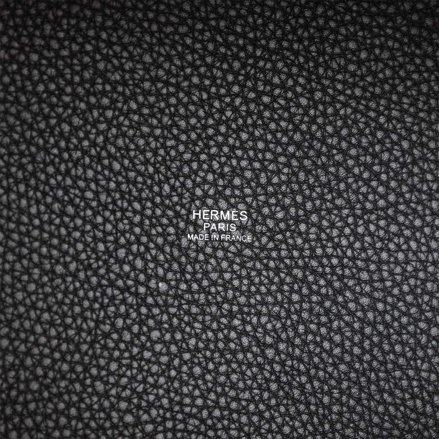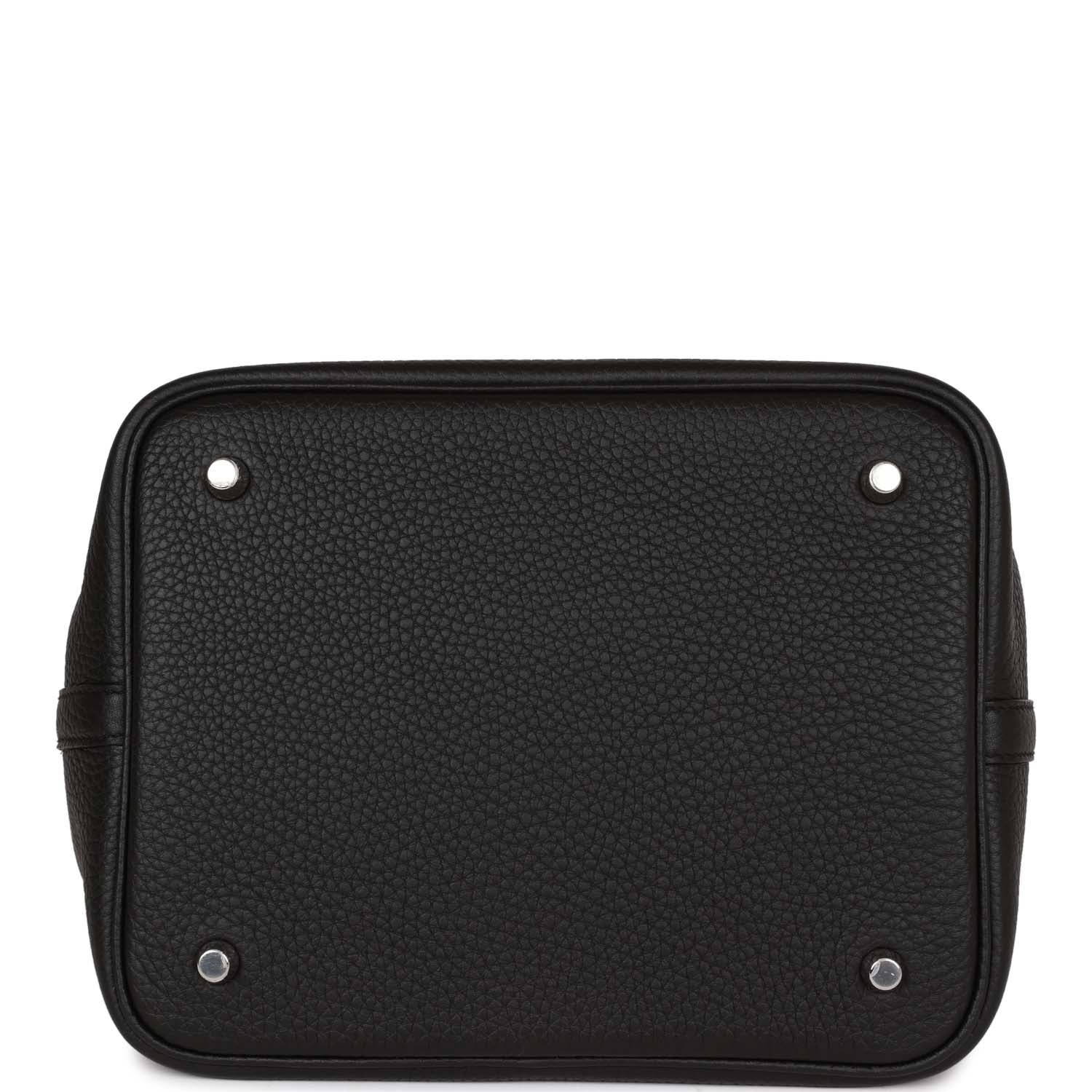 This Picotin is in black clemence leather with palladium hardware and has tonal stitching with two top handles.