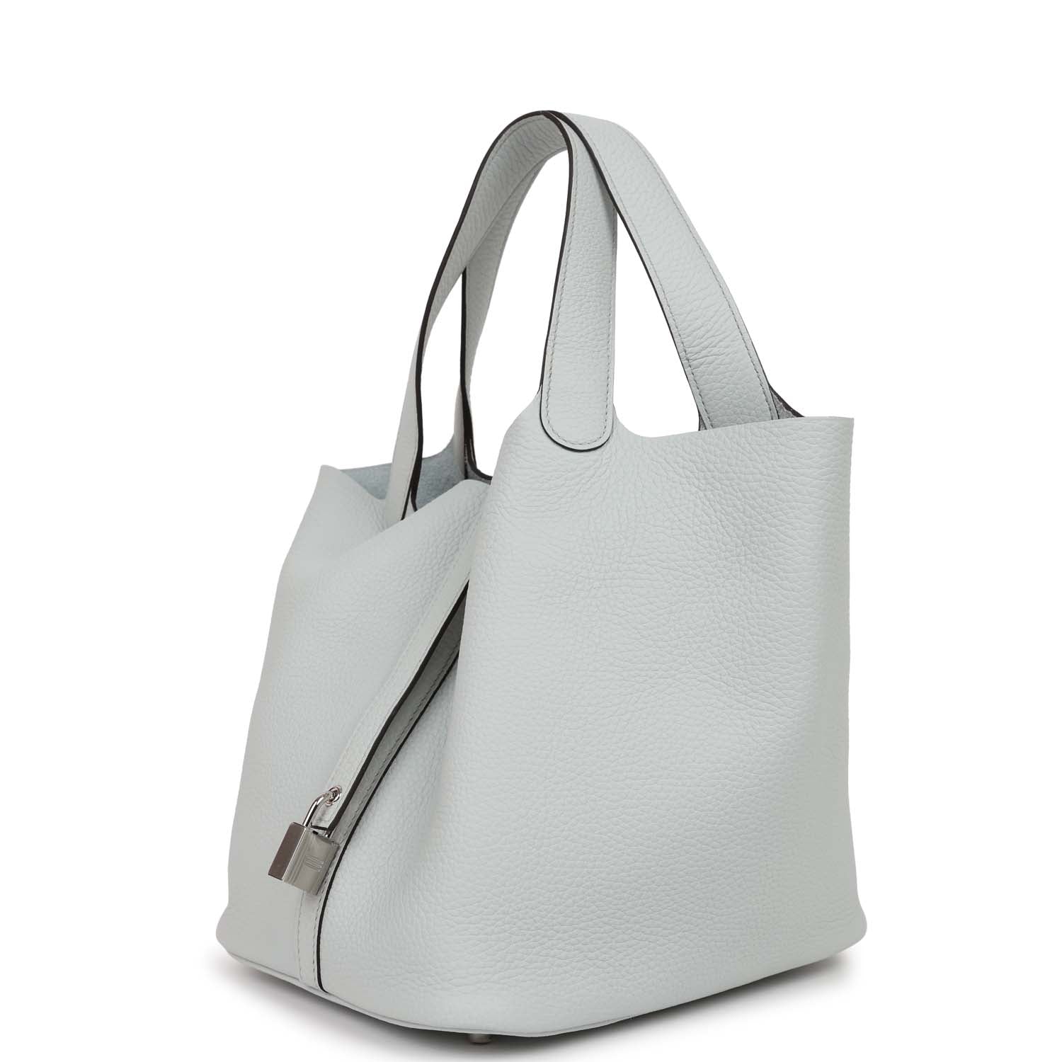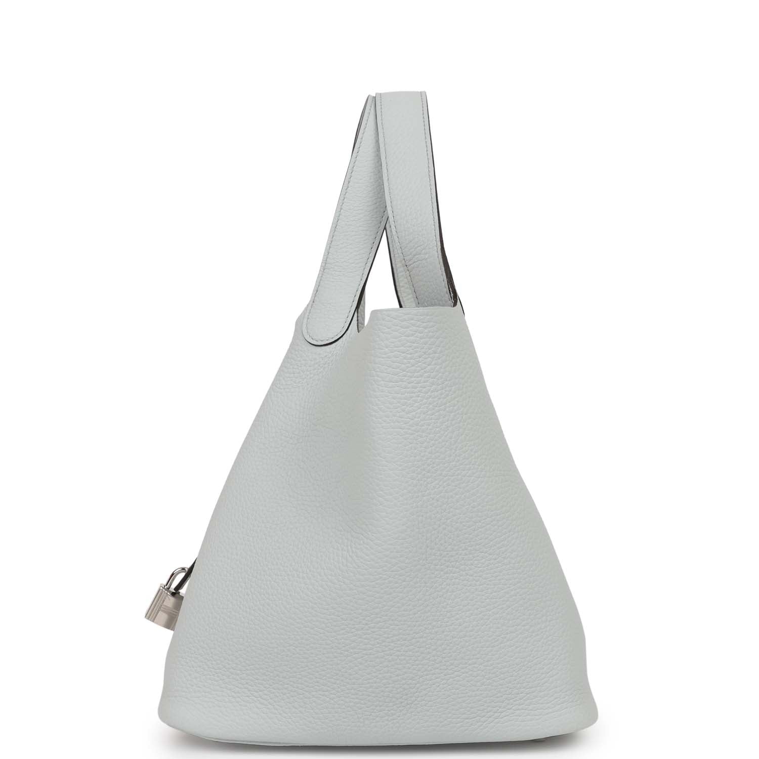 This Picotin is in Bleu Pale clemence leather with palladium hardware and has tonal stitching with two top handles.