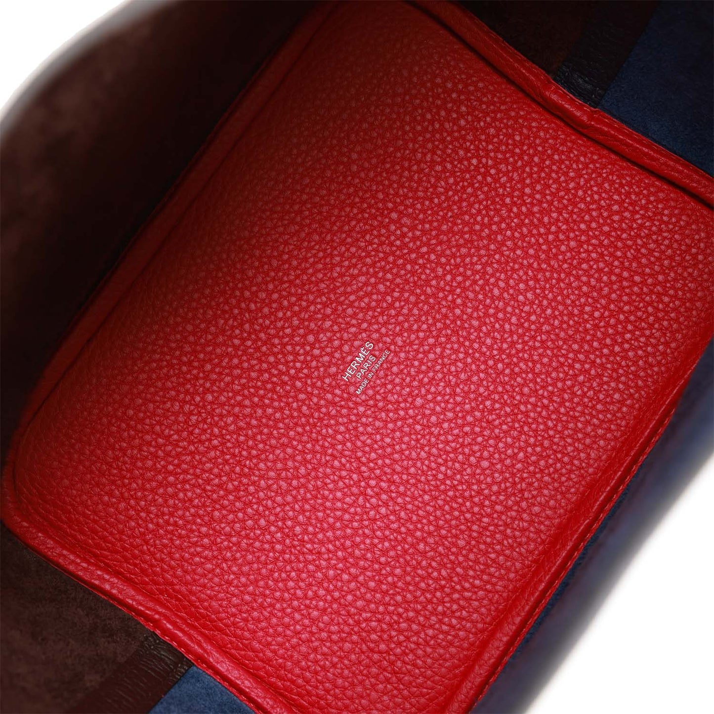 This Casaque Picotin is of Bleu Nuit, Framboise, and Rouge Sellier Clemence leather with palladium hardware and has tonal stitching with two top handles