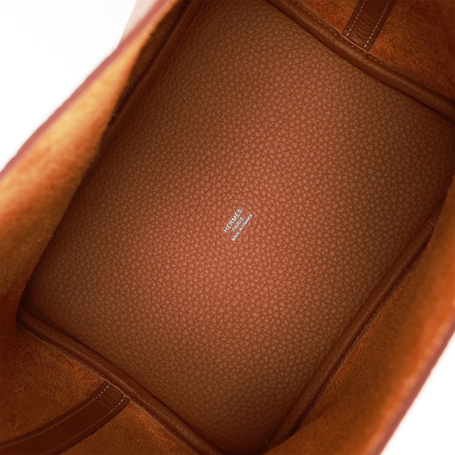 This Picotin is in Gold clemence leather with palladium hardware and has contrast stitching with two top handles.