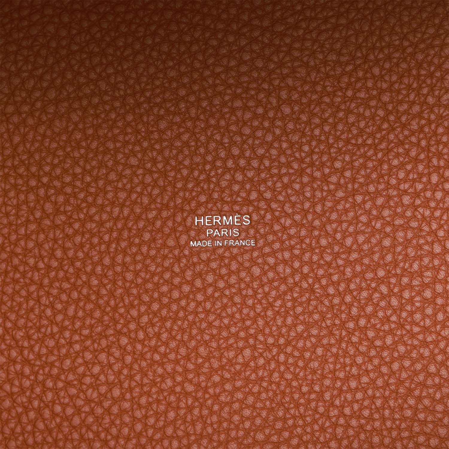 This Picotin is in Gold clemence leather with palladium hardware and has contrast stitching with two top handles.