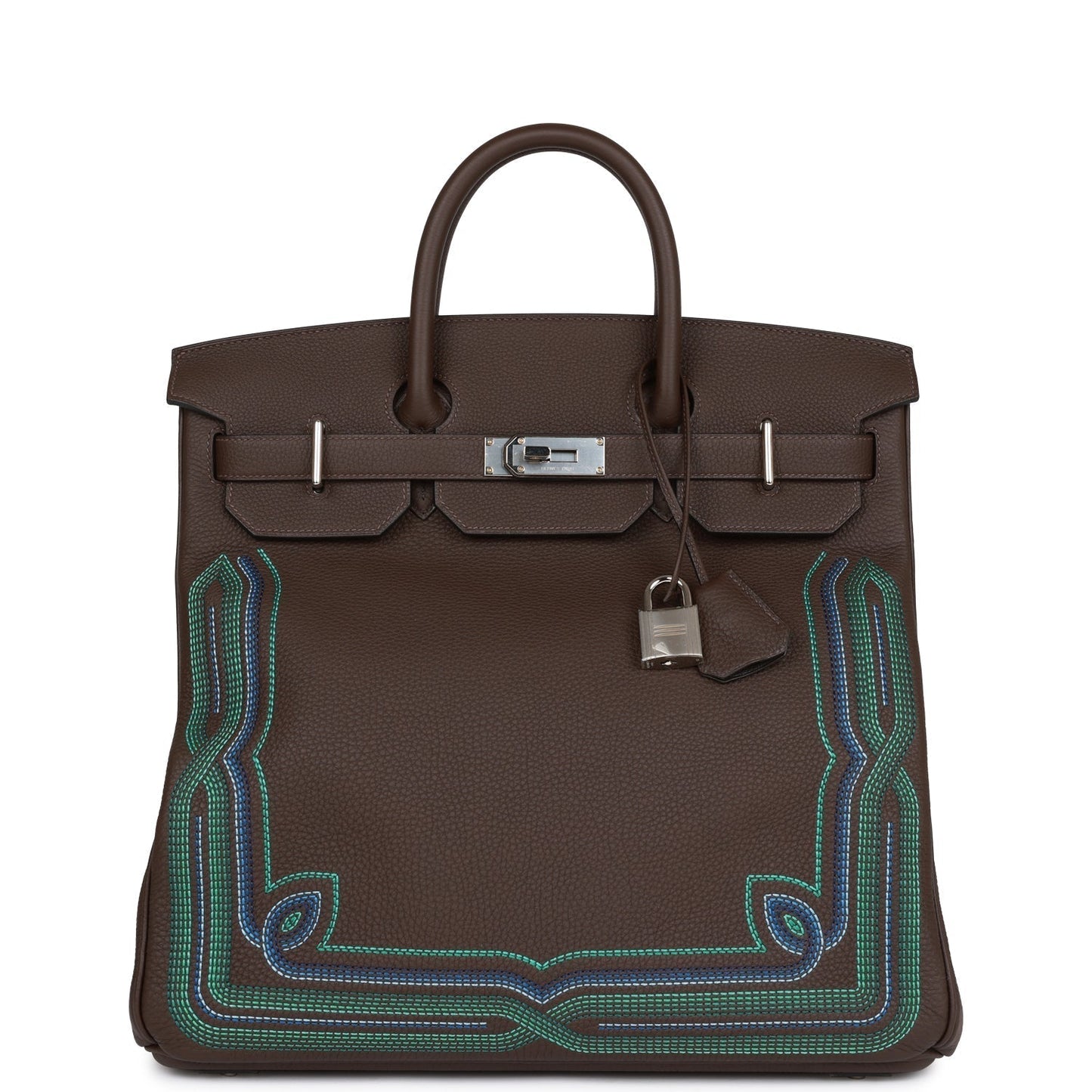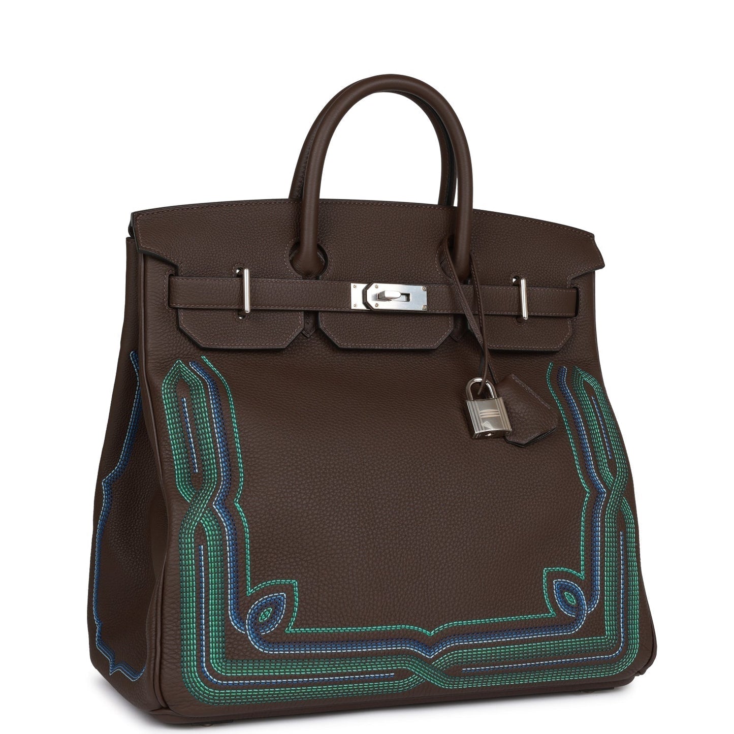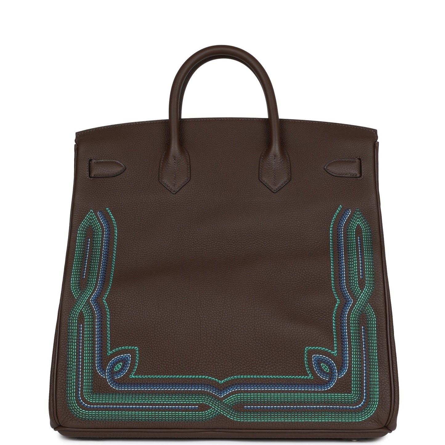 This limited edition Western HAC Birkin is in ebene togo with palladium hardware and has tonal stitching, embroidered details, two straps with front toggle closure, clochette with lock and two keys and double rolled handles.
