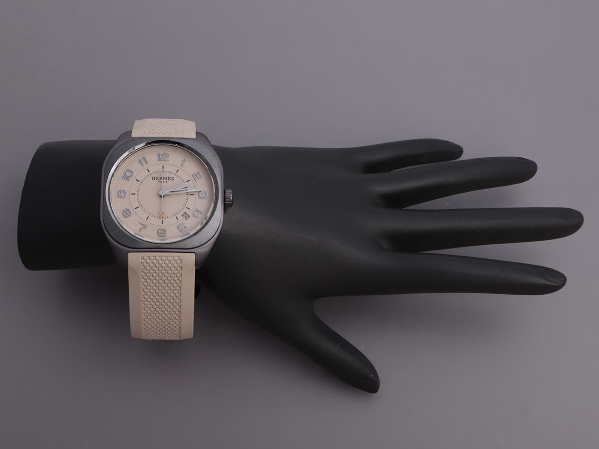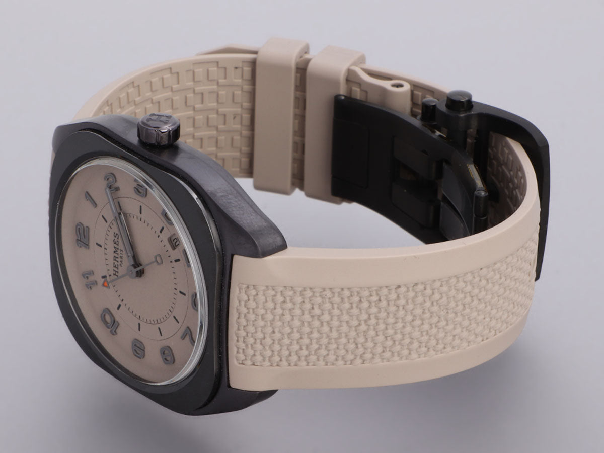 This rare Hermès H08 for Hodinkee Limited-Edition Watch has a 39-millimeter head for a man or woman! It has a titanium case with matte black DLC finish, a taupe dial with silver-tone Arabic numeral hour markers, silver-tone hands, and Swiss-made automatic movement. The taupe rubber strap is adjustable and has a deployment clasp. New and never worn, it comes with a box and booklet. The collaboration between Hermès and Hodinkee produced this watch limited to only 100 and is completely sold out—sounds like a collectible to me!