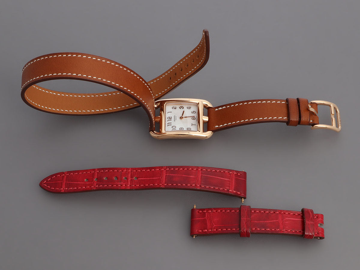Hermès’ 18K Rose Gold Ladies Cape Cod Watch is a sporty timepiece made with uncompromising standards! It has a head that measures 23mm by 35mm, an 18K rose gold case and a mother of pearl face with stylized Arabic numeral hour markers. This Swiss-made watch has quartz movement, a red alligator strap, and an extra white-stitched Barenia strap that wraps twice and secures with a tang buckle, which can be swapped to the red strap. In very good condition with a pouch, it has wear on the strap and scratches on the metal. Despite its label as a ladies’ watch, it’s actually a unisex piece that has six size holes for a flexible fit!