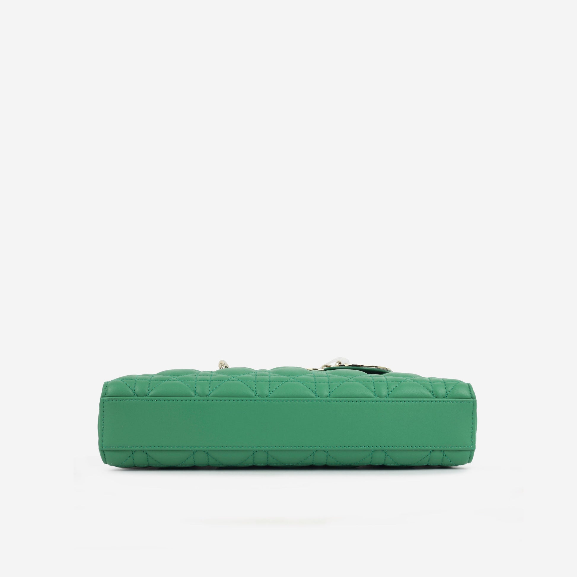 The Lady D-Joy bag effortlessly express the House's unwavering commitment to elegance and refined aesthetics, drawing inspiration from the iconic streamlined design of the renowned Lady Dior line. Crafted with precision from luxurious green lambskin and adorned with meticulous Cannage stitching, this masterpiece exudes a timeless style that is further elevated by the graceful presence of pale gold-finish metal D.I.O.R. charms delicately adorning its silhouette.