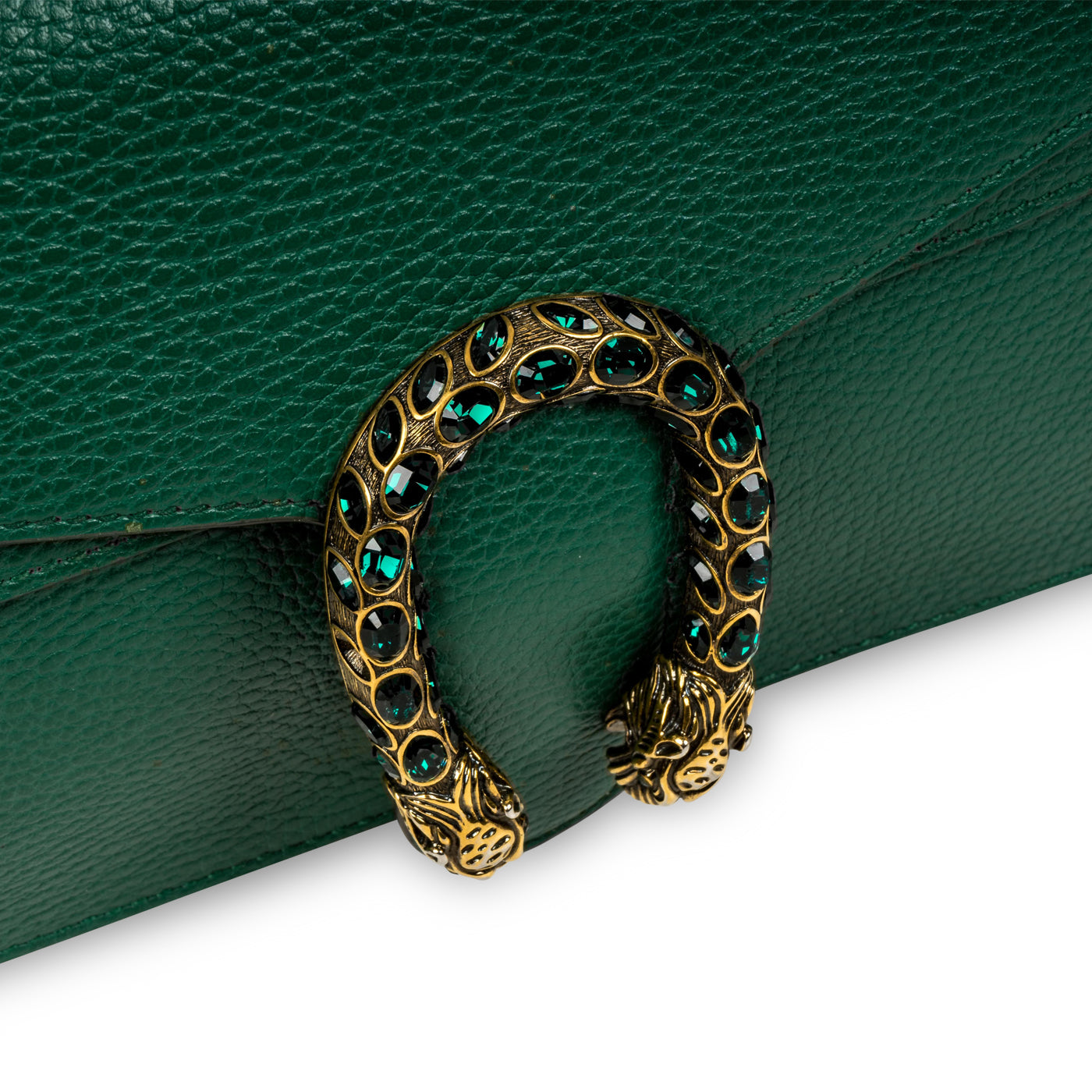 A true statement piece that every woman with an eccentric sense of style needs in her wardrobe. Carefully crafted from green leather, complimented with silver and gold tone hardware and Gucci's classic Dionysus tiger plaque embellished with green gems, this bag is sure to make all heads turn wherever you go. Given its bright colour and unique detailing, this bag is best suited with a monochrome or neutral-toned outfit to further accentuate it. Wear this Dionysus with a pair of simple black trousers and a silk blouse for a dressier look or dress it down with a pair of white jeans and a basic top for a more casual look. Wherever you go and regardless of what you wear this piece with, you'll be sure to have all eyes on you.