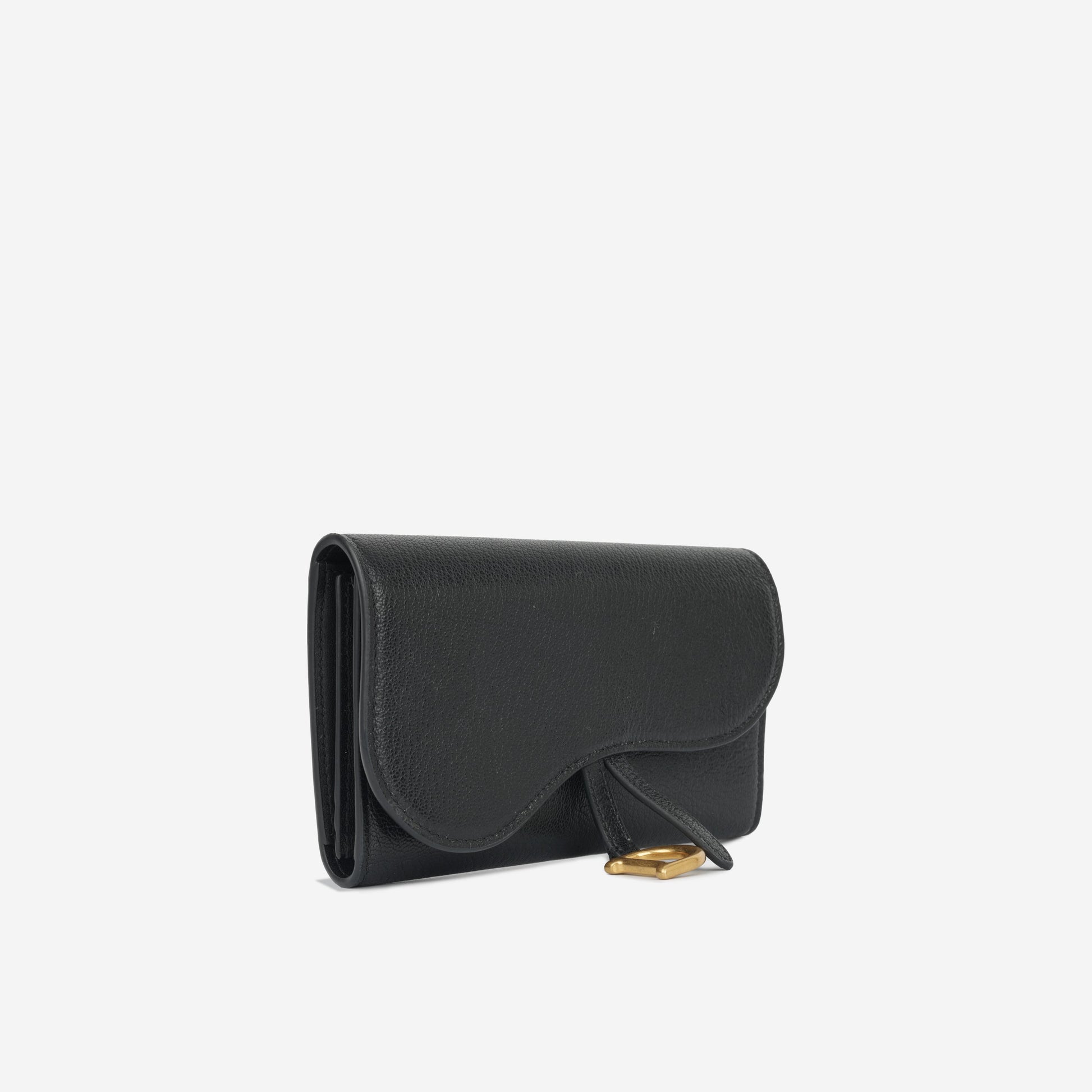 Introducing the Long Saddle Wallet Flap, an exquisite accessory crafted from Black Shiny Goatskin. Adorned with gold-tone hardware, the wallet boasts a distinguished saddle shape flap and features a charming D charm on its leather tag. Secured by a convenient popper closure, this wallet is in immaculate condition, showing minimal signs of use, and exudes timeless elegance.