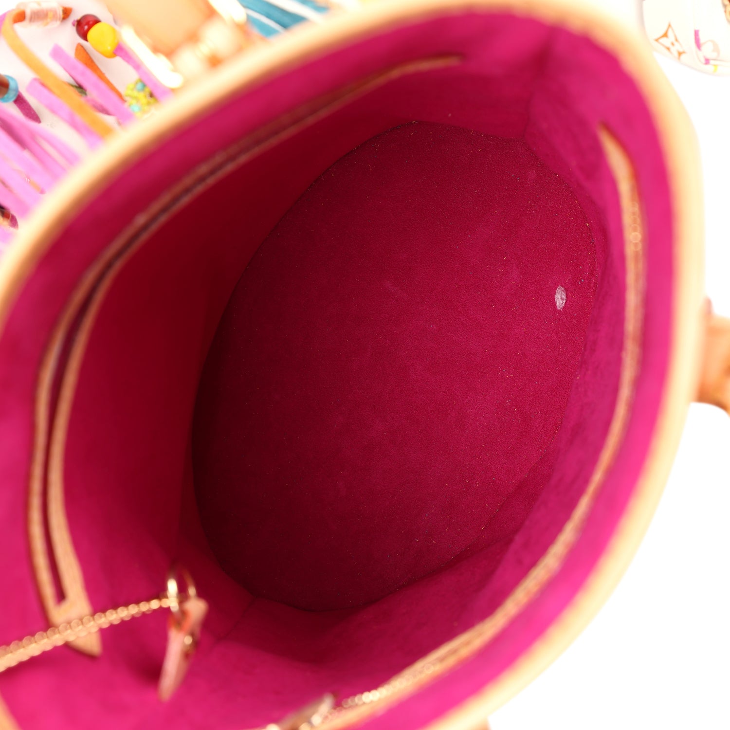This limited edition Fringe Bucket Bag is in multicolor canvas with brass hardware and features contrast stitching, multicolor tassels with beads, white monogram canvas, and beige vachetta leather trim.