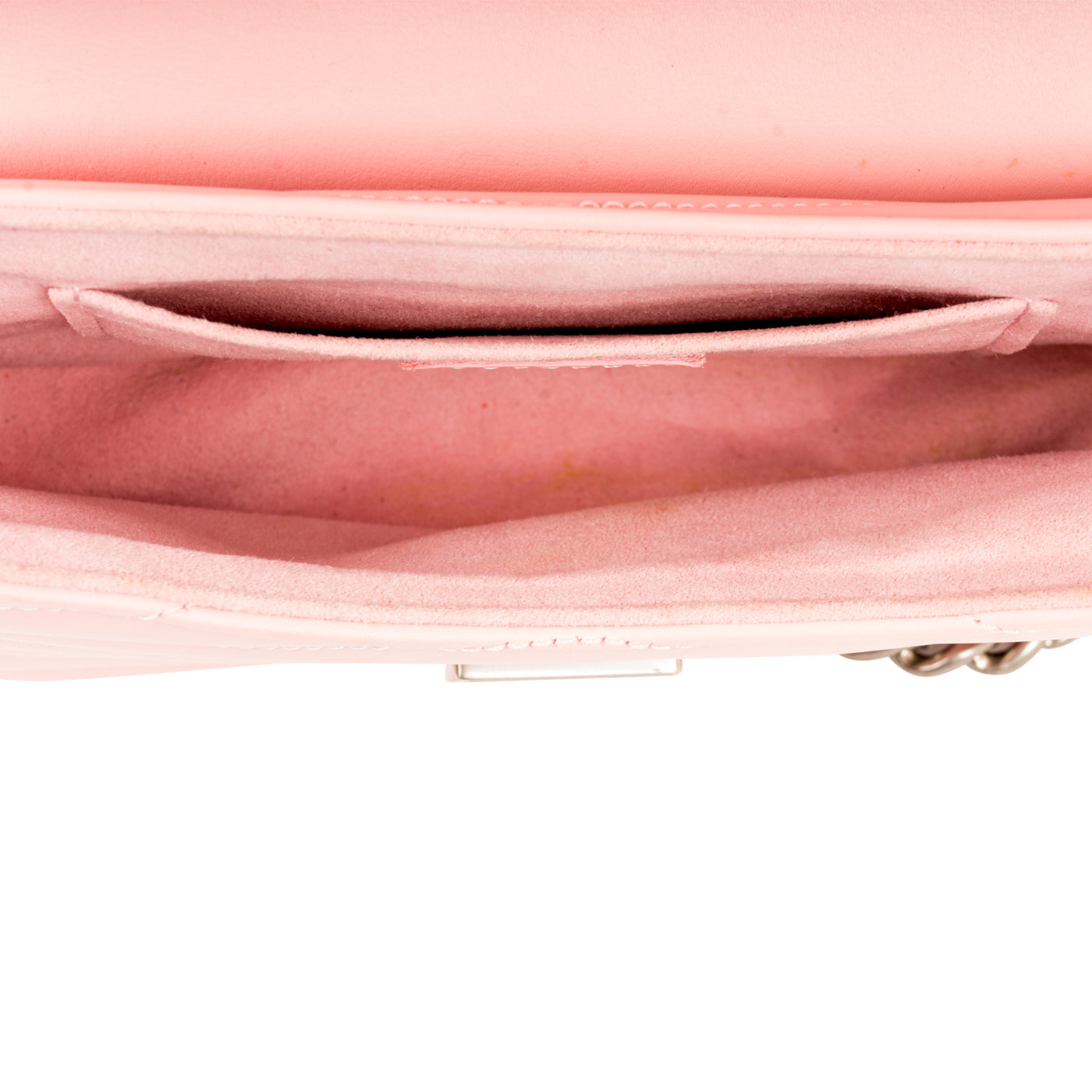 Louis Vuitton presents this New Wave Chain Bag, undeniably a fashion statement piece for your wardrobe, for its seasonal collections. The bag is crafted from smooth quilted rose pink calfskin and features a removable strap with ‘Vuitton’ written on it. To finish the bag is adorned with aged-meta hardware and a sliding chain making the bag adaptable for every situation