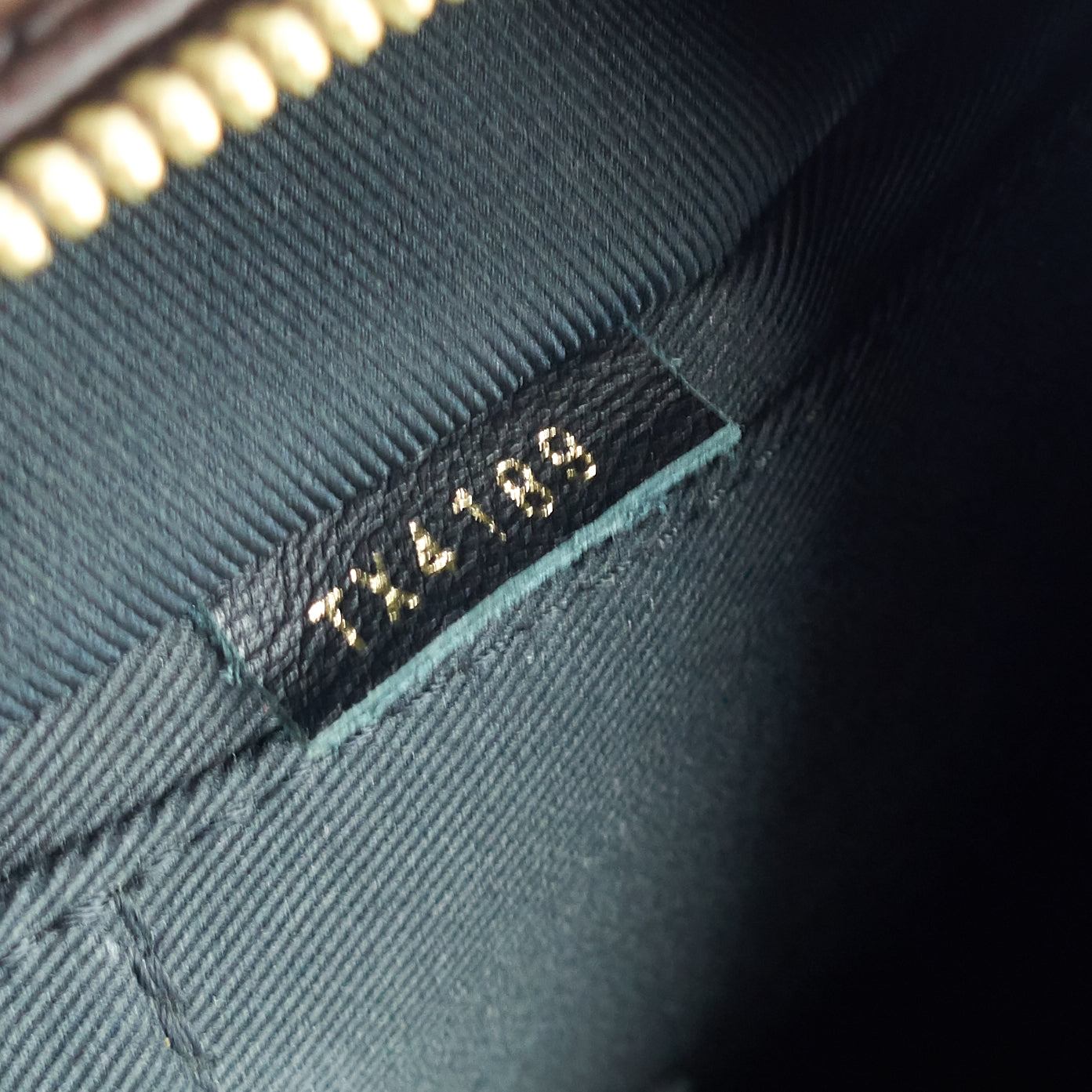 Overall: Both the exterior canvas and the interior textile are in excellent condition, with only a single small scuff to the interior lining. There are slight cracks visible on the leather top handle. One of the leather straps appears to be twisted and curled, while both straps exhibit slight cracking. The zip pulls show light fading.