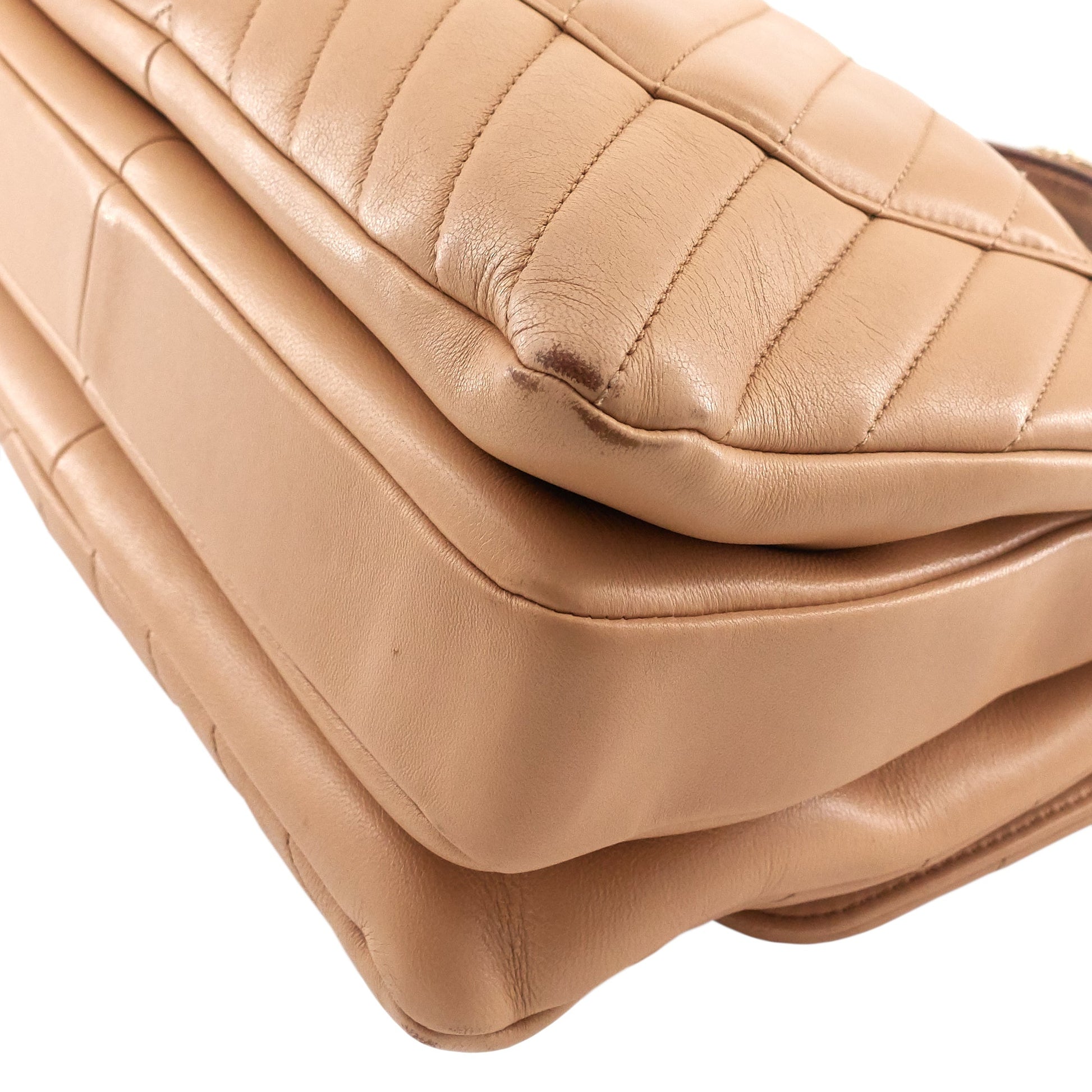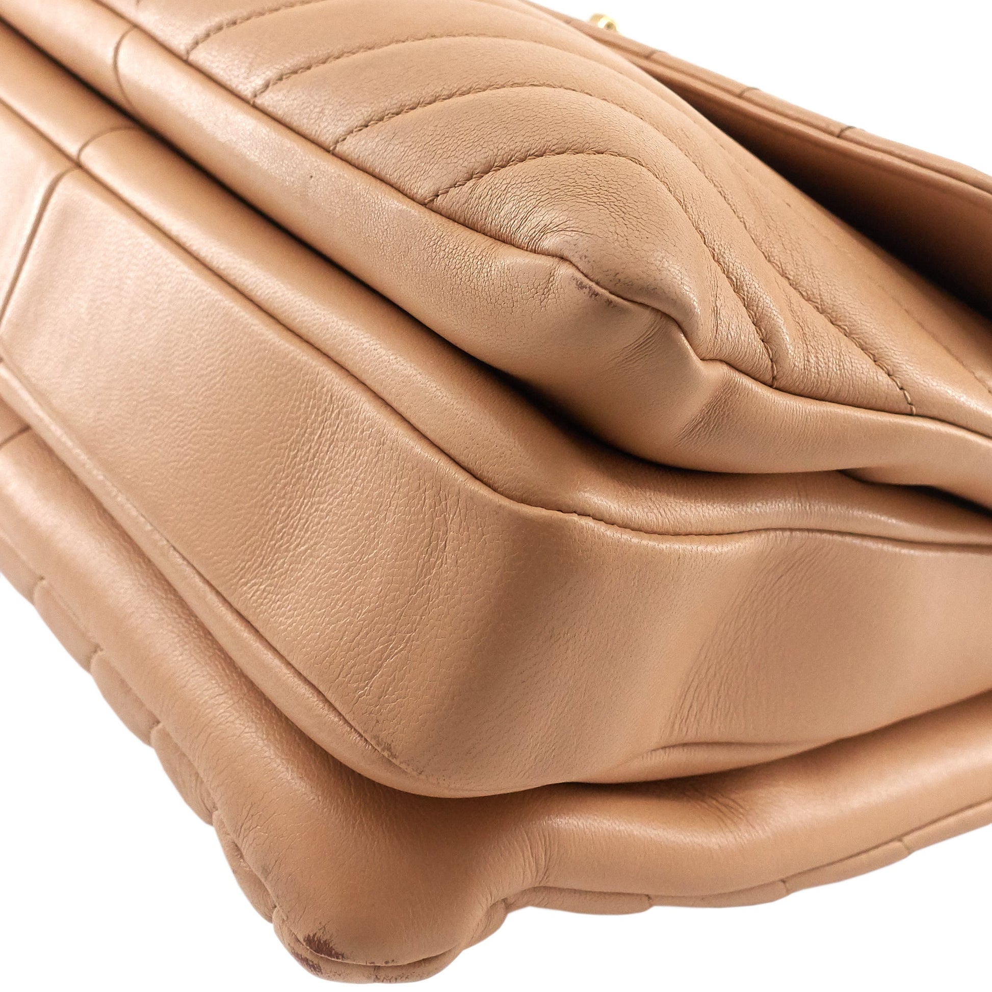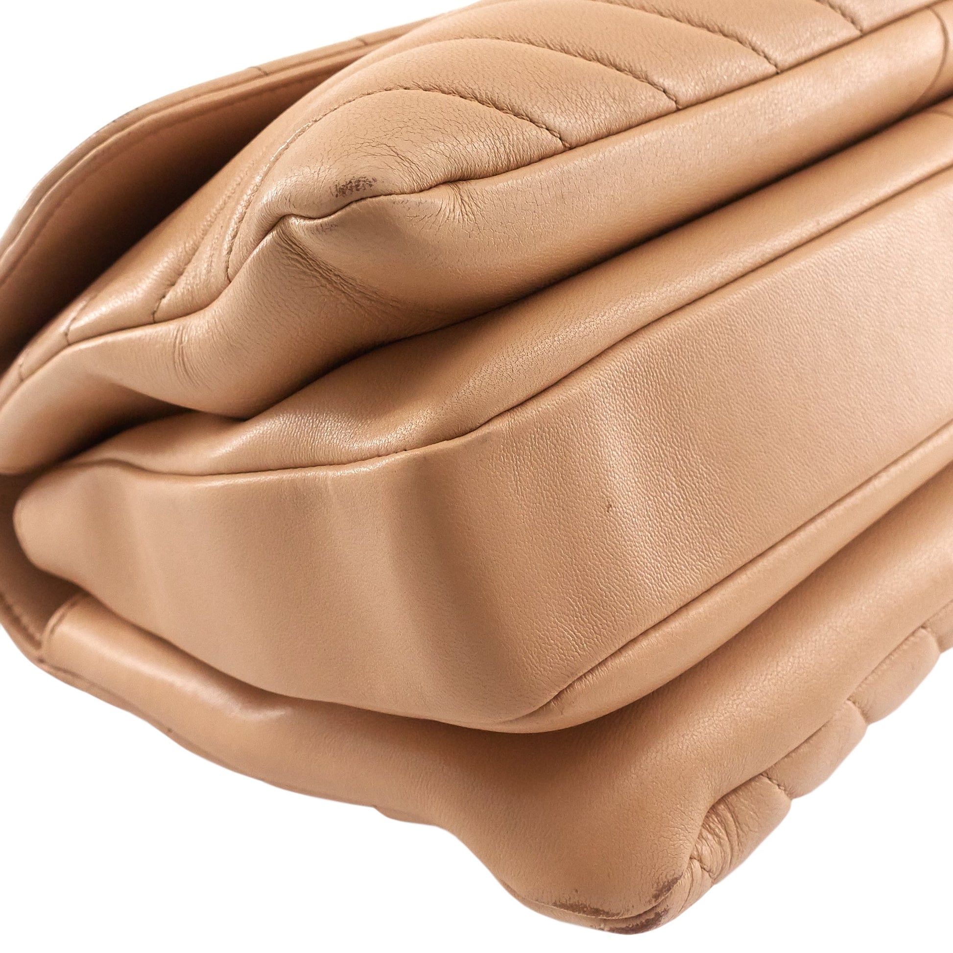 This classic shoulder bag crafted from calfskin leather is textured with puffy chevron quilting and adorned with polished logo hardware. It opens to reveal a well-organized interior with a trio of compartments, and is equipped with both a top handle and non-removable crossbody strap.