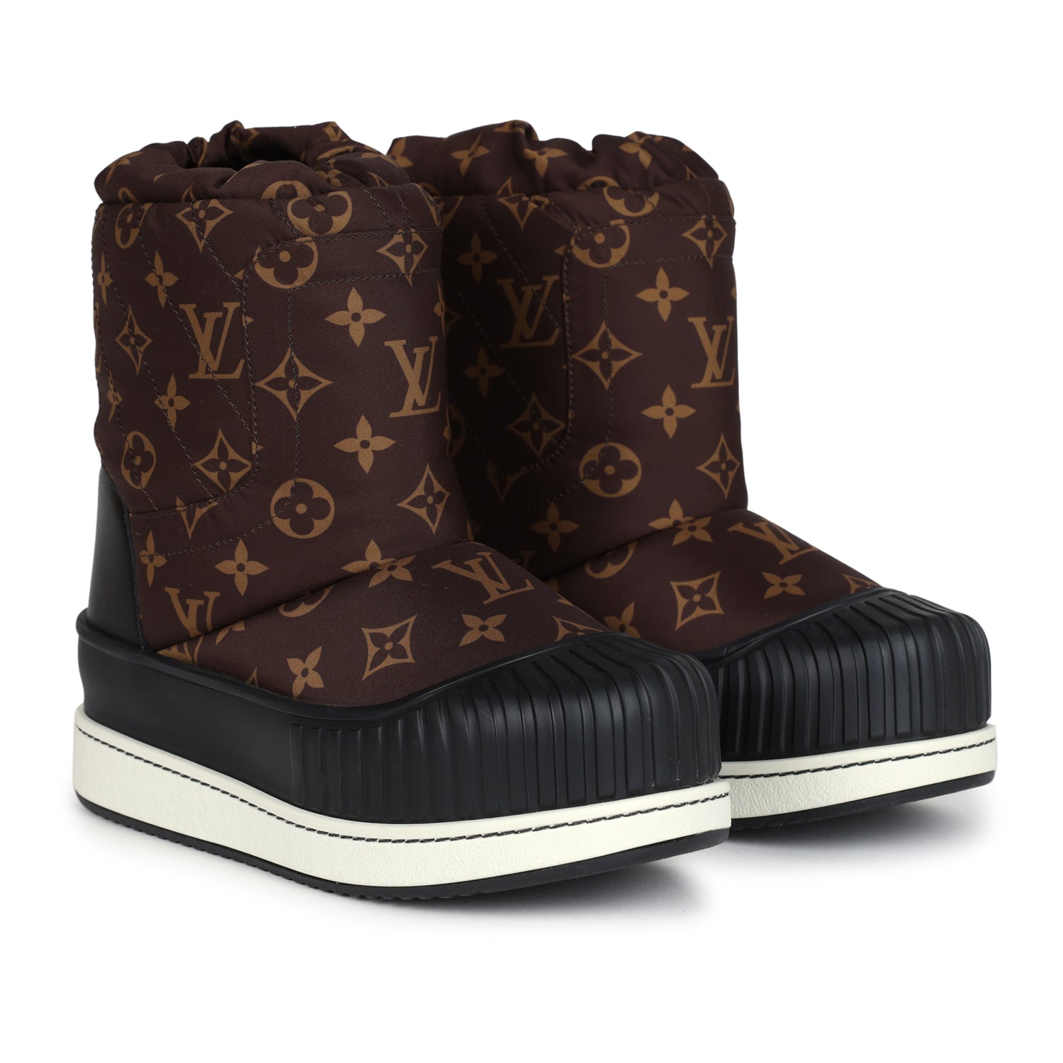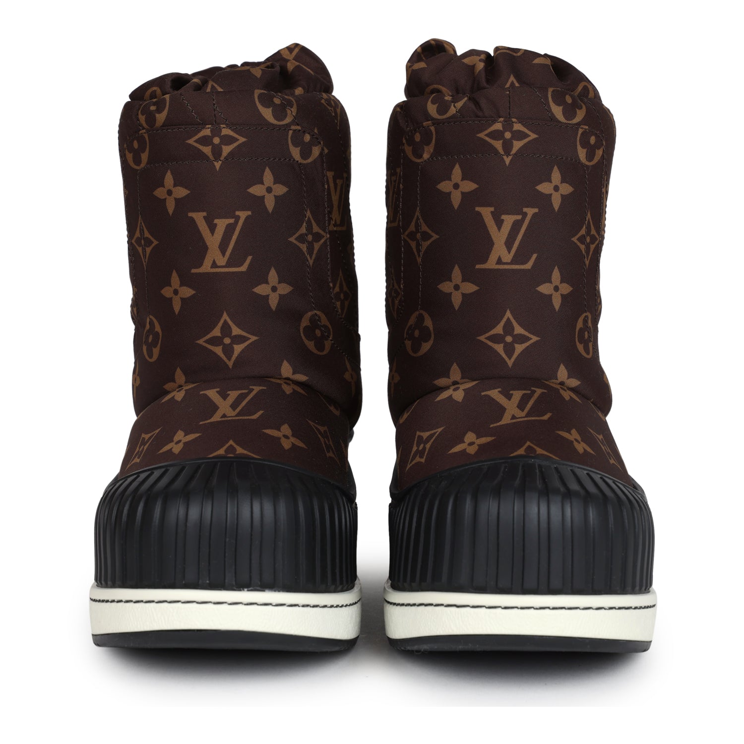 This pair of Louis Vuitton Polar Flat Half Boots are in brown monogram water repellent nylon and rubber, has LV's iconic monogram print, treaded rubber outsole, cotton and leather insole and in a size 36EU.