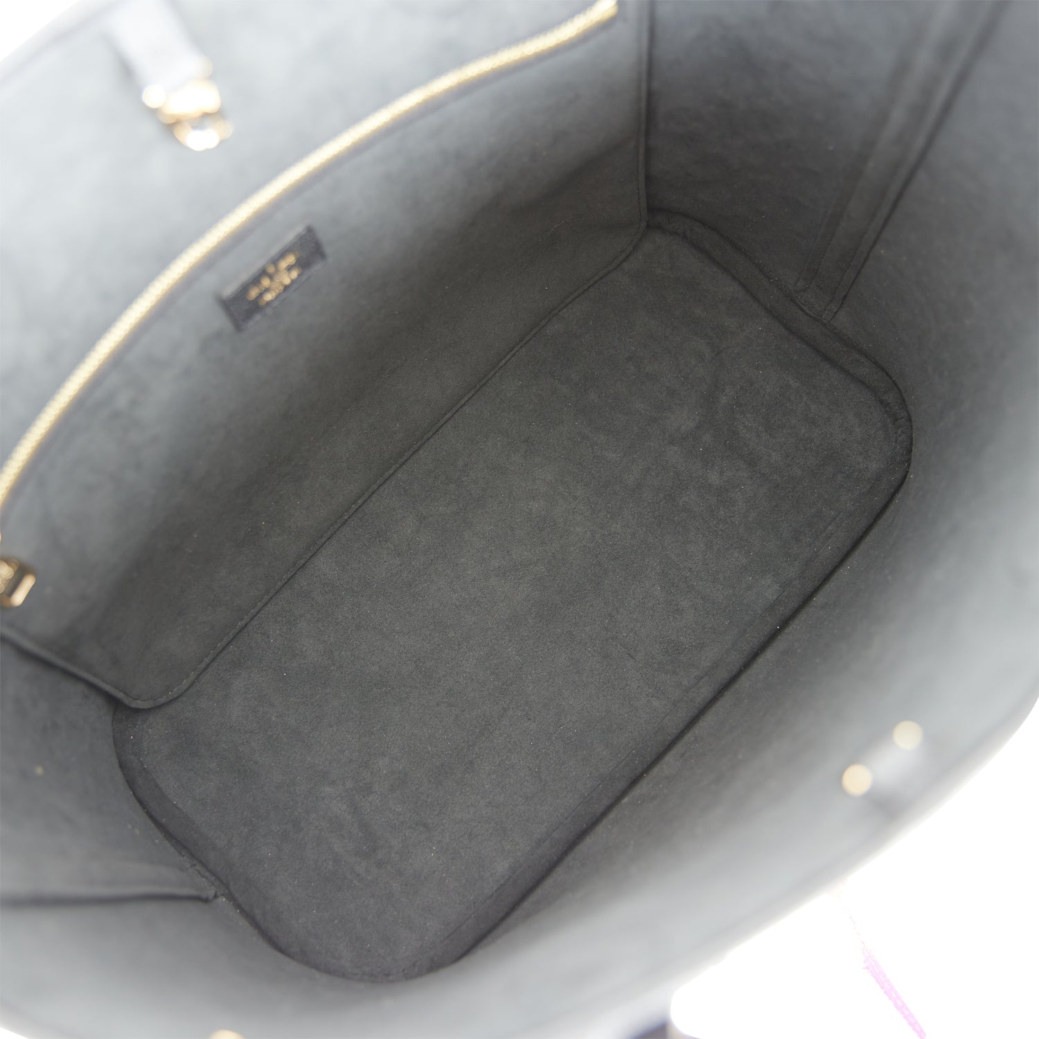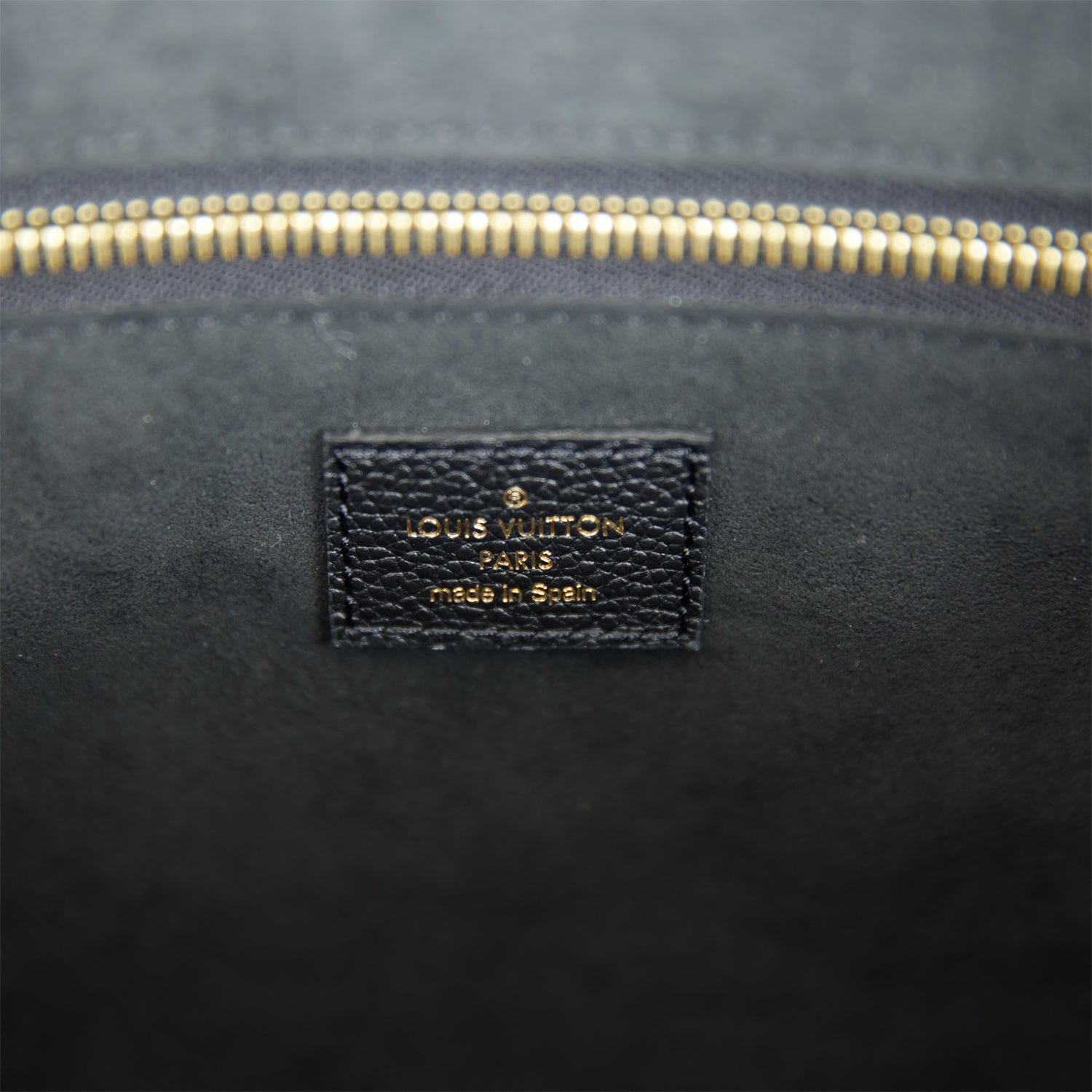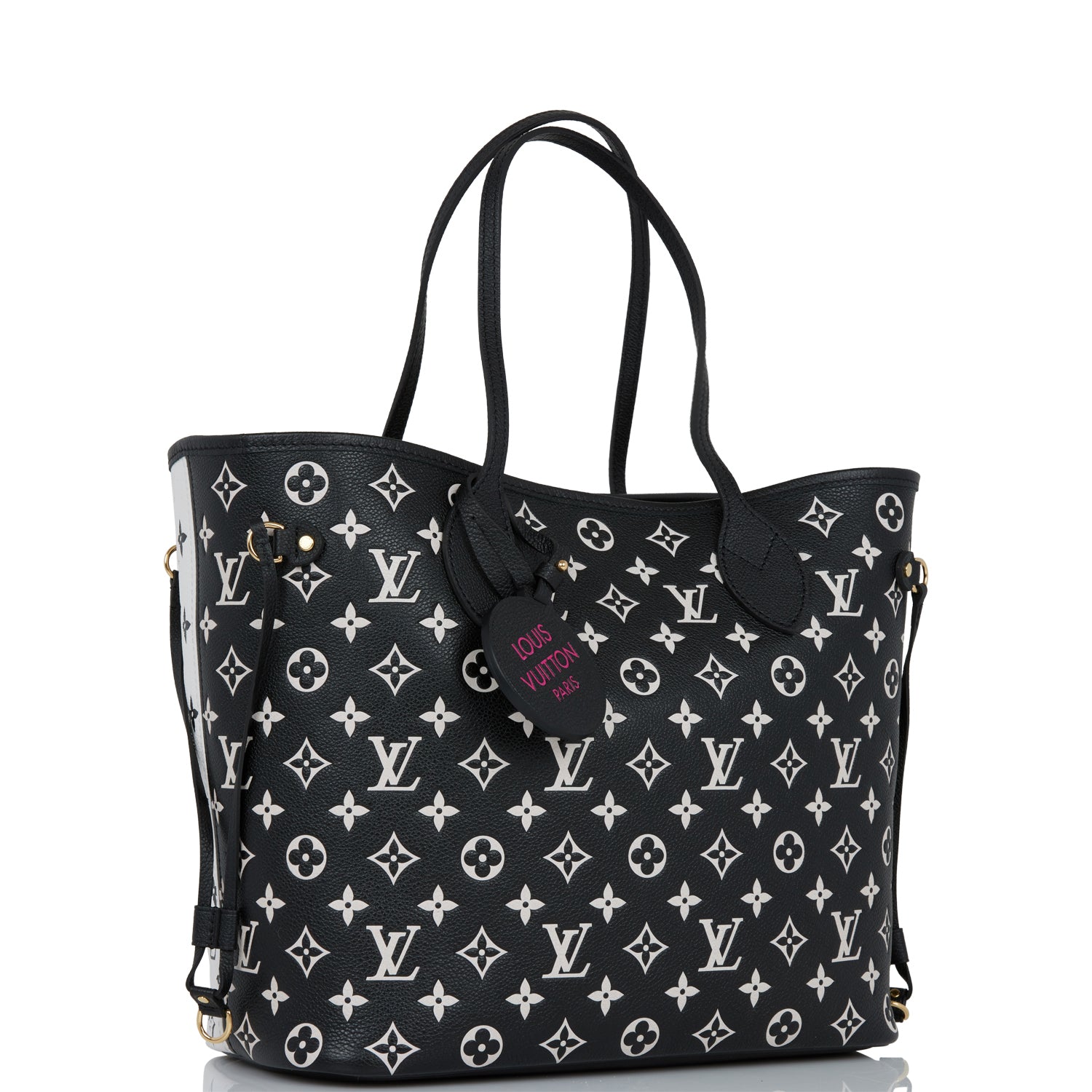 This limited edition "Spring in the City" Neverfull MM tote in black and white empreinte leather with golden tone hardware and features a removable pink pouch, black leather top strap handles, trim and side cinch cords with polished gold tone hardware and hidden top hook closure.