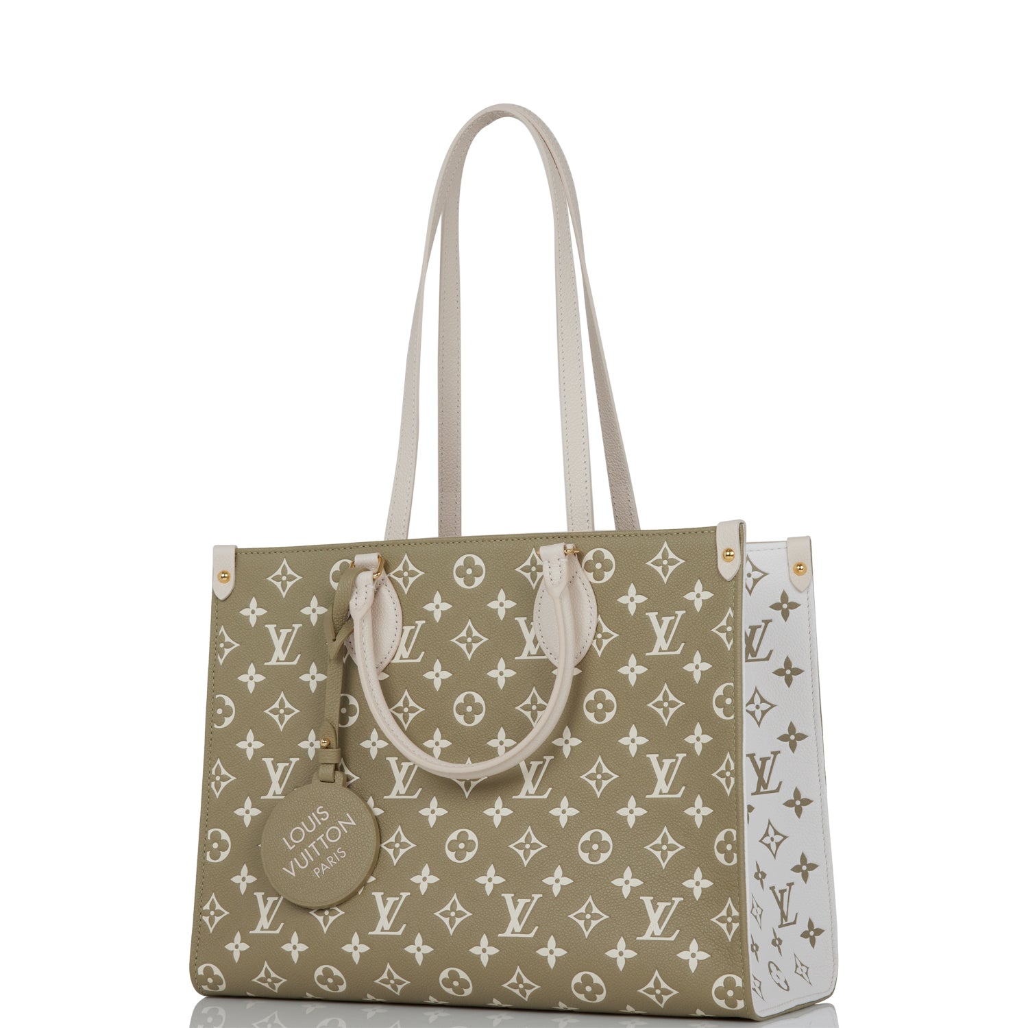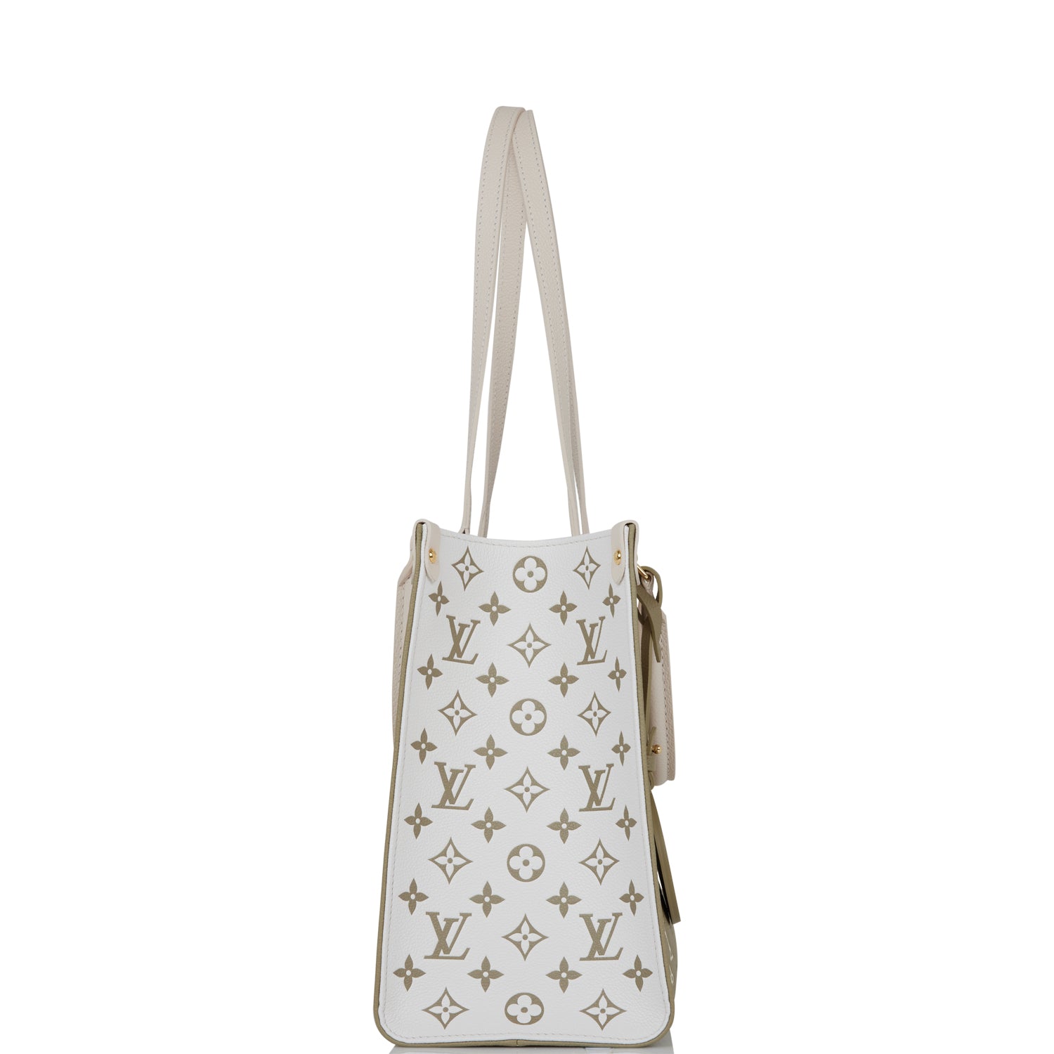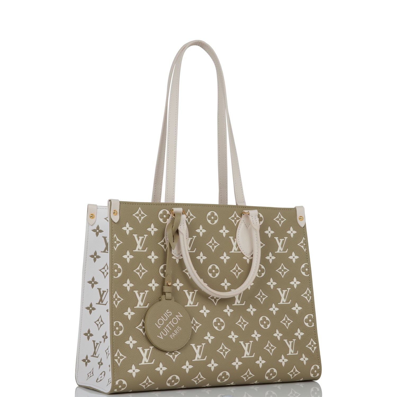 This OnTheGo tote is of khaki and beige empreinte calfskin leather with polished brass hardware and features monogram print, contrasting sides, white leather top handles, trim and hidden interior shoulder straps with polished gold tone hardware and hidden top hook closure.