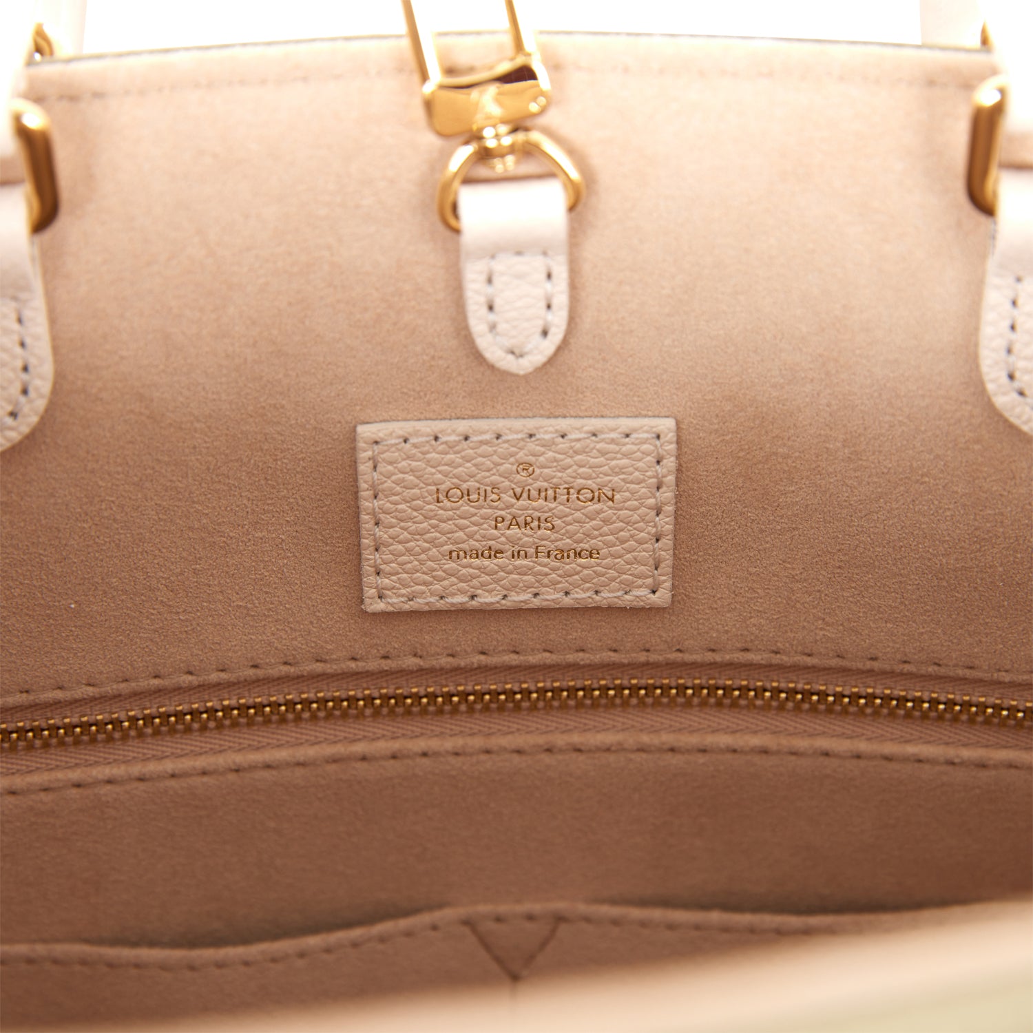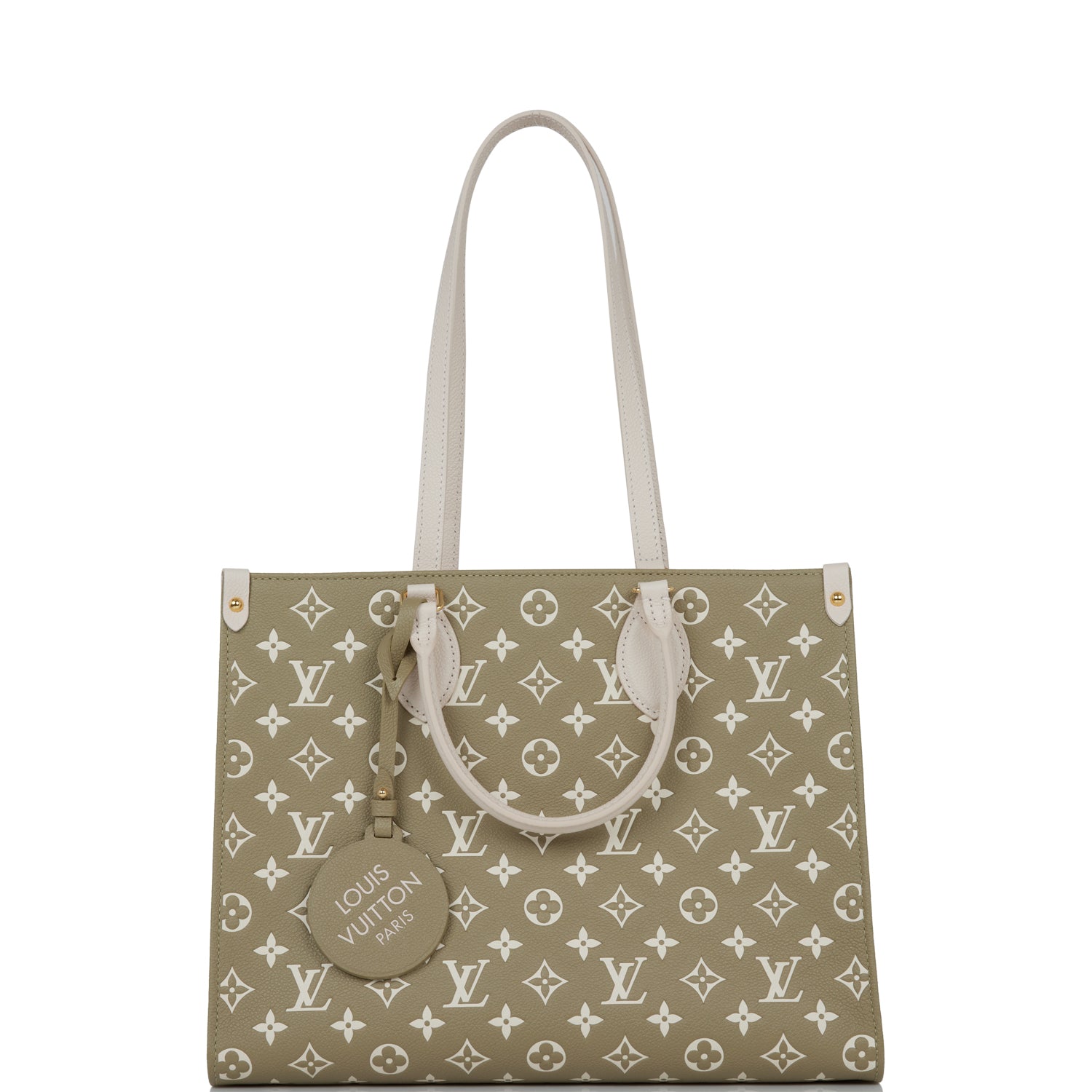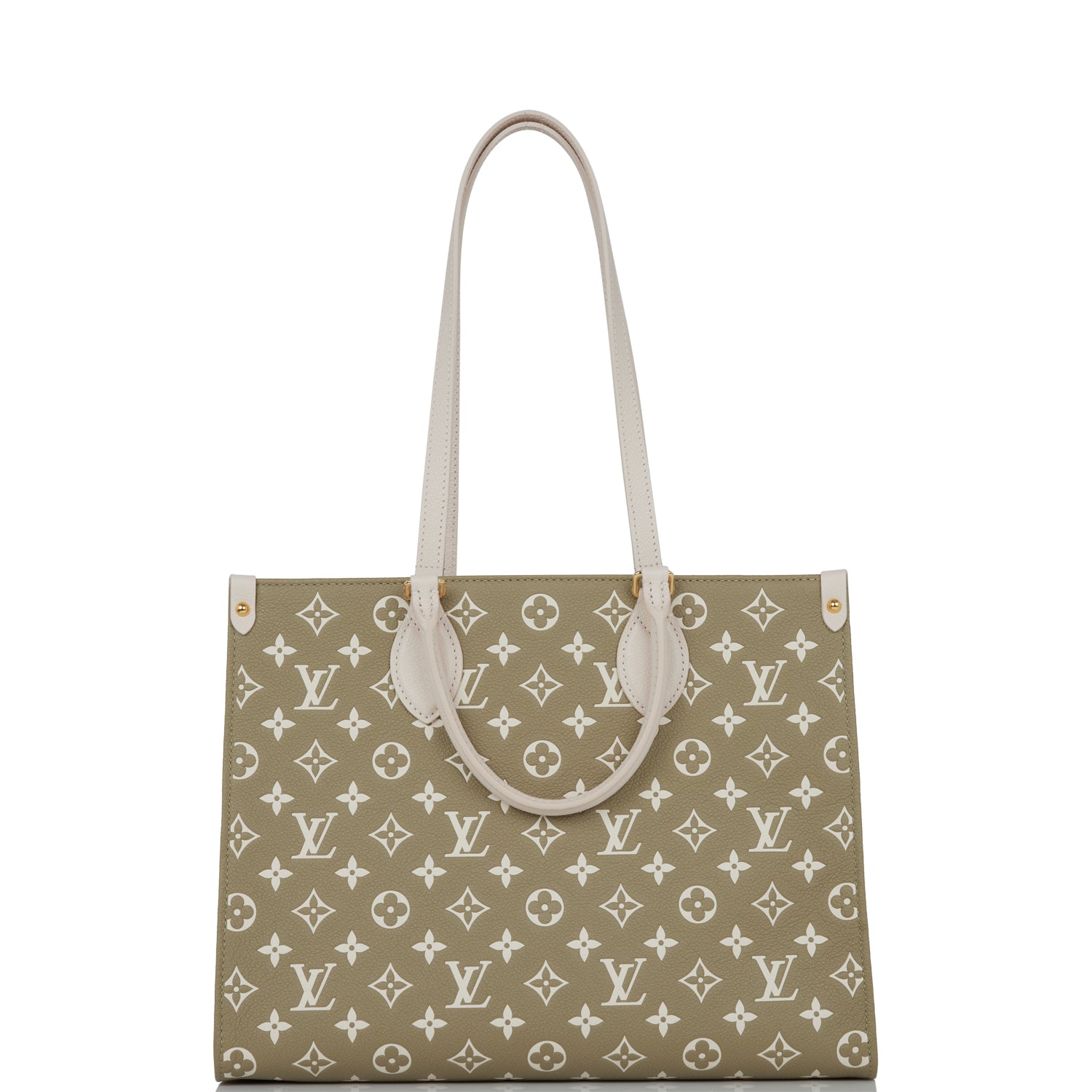 This OnTheGo tote is of khaki and beige empreinte calfskin leather with polished brass hardware and features monogram print, contrasting sides, white leather top handles, trim and hidden interior shoulder straps with polished gold tone hardware and hidden top hook closure.