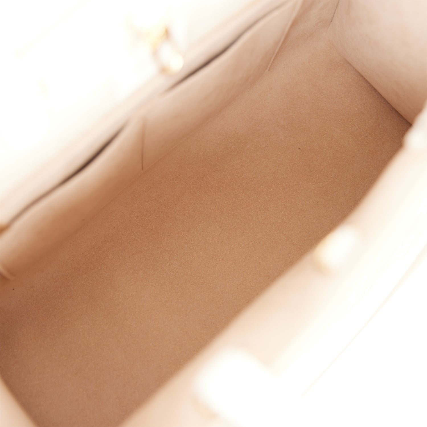 The interior is lined in beige microfiber has a single zipper close pocket and two slip pockets.