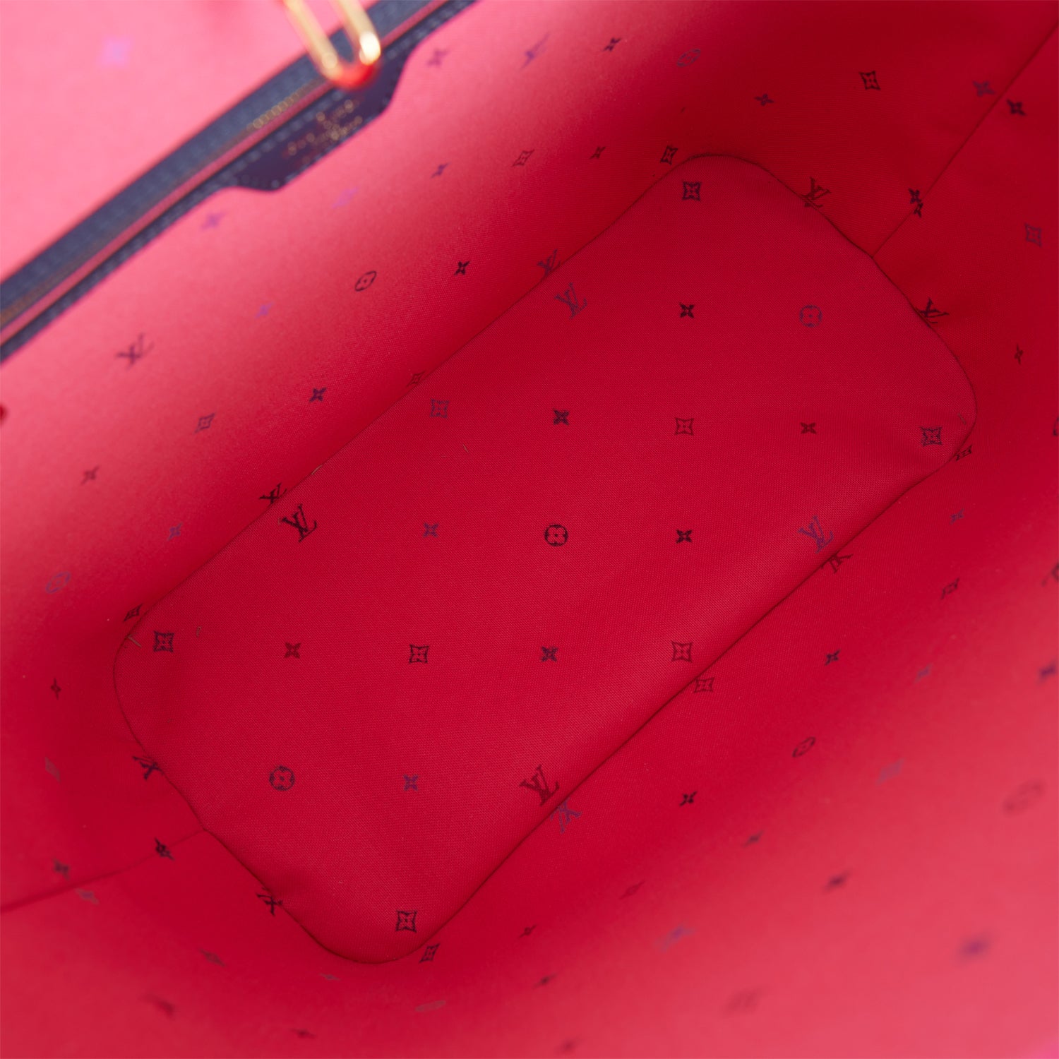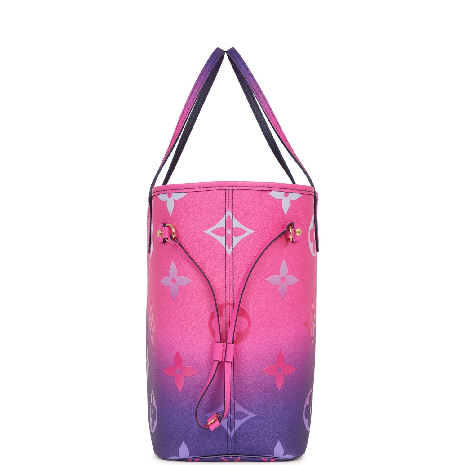 This limited edition "Spring in the City" Neverfull MM tote in midnight fuchsia monogram canvas with golden tone hardware and features a removable pouch, top strap handles, trim and side cinch cords with polished gold tone hardware and hidden top hook closure.