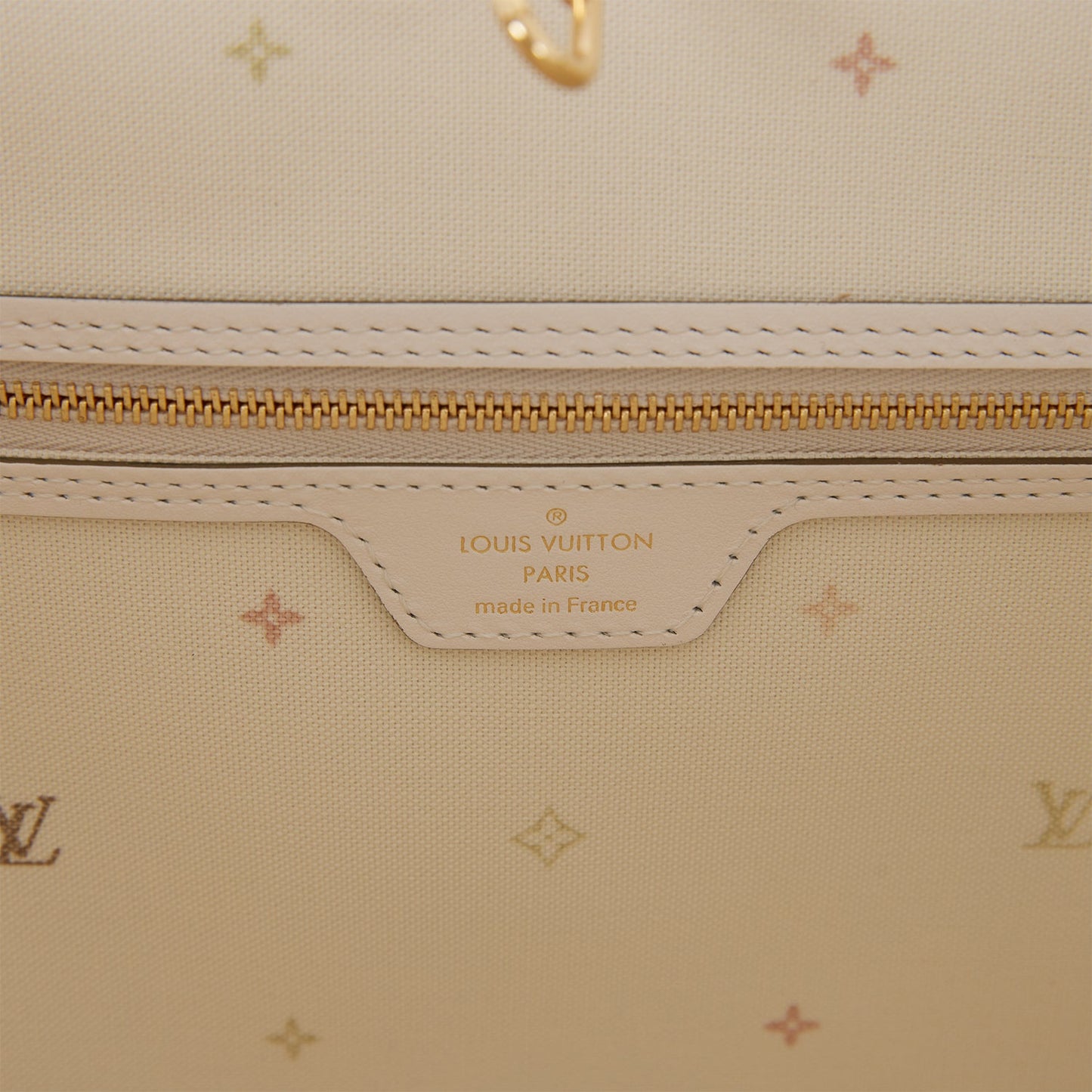 This limited edition "Spring in the City" Neverfull MM tote in sunset monogram canvas with golden tone hardware and features a removable pouch, top strap handles, trim and side cinch cords with polished gold tone hardware and hidden top hook closure.
