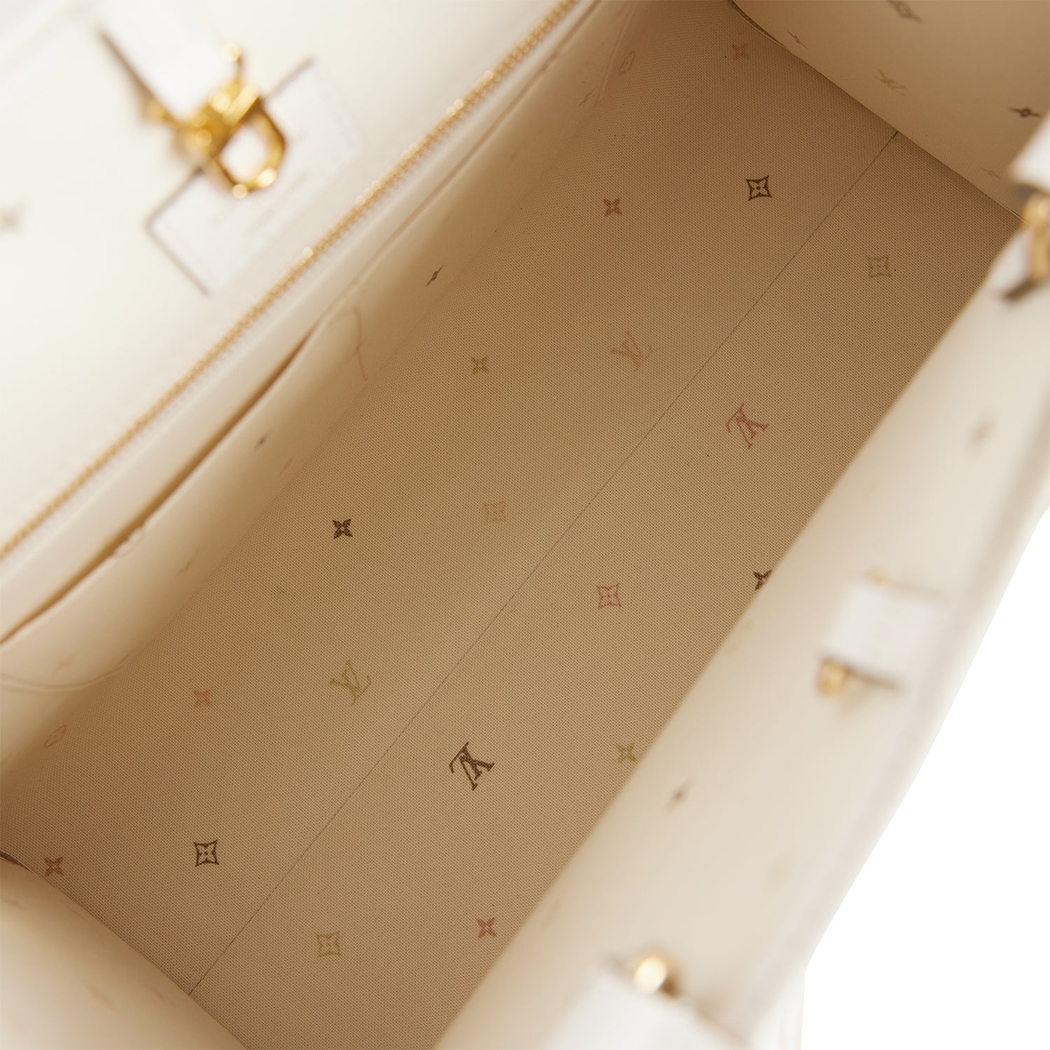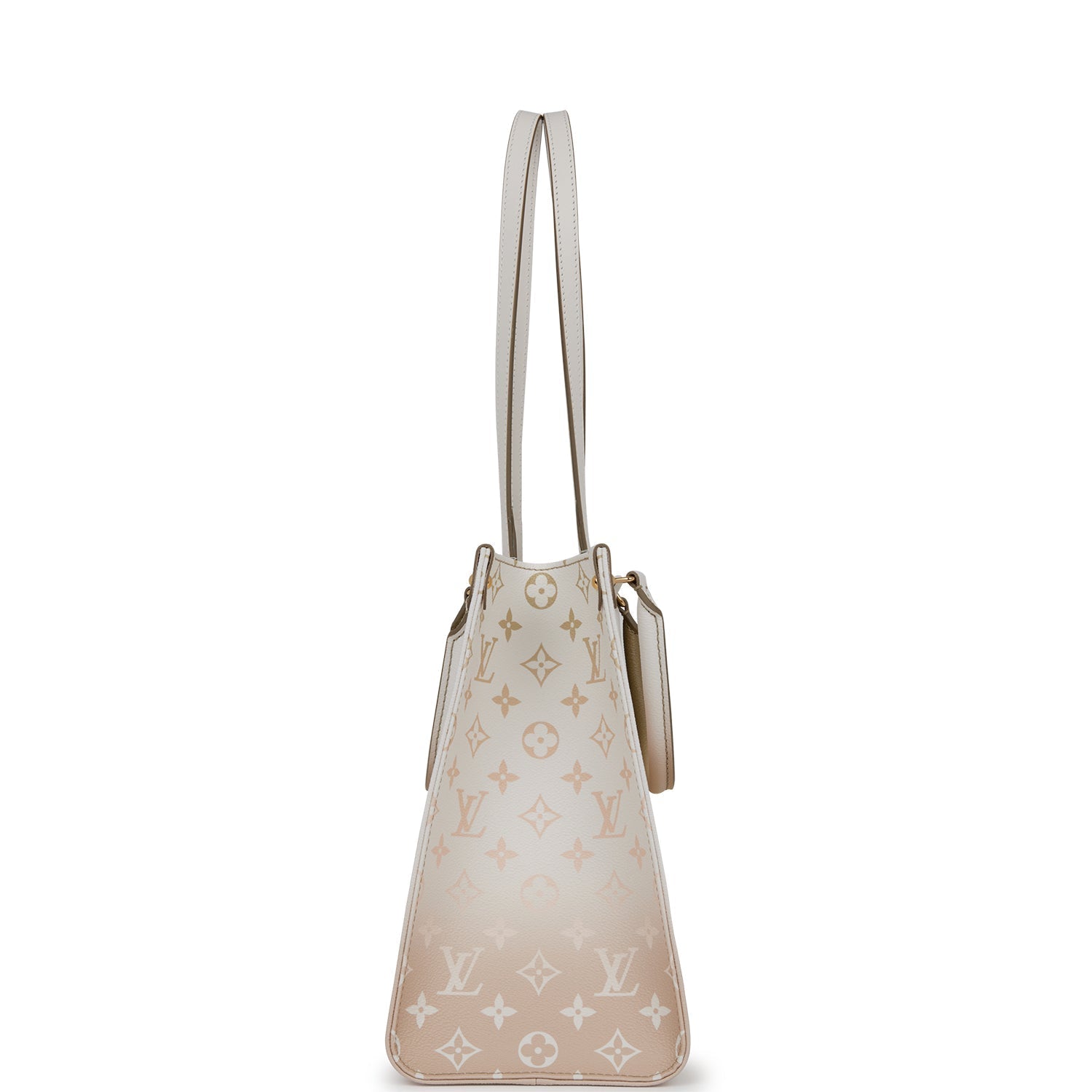 This OnTheGo tote is of sunset monogram canvas with polished brass hardware and features gradient monogram print, top handles, trim and white leather hidden interior shoulder straps with polished gold tone hardware and hidden top hook closure.