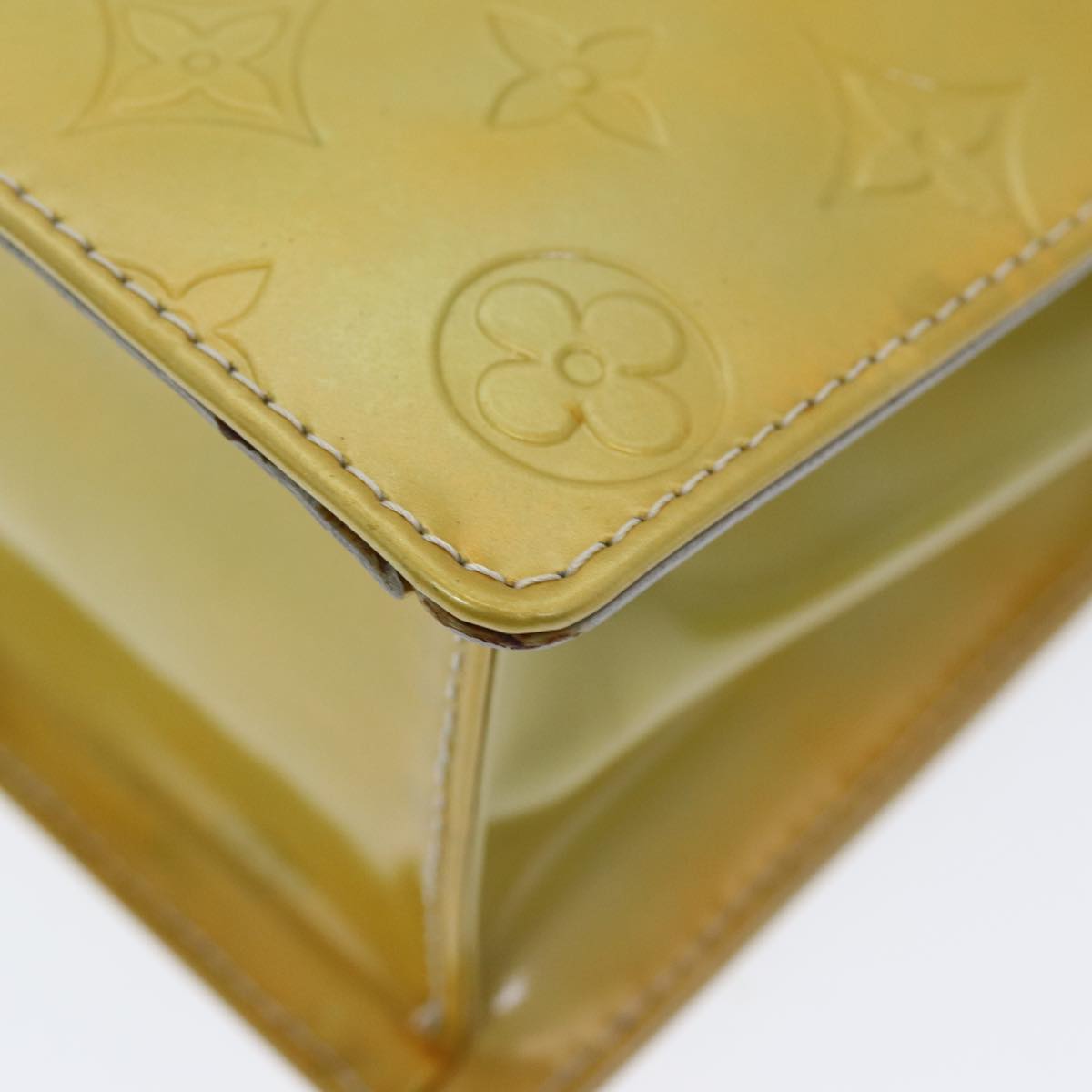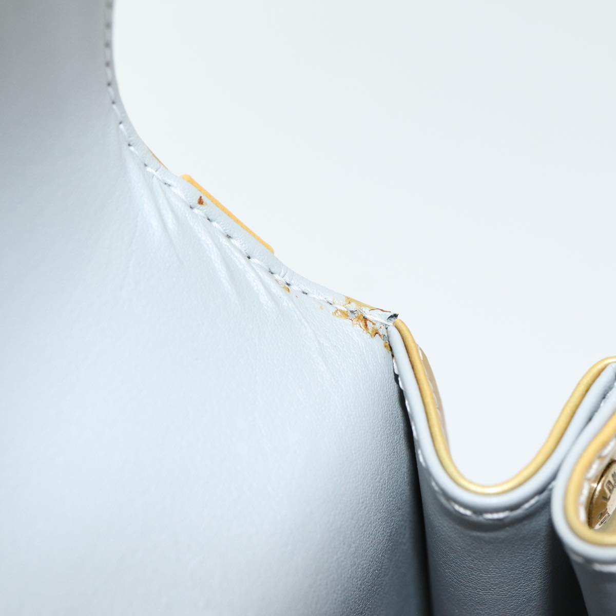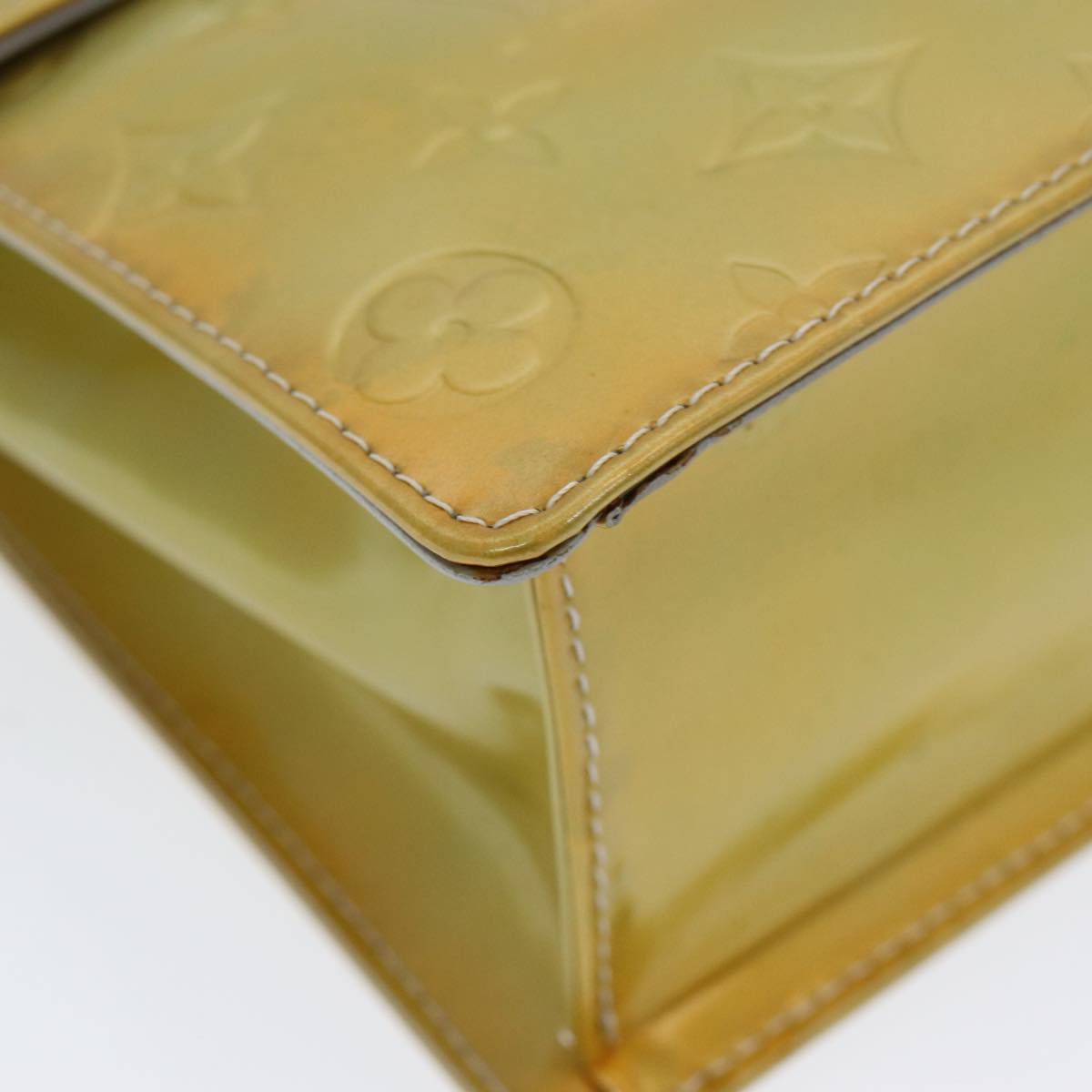 The exterior shows rubbing, sunburn, discoloration, and slight loss of shape. The handle has sunburn and slight rubbing. The metal fittings have minor scratches. Inside, there is rubbing and slight peeling. The corners also exhibit rubbing, and the bag has a noticeable storage smell.