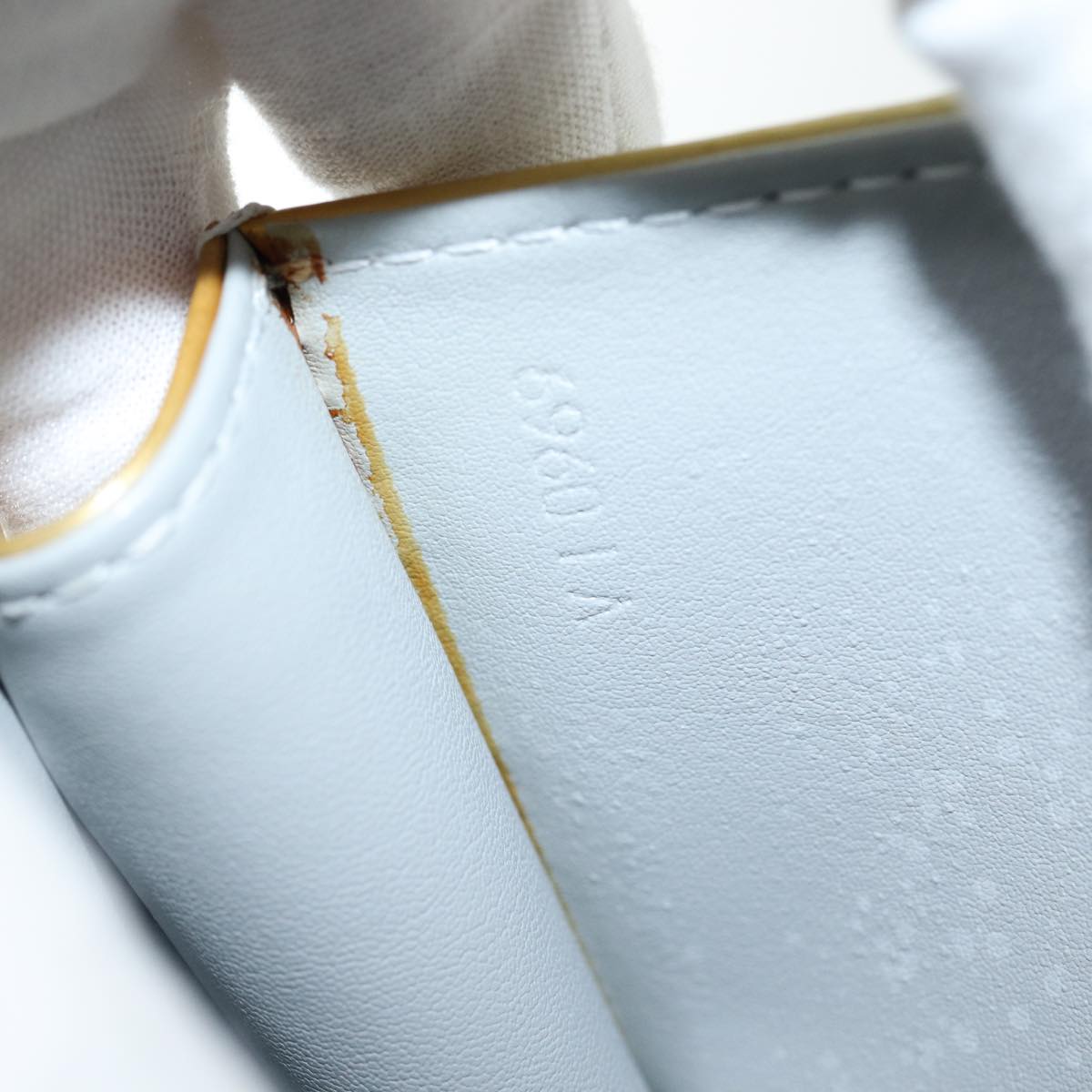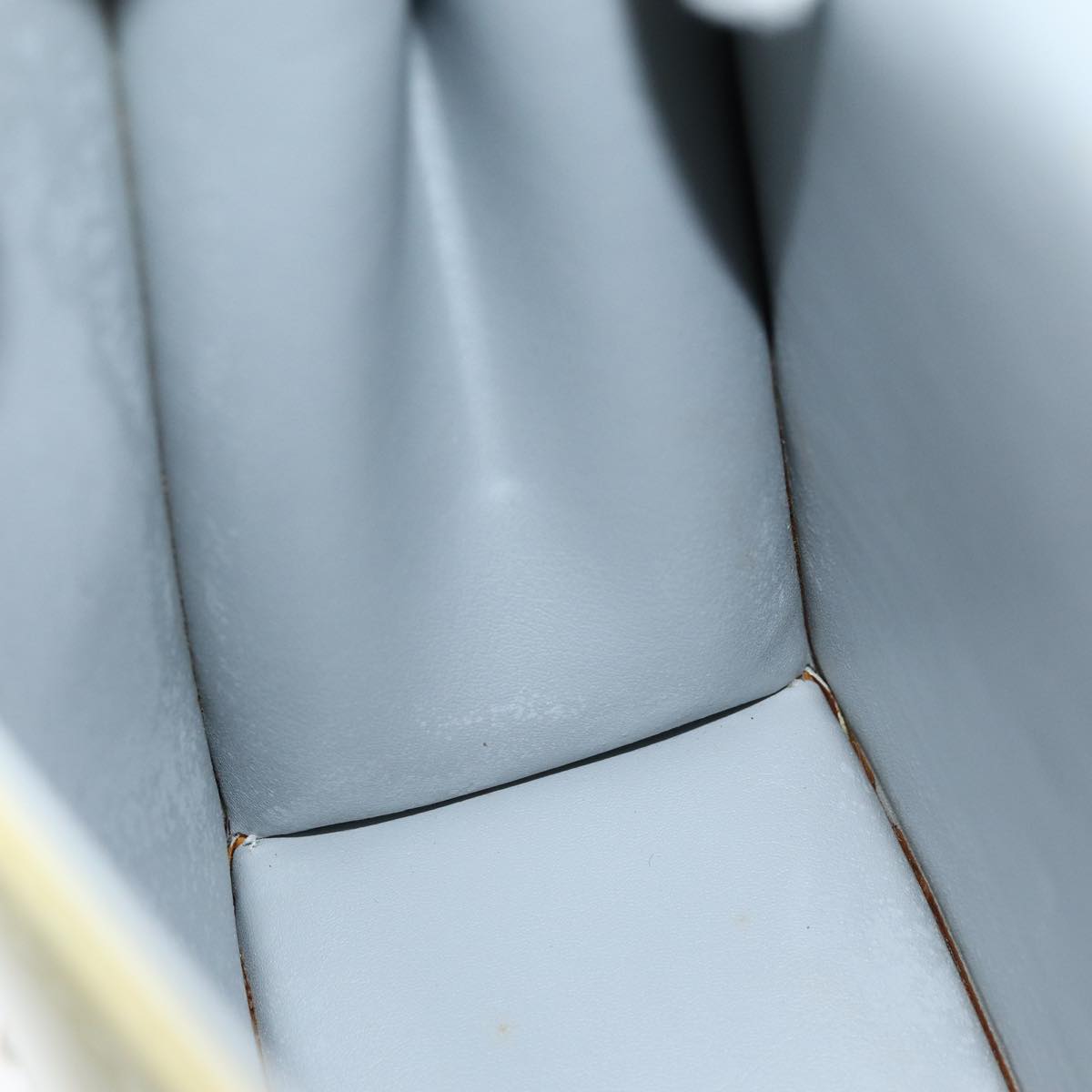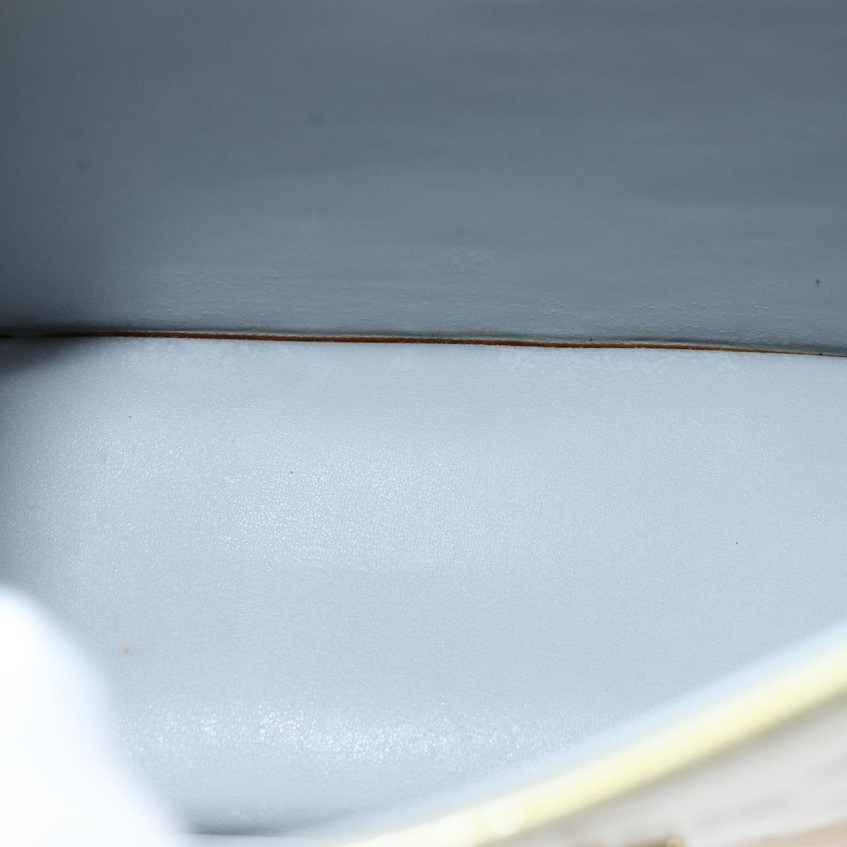The exterior shows rubbing, sunburn, discoloration, and slight loss of shape. The handle has sunburn and slight rubbing. The metal fittings have minor scratches. Inside, there is rubbing and slight peeling. The corners also exhibit rubbing, and the bag has a noticeable storage smell.