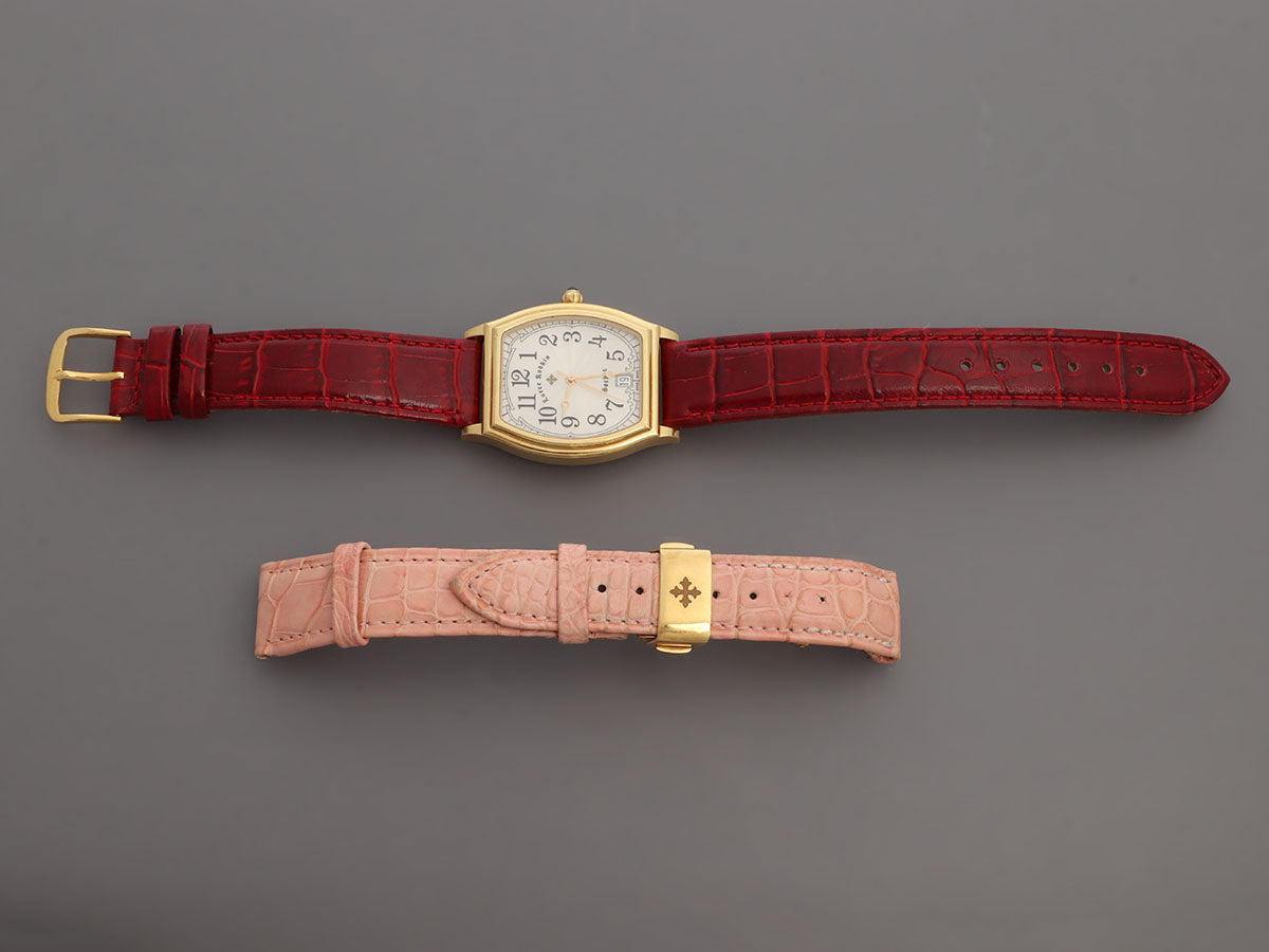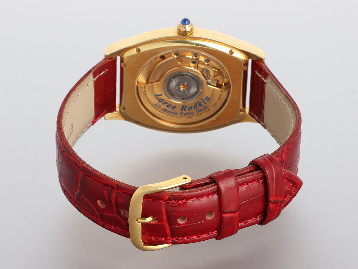 This Loree Rodkin 18K Yellow Gold Gothic Classic Watch is a Swiss-made automatic with a date window at the 6 o’clock position! It has a tonneau-shaped case, the French word for barrel, and a head that measures 33 millimeters by 34 millimeters. The dial has Arabic numerals and hands in gold and a sapphire winder. In very good condition, it has some scratches on the metal. This larger-sized LR watch has a clasp that is not gold and comes with one pink alligator LR strap, and a red embossed-leather strap that is not LR so you can change things up a bit!