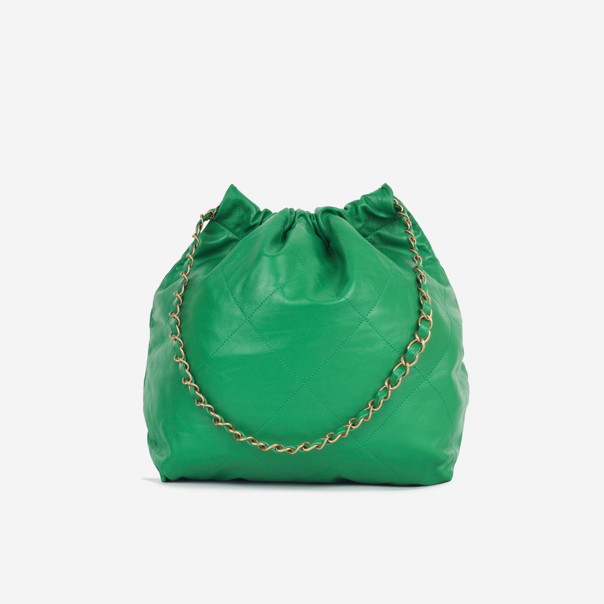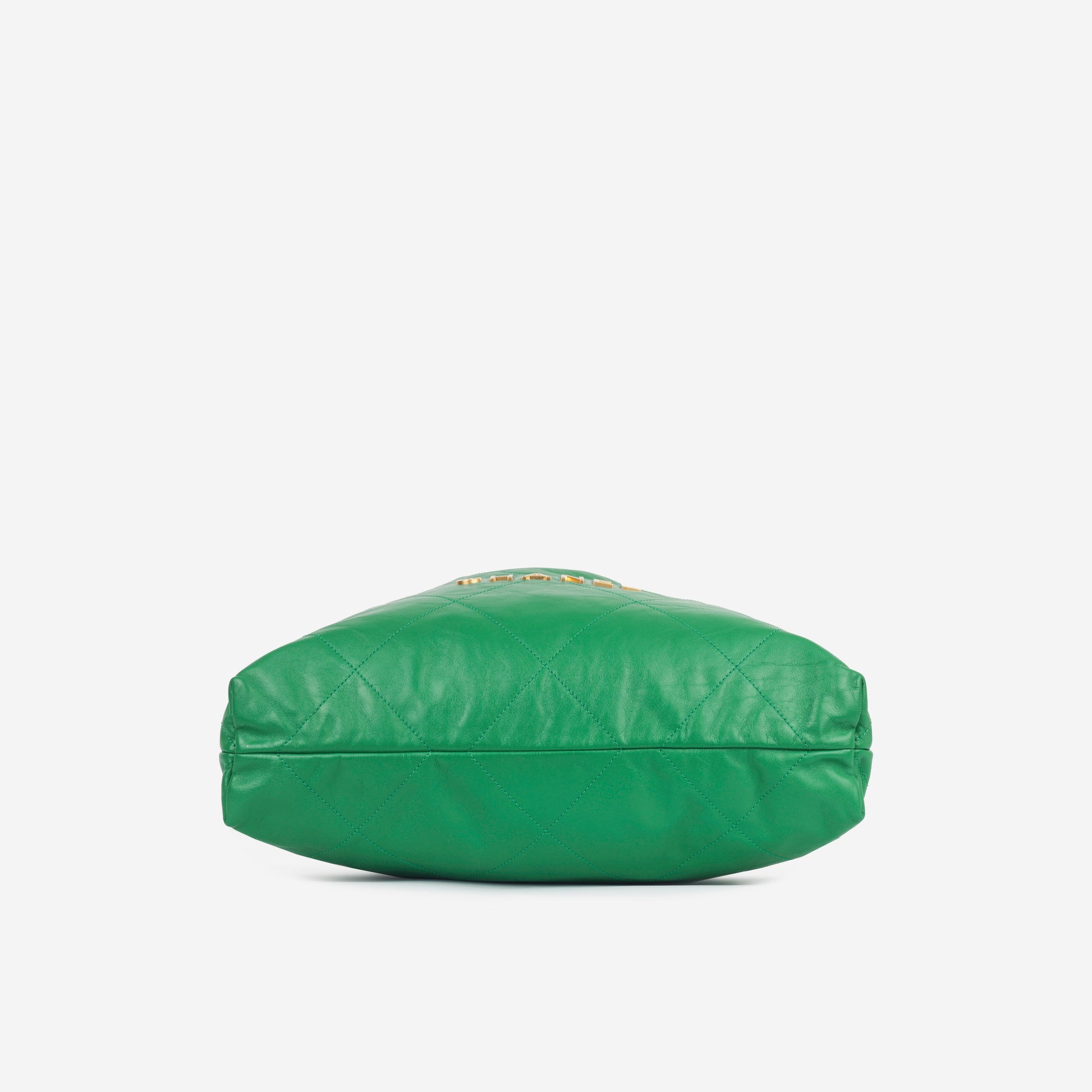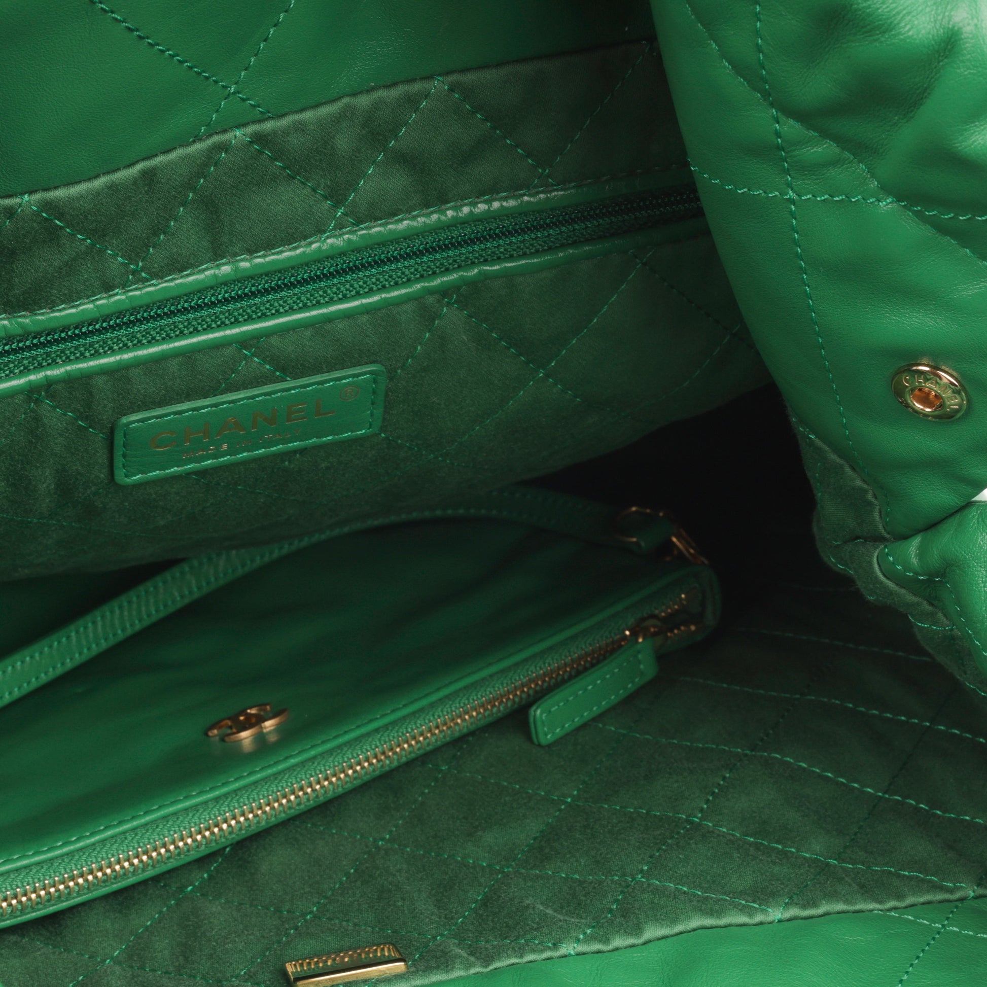 Carefully crafted from green quilted shiny calfskin leather, Chanel presents their 22 Tote bag. The chicest item for the lady that wants to carry everything around with them, this bag features Chanels classic interwoven back straps along with top handles to carry it handheld. This piece from 2022 is a well worthy addition to any luxury handbag collection.
