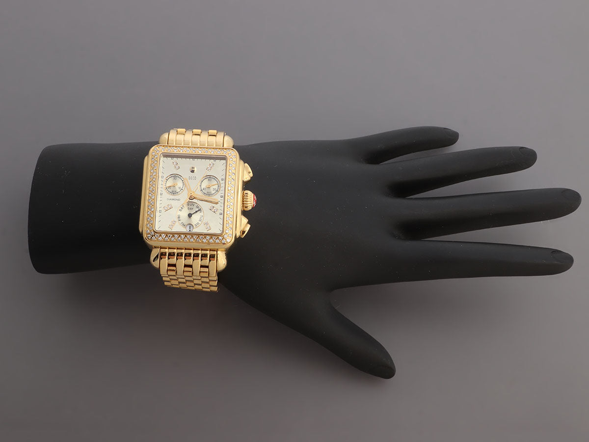 Michele’s Two-Tone Diamond Deco High Shine Watch 33mm is a limited-edition stunner! Made of stainless steel and gold-tone metal, it has a total of 0.66 carat of white diamonds prong-set in the bezel and in six of the hour markers and a shiny gold face. It has three subdials, a date window, and a deployment clasp. In good condition, it comes with a box and links and has scratches on the metal. This Swiss-made quartz chronograph is numbered 299 of 400!