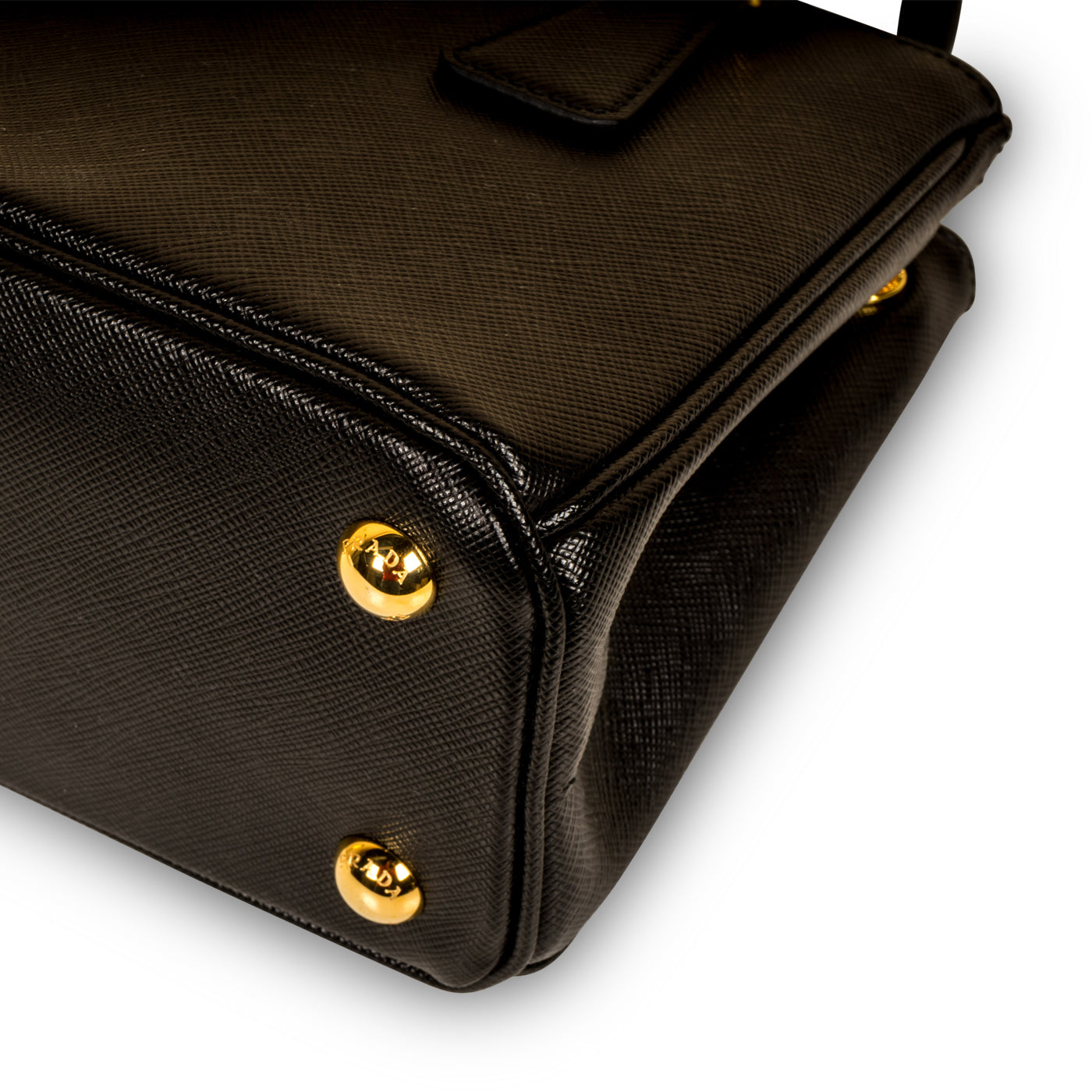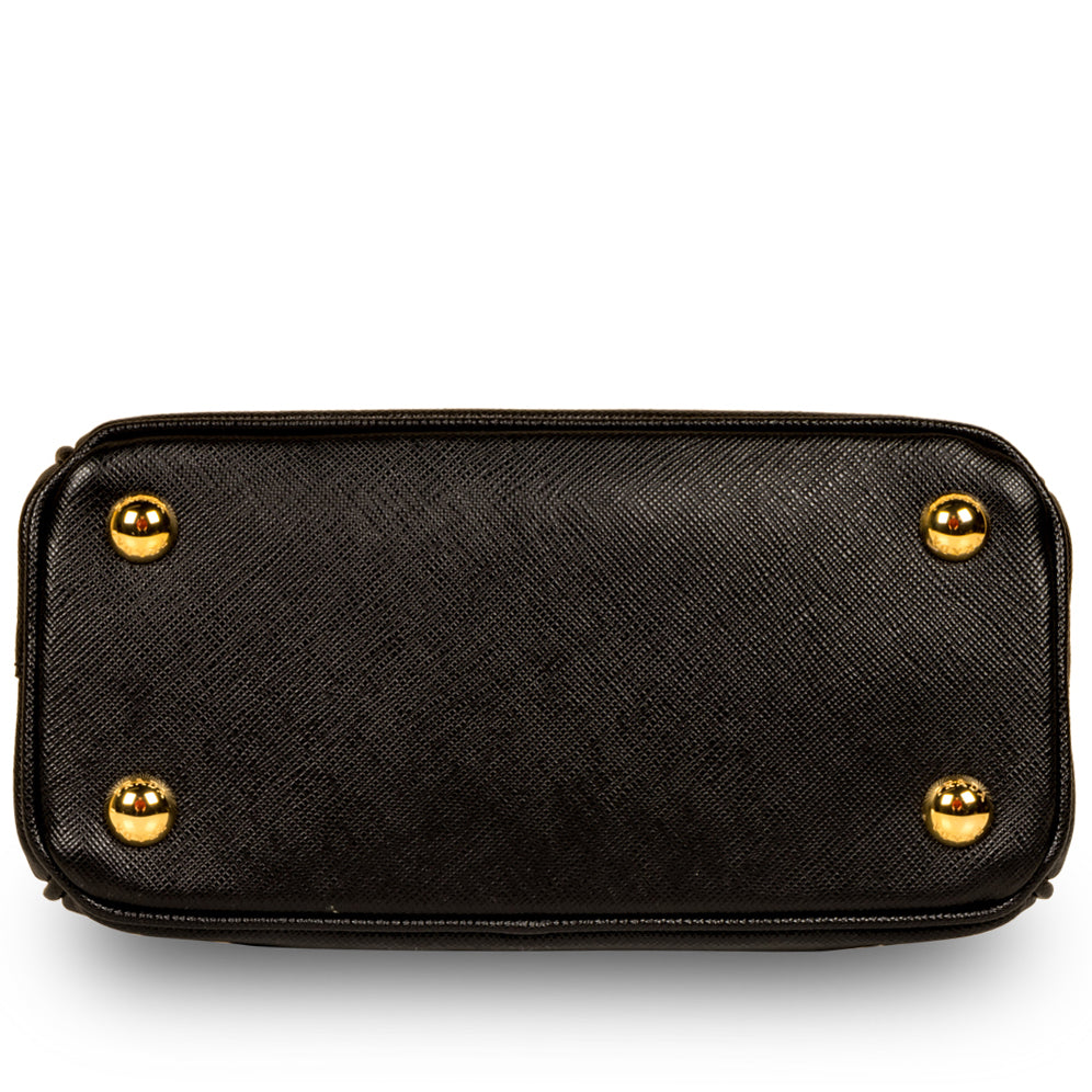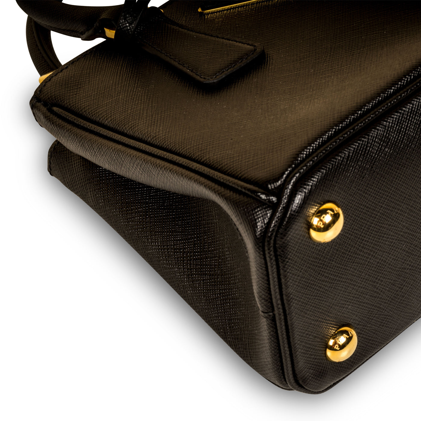 The Prada Micro Galleria bag is both, trendy sophisticated in its design, showcasing Italian glamour and craftsmanship to the fullest. Although versatile and understated enough for everyday wear, it is a stunning and unique design with textured Saffiano leather, structured leather straps and gorgeous gold tone trims. This classic colour way of black with gold hardware is the perfect addition to all-year wardrobe. Wear on the shoulder/crossbody with the detachable strap for daytime or carry by the structured leather handles for the evening; this bag suits any occasion.