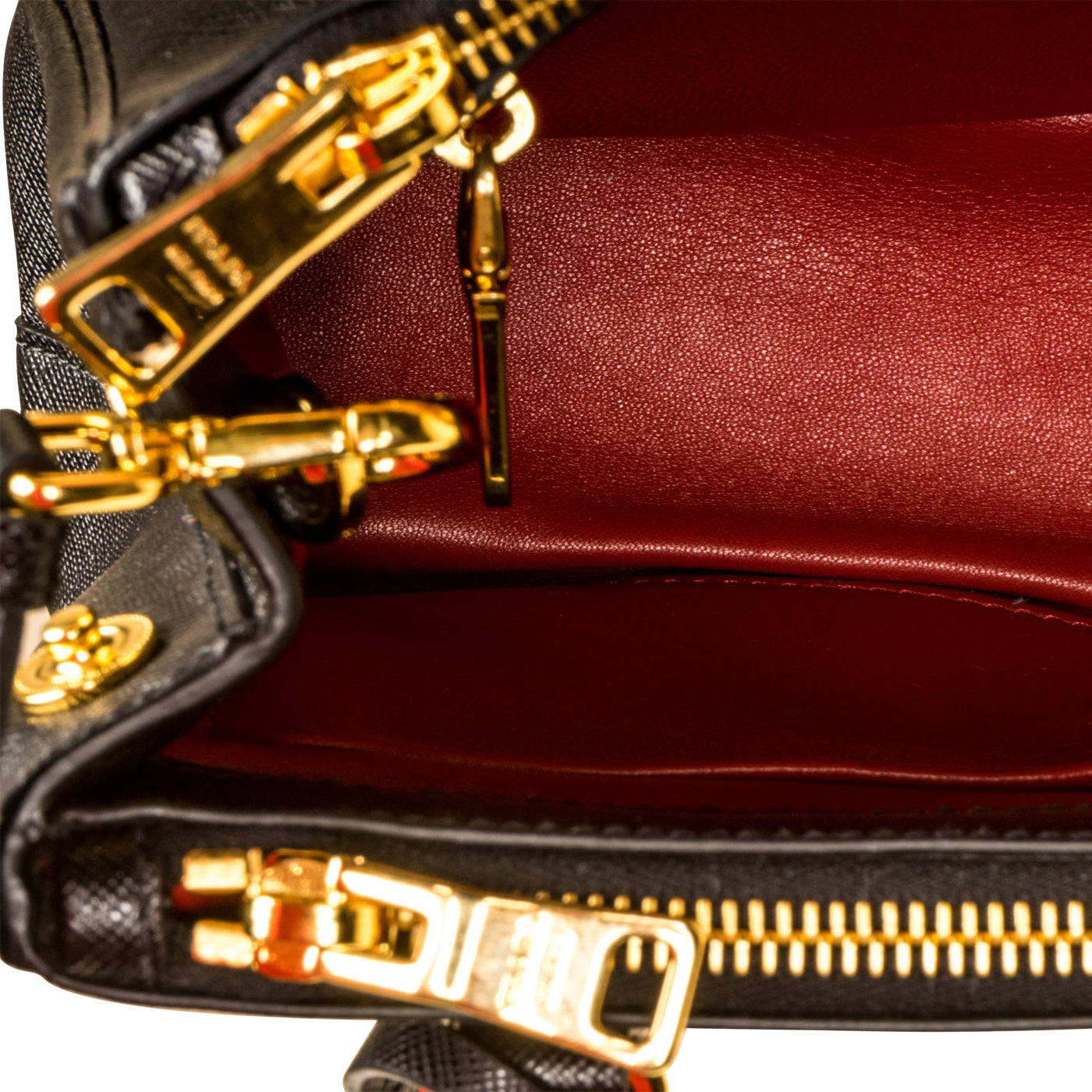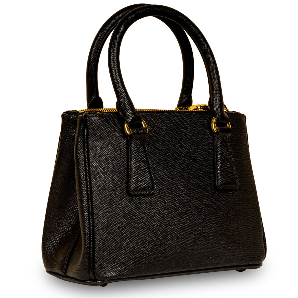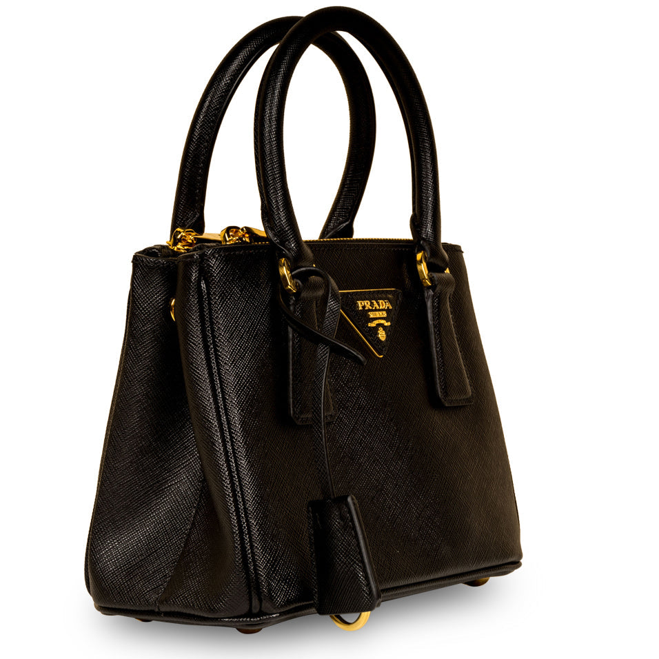 The Prada Micro Galleria bag is both, trendy sophisticated in its design, showcasing Italian glamour and craftsmanship to the fullest. Although versatile and understated enough for everyday wear, it is a stunning and unique design with textured Saffiano leather, structured leather straps and gorgeous gold tone trims. This classic colour way of black with gold hardware is the perfect addition to all-year wardrobe. Wear on the shoulder/crossbody with the detachable strap for daytime or carry by the structured leather handles for the evening; this bag suits any occasion.