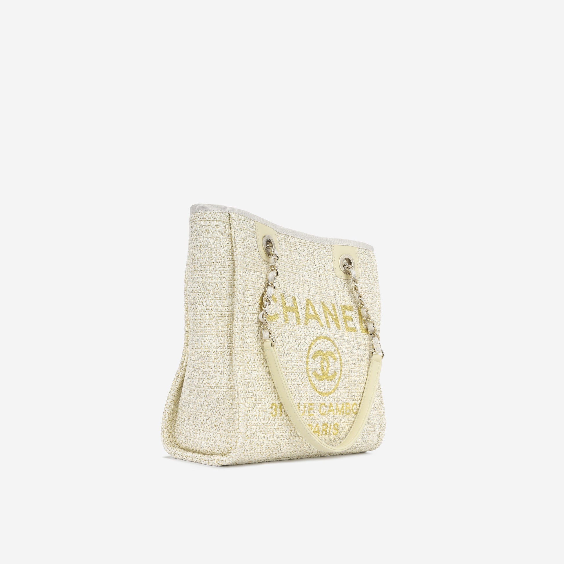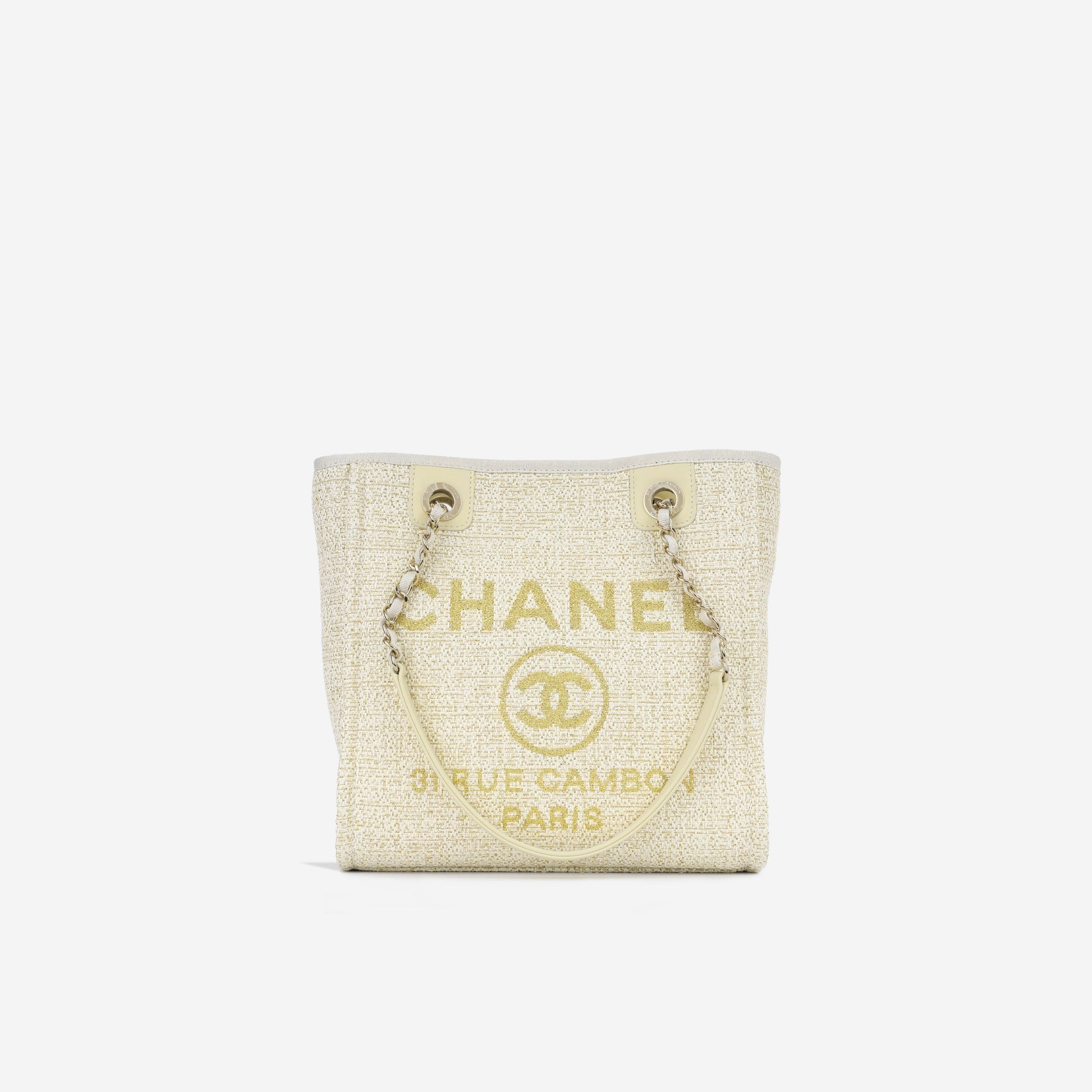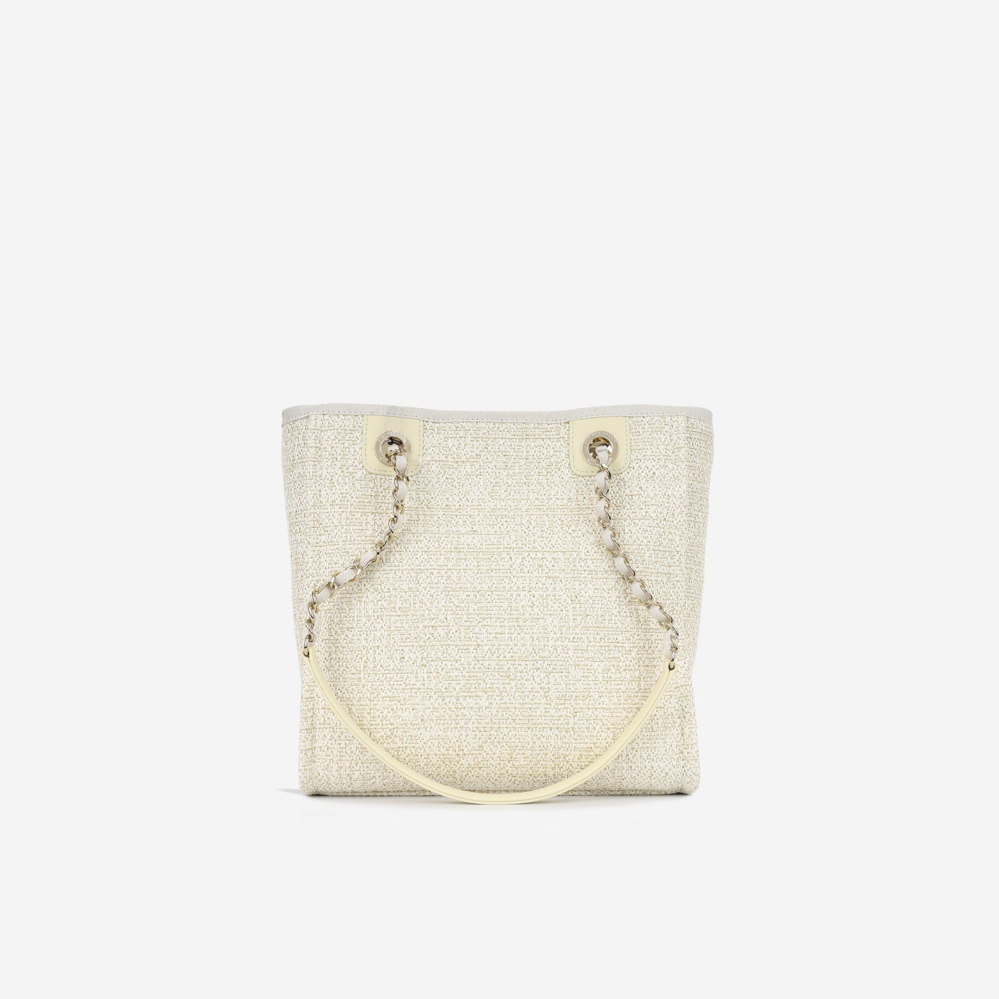 Introducing the mini Deauville, Chanel's interpretation of the perfect shopping tote. Crafted in various finishes from leather to tweeds and fabrics, this iconic bag is spacious enough to hold everything you need throughout the day. Whether you're traveling, spending a day at the beach, or running errands, the mini Deauville combines style and functionality effortlessly.