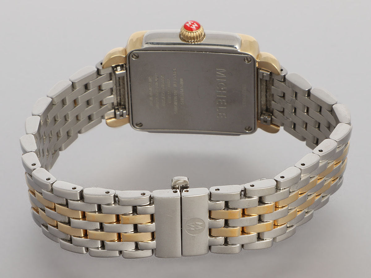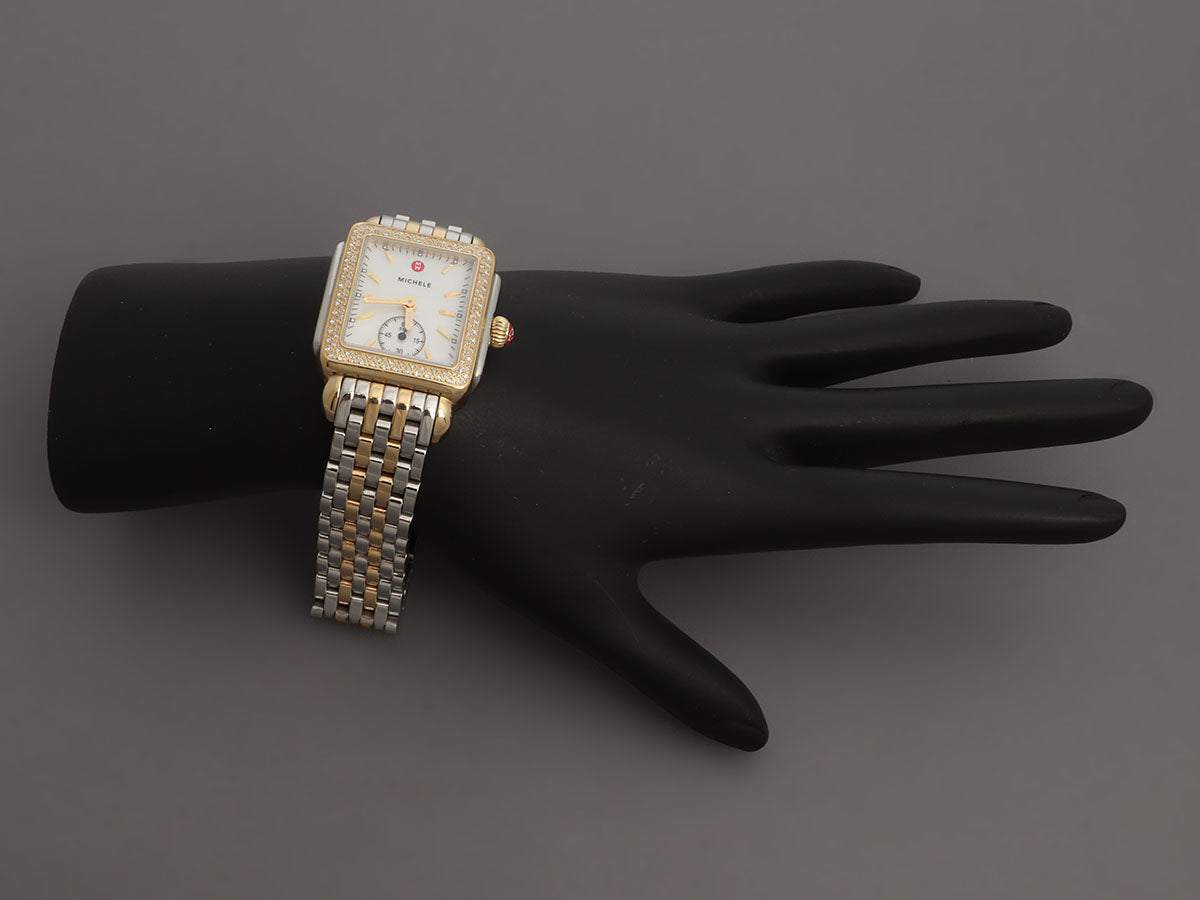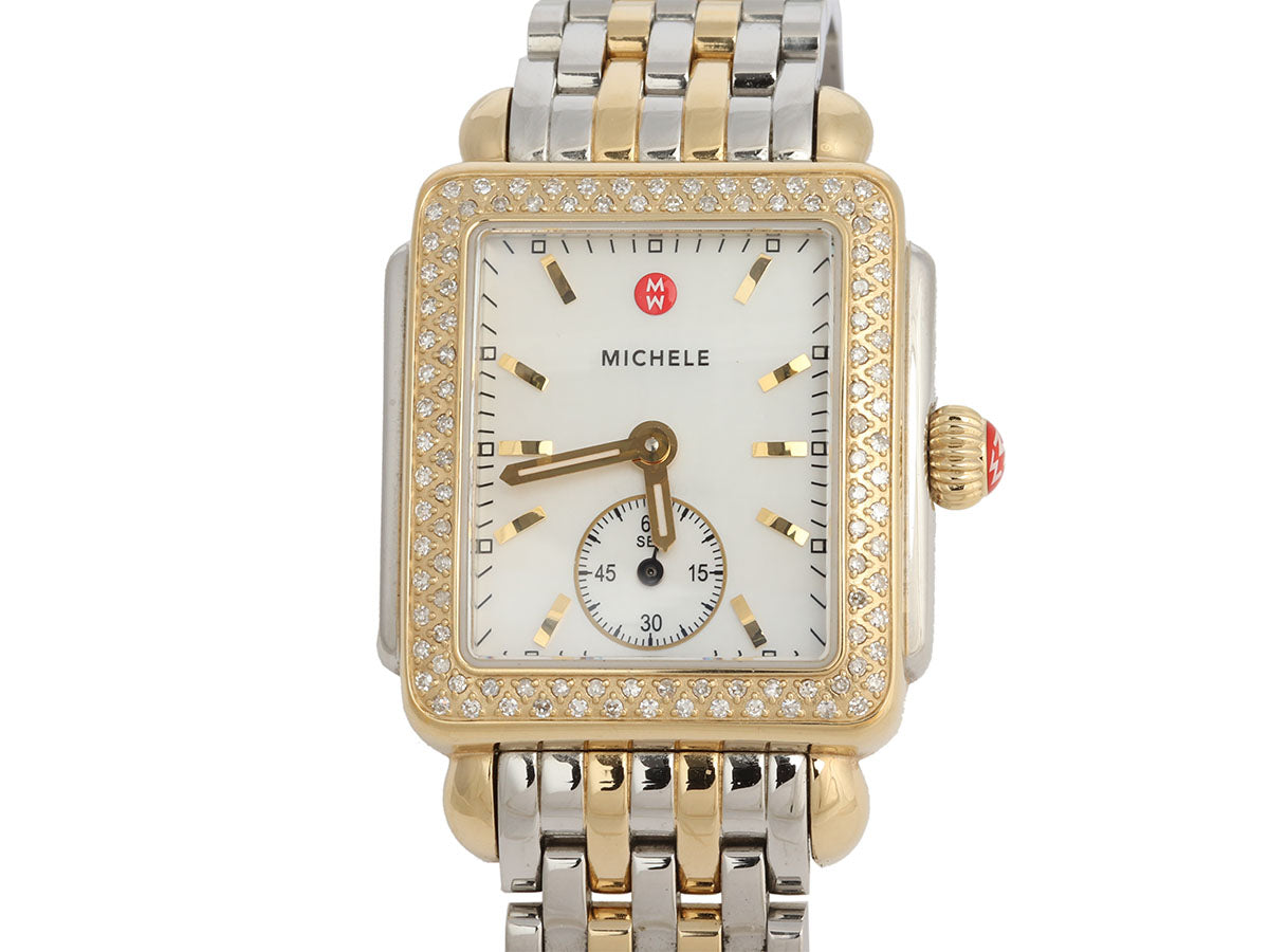 This Michele Two-Tone Diamond Deco Watch is made of stainless steel and yellow gold plate and has a head that measures 31 millimeters by 30 millimeters! The rectangular mother of pearl face is surrounded by a bezel encrusted with 0.49 carats of white diamonds. The hands and hour-marker batons are gold-plate and there is a seconds dial at the 6 o’clock position. In good condition, it has scratches on the metal. This Swiss-made quartz watch has a two-tone bracelet with a deployment clasp that can be put on and taken off with one hand!