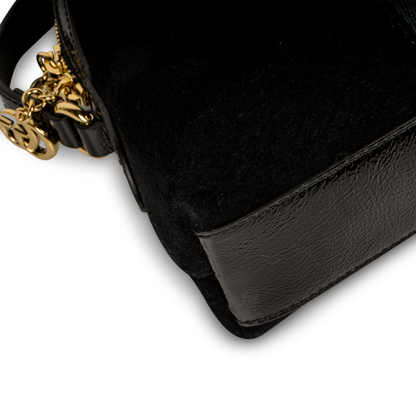 - Black patent leather trimming, base and shoulder strap