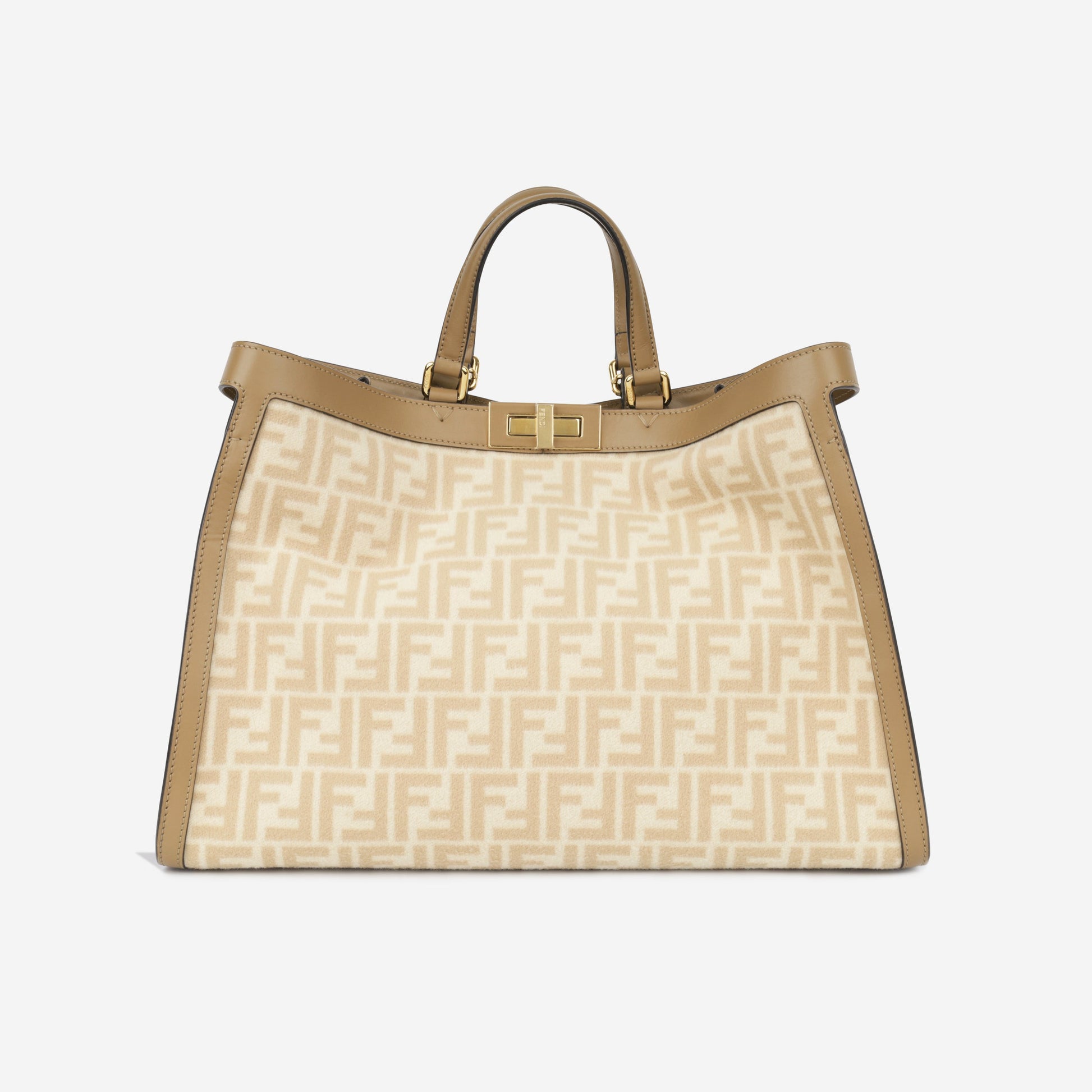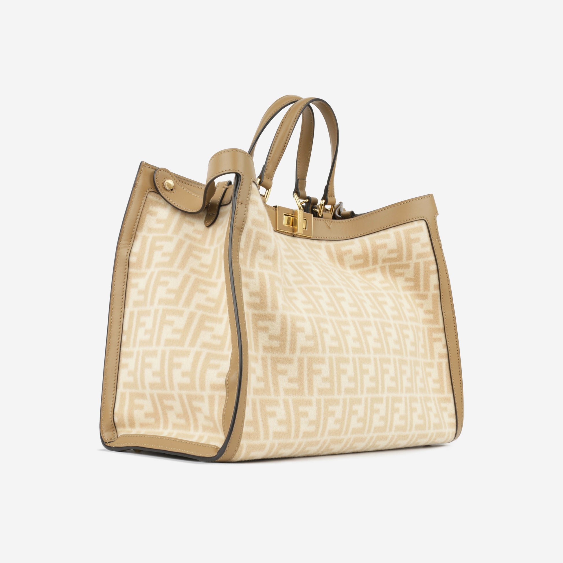 Fendi presents its iconic Peekaboo bag with smooth black calfskin leather and a pop of blue tone hardware. This bag is the perfect option for a modern, sleek woman on the go who needs to carry a lot with them. With two interior compartments divided by a stiff partition, an interior zip pocket, as well as the signature twist clasp - the Peekaboo is stylish, sophisticated, and elegant.