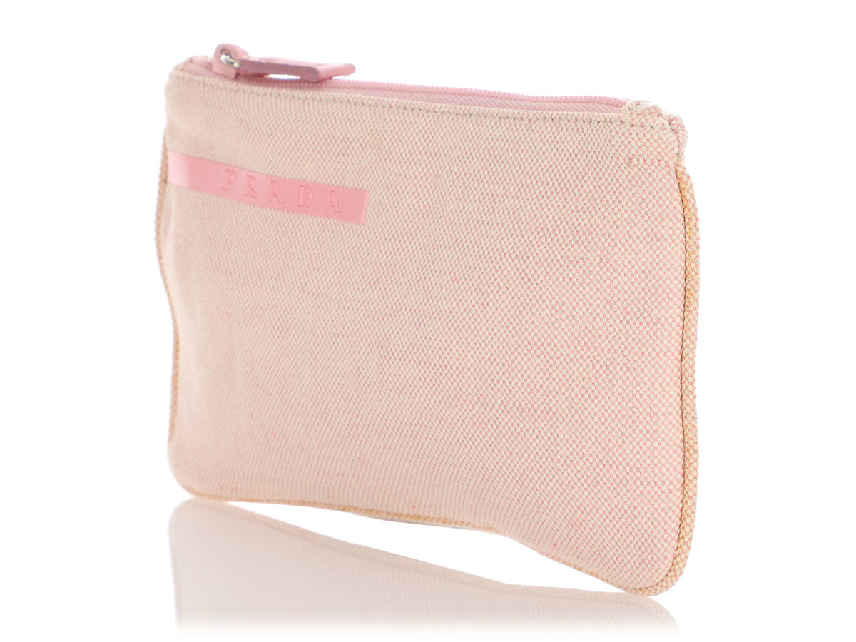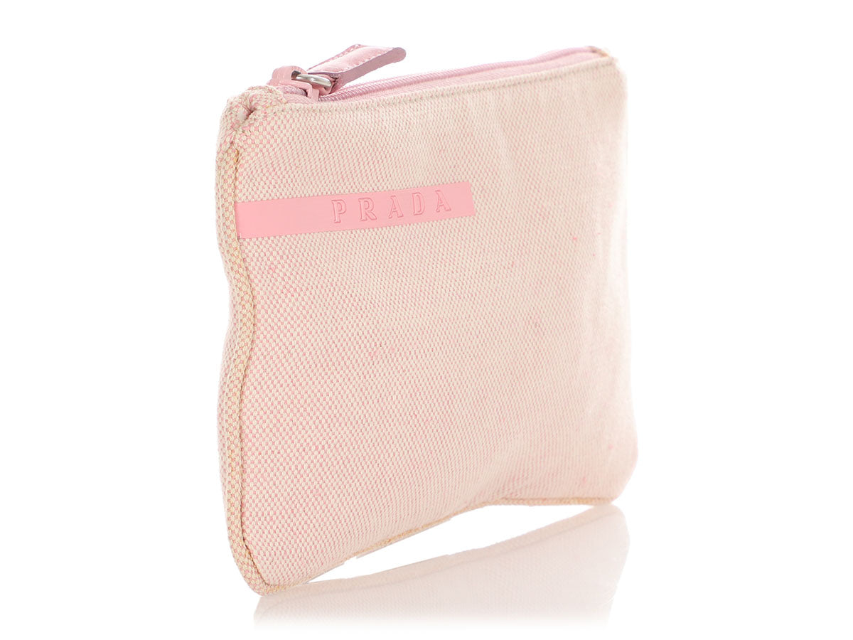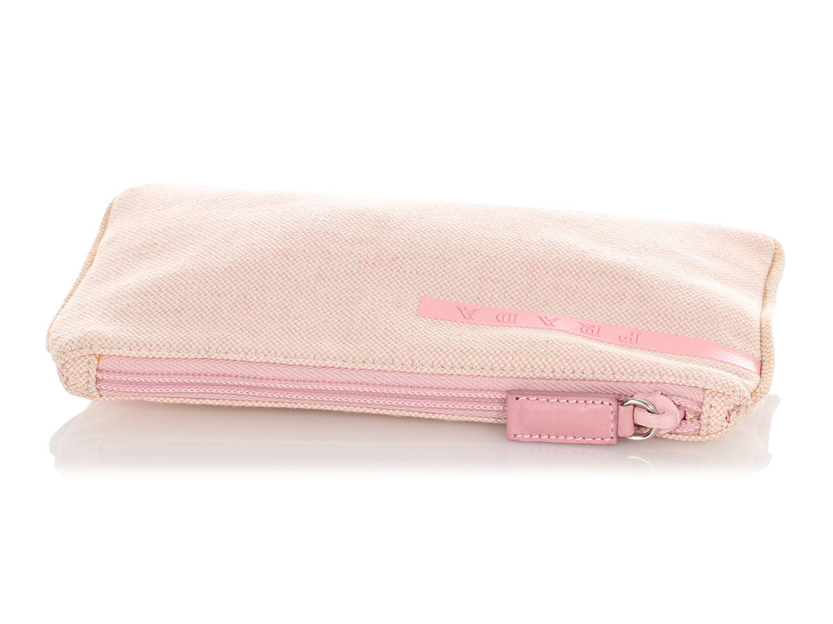 Prada’s Pink Canvas Zipped Pouch is a cute, casual case that keeps you organized on the go! Made of light-pink fabric with just a touch of silver hardware, it has a pink-leather zipper pull and unzips to reveal a pocketless interior lined in darker-pink fabric. In great condition with a box and cards, it has some yellowing on the lining and the zipper pull is a bit dingy. Toss it into a larger bag or carry it as a clutch for a sporty look!