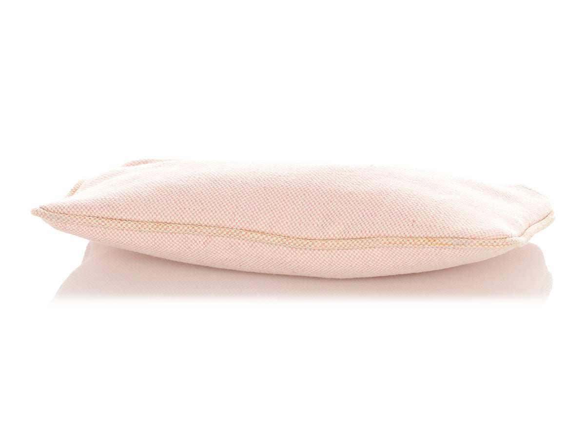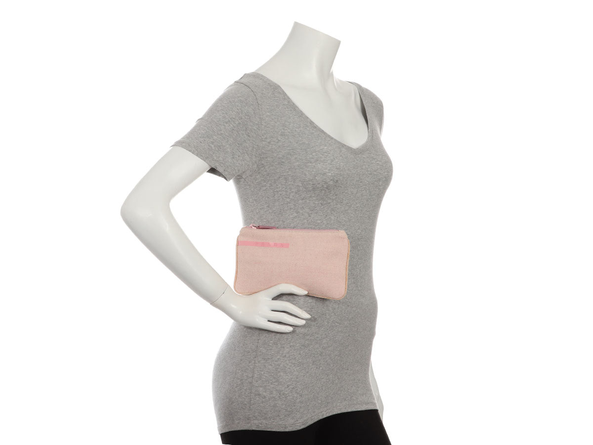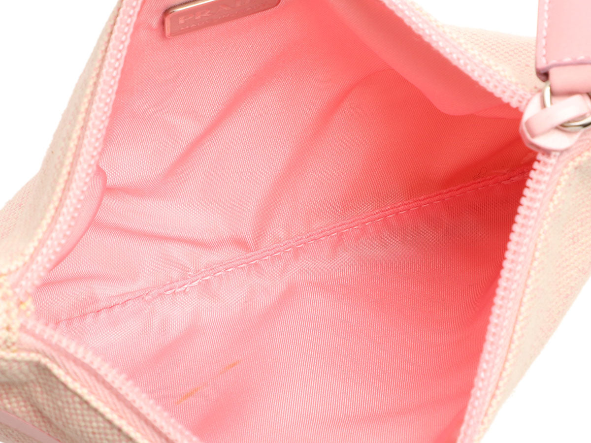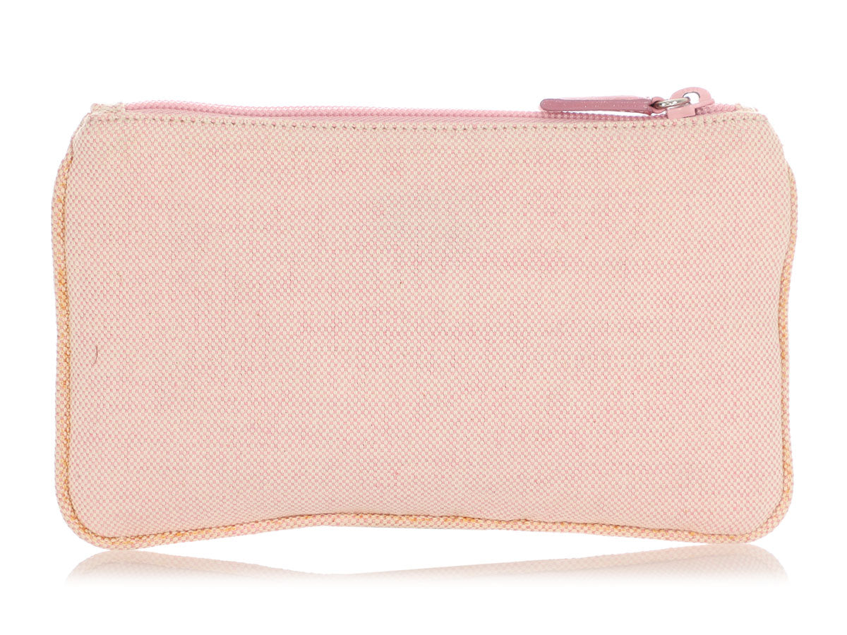 Prada’s Pink Canvas Zipped Pouch is a cute, casual case that keeps you organized on the go! Made of light-pink fabric with just a touch of silver hardware, it has a pink-leather zipper pull and unzips to reveal a pocketless interior lined in darker-pink fabric. In great condition with a box and cards, it has some yellowing on the lining and the zipper pull is a bit dingy. Toss it into a larger bag or carry it as a clutch for a sporty look!