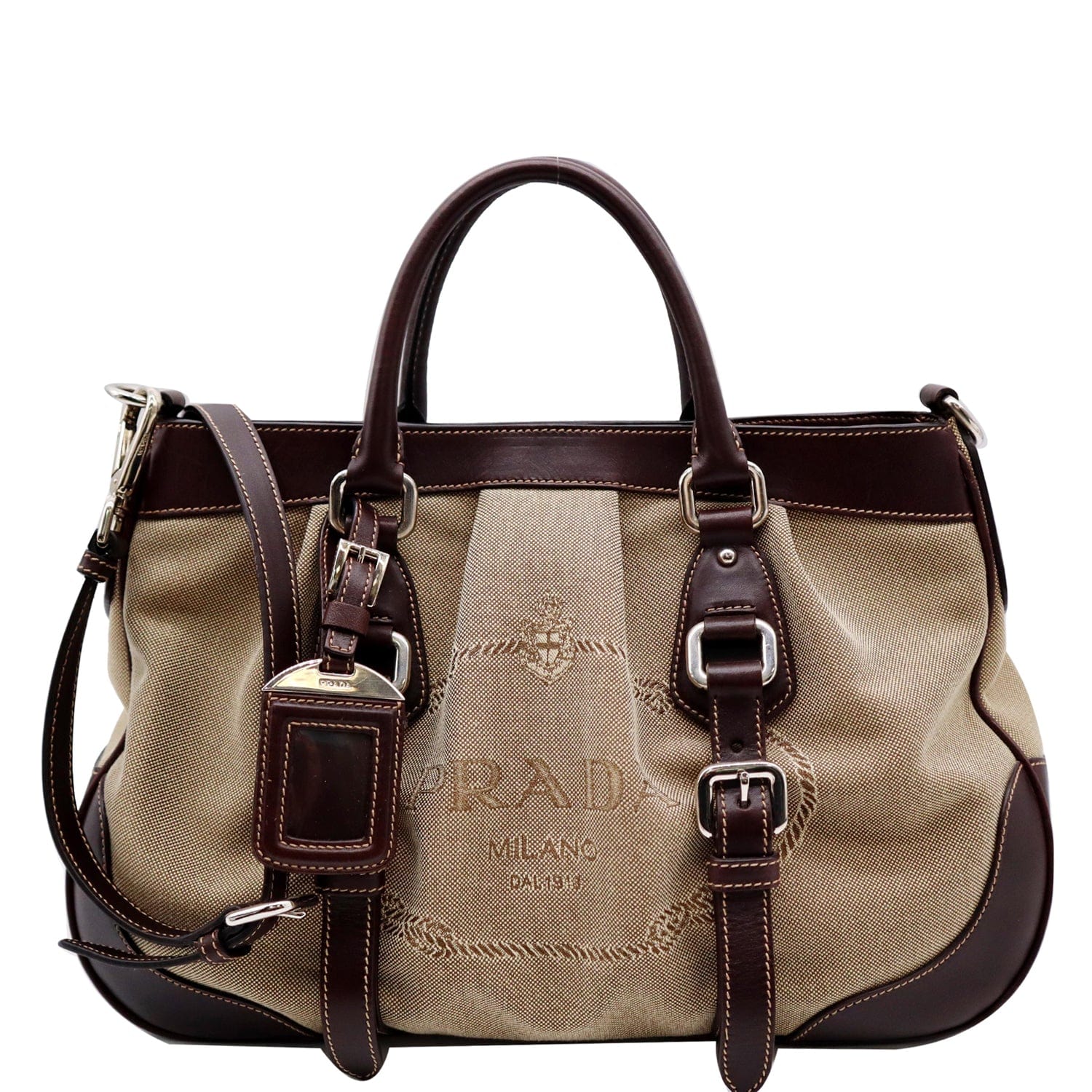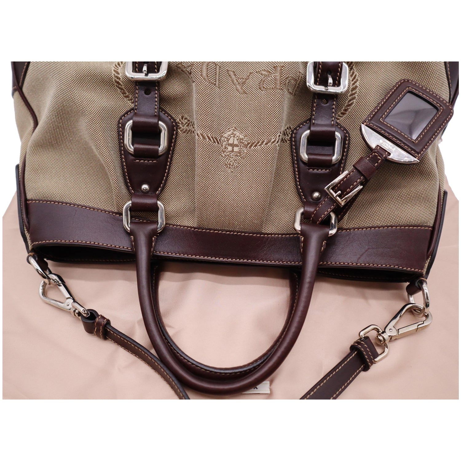 Used Prada Jacquard Logo Canvas Leather Tote Shoulder Bag