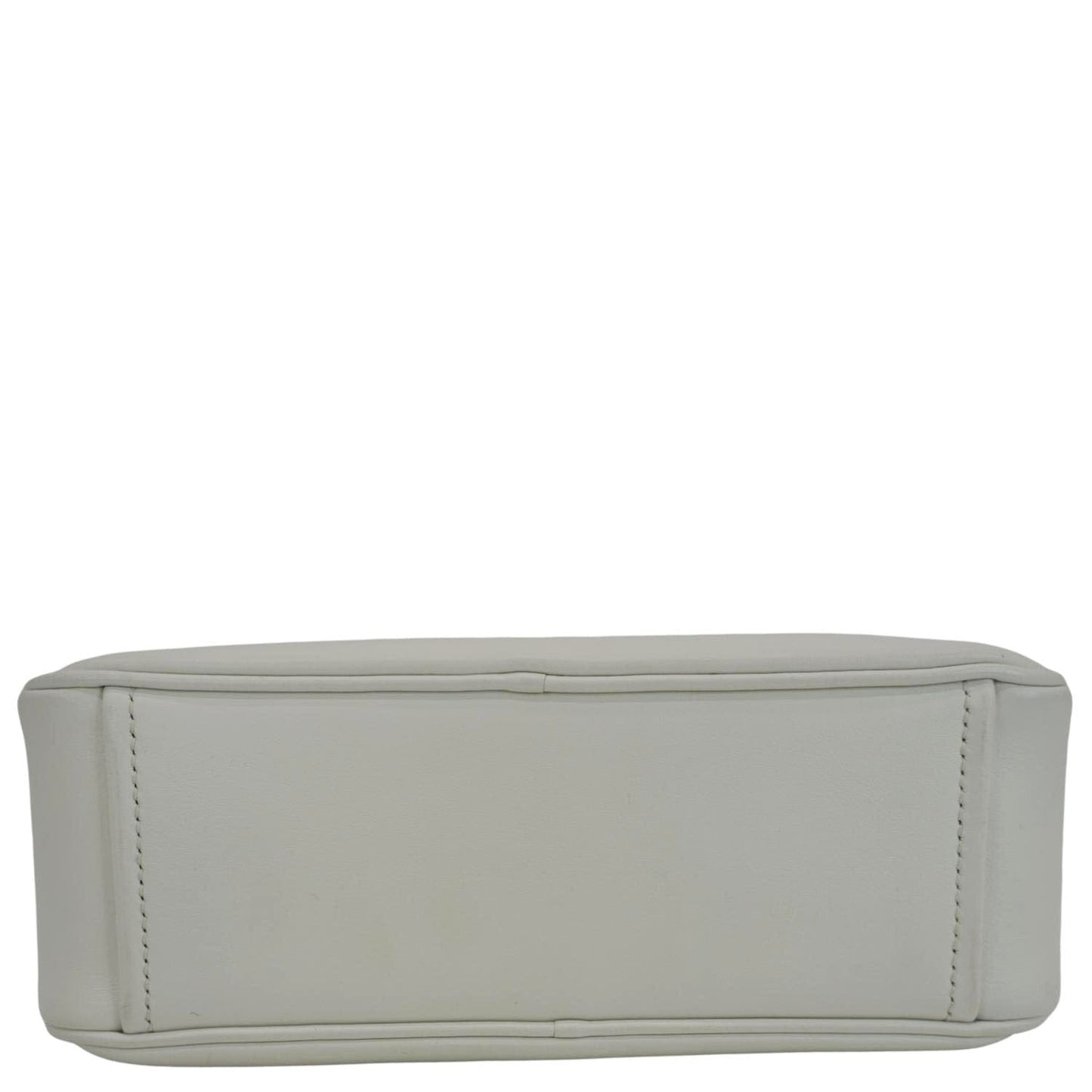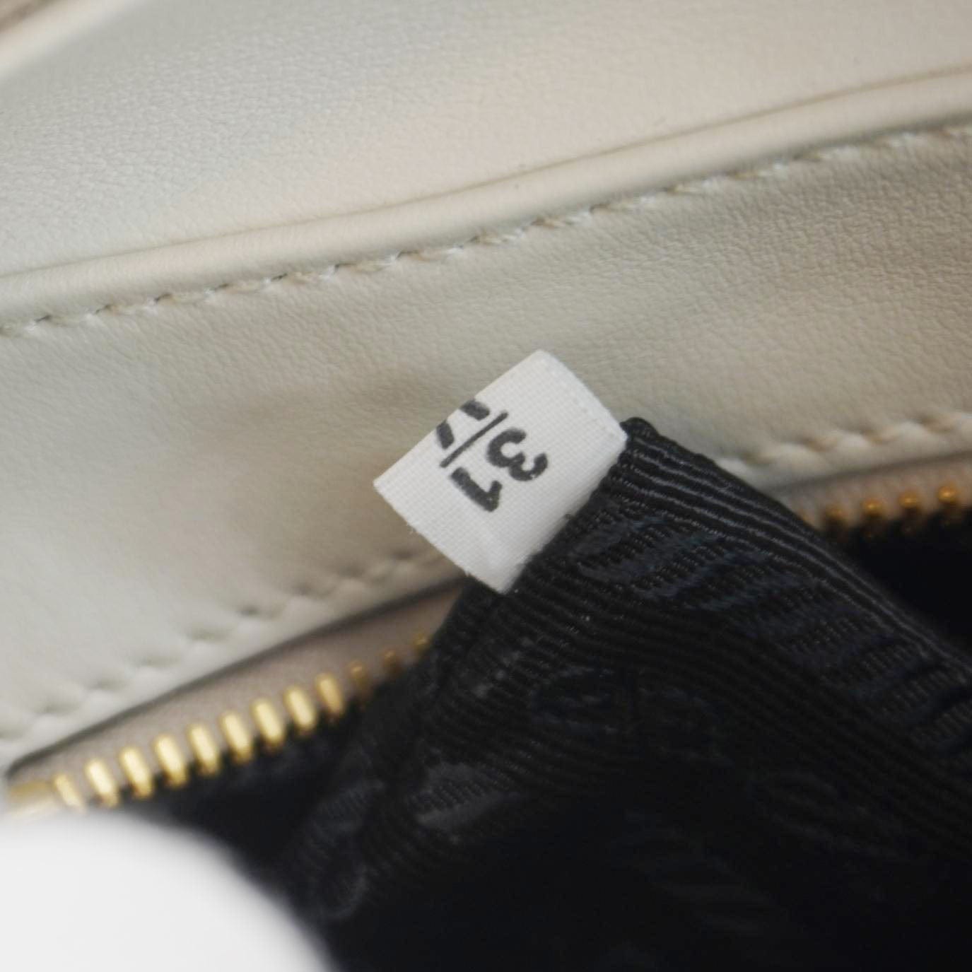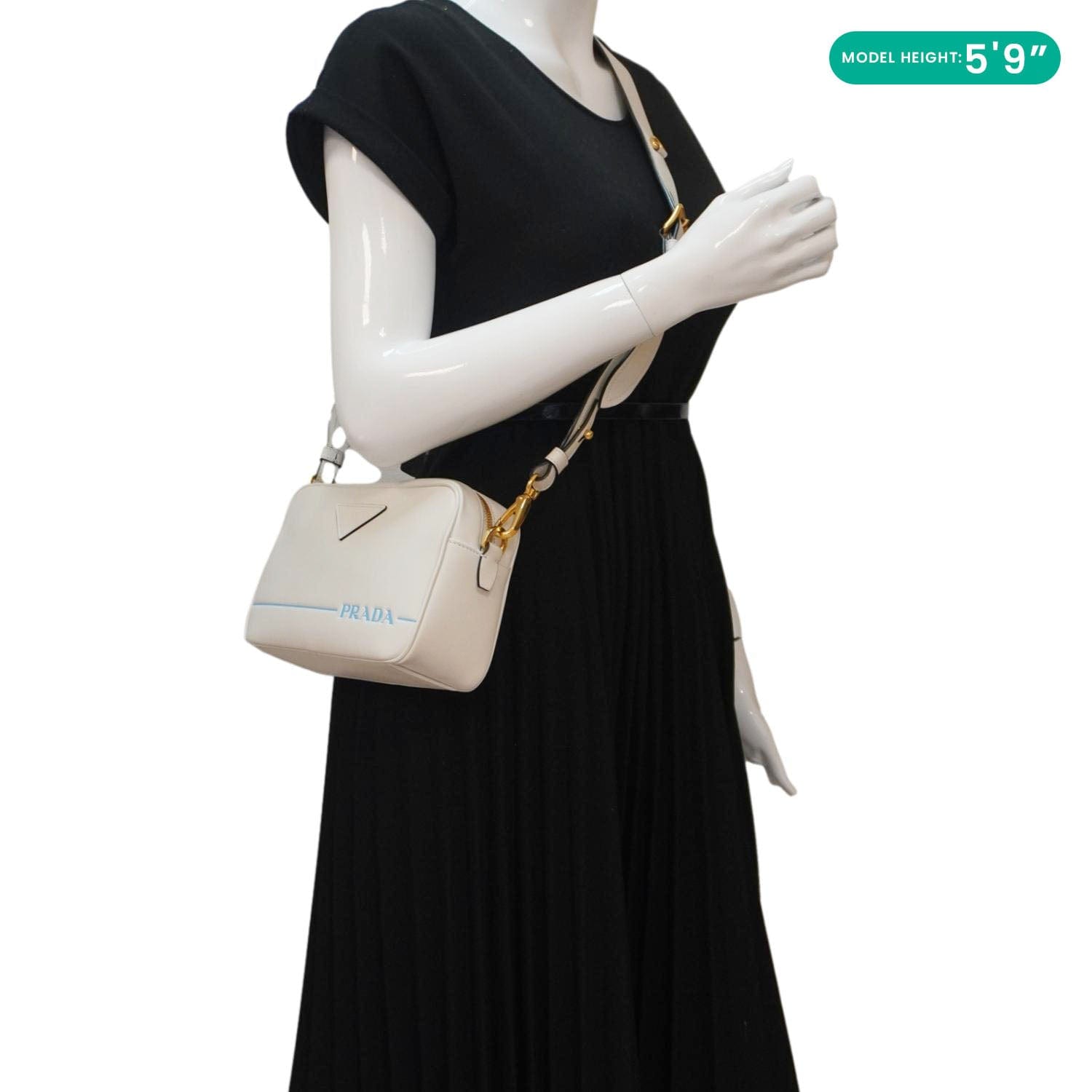 The Prada Mirage Leather Camera Bag in white is a sleek and modern accessory. Featuring a compact design, gold-tone hardware, and an adjustable strap, it combines practicality with timeless elegance.