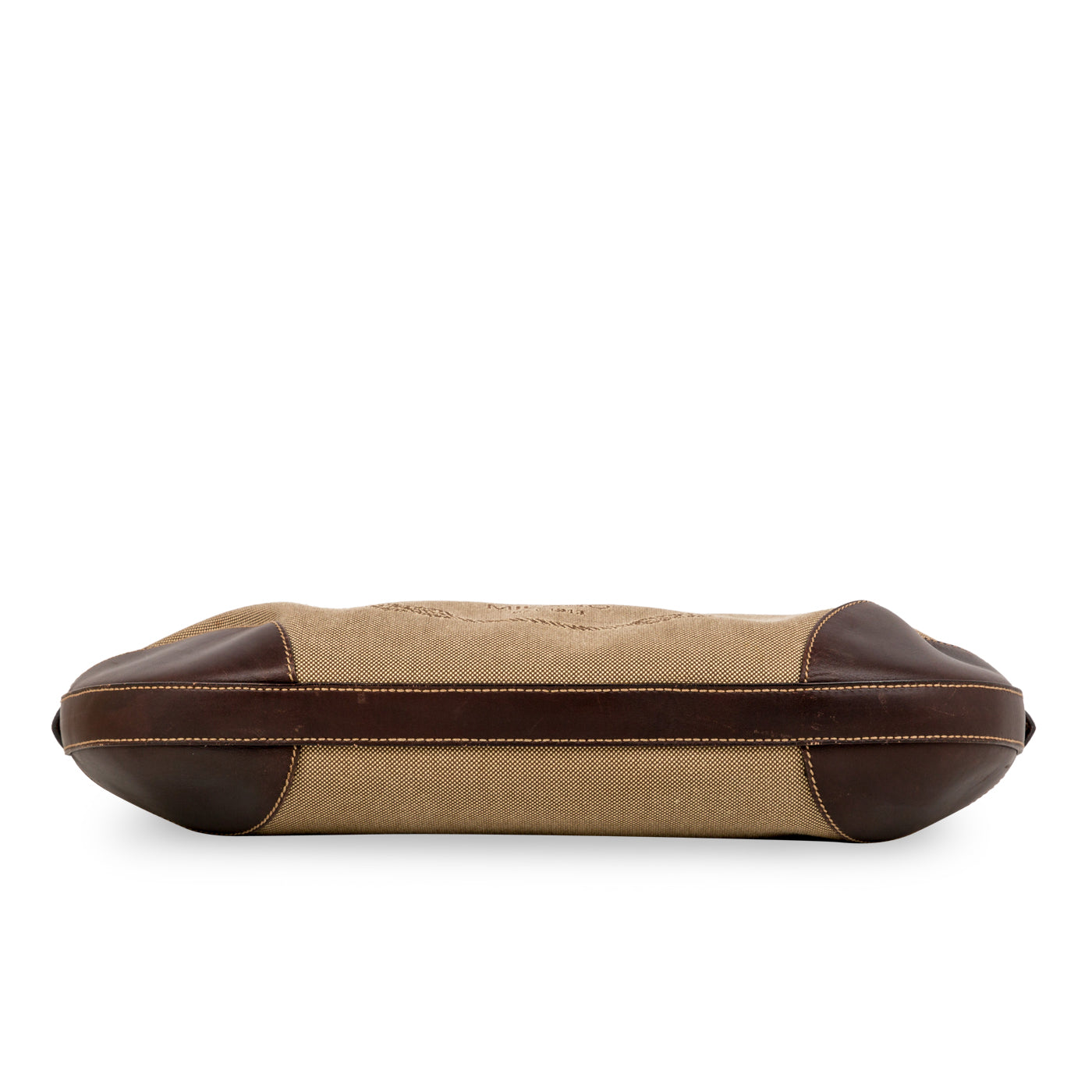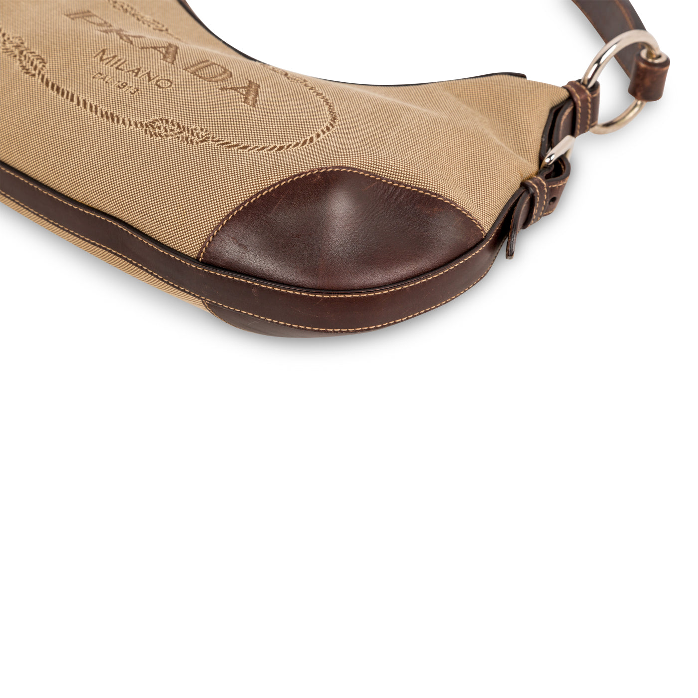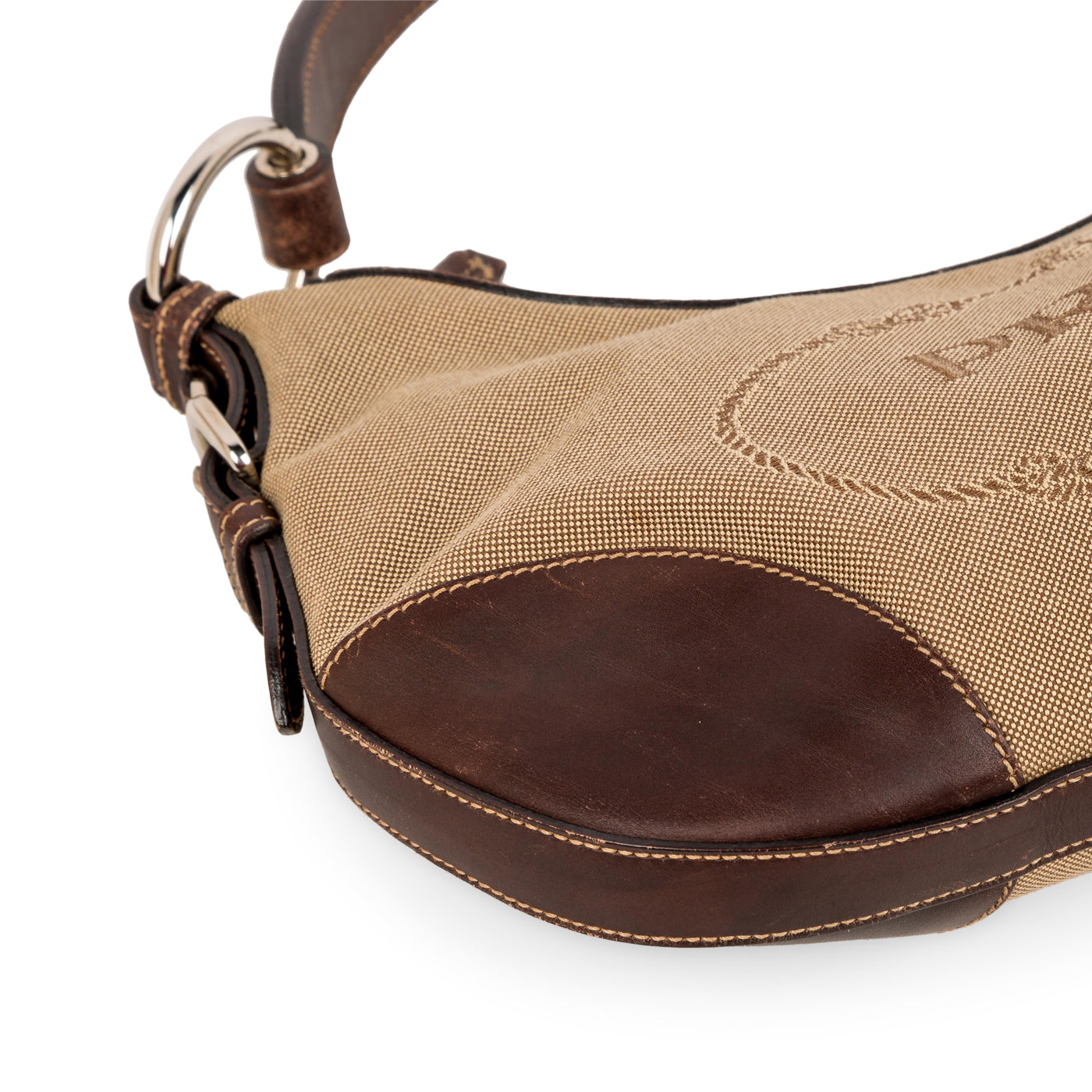 The Prada Canvas Tessuto bag is a small, classic hobo shoulder bag, perfect for everyday use. Adorned with the iconic logo print featured on the base of the bag and contrasting dark brown leather features, the tessuto hobo is perfect for daytime casual use – a great bag to grab on the go. With the classic neutral brown tones in both canvas and leather, Prada have crafted a perfect functional bag for casual daytime use.