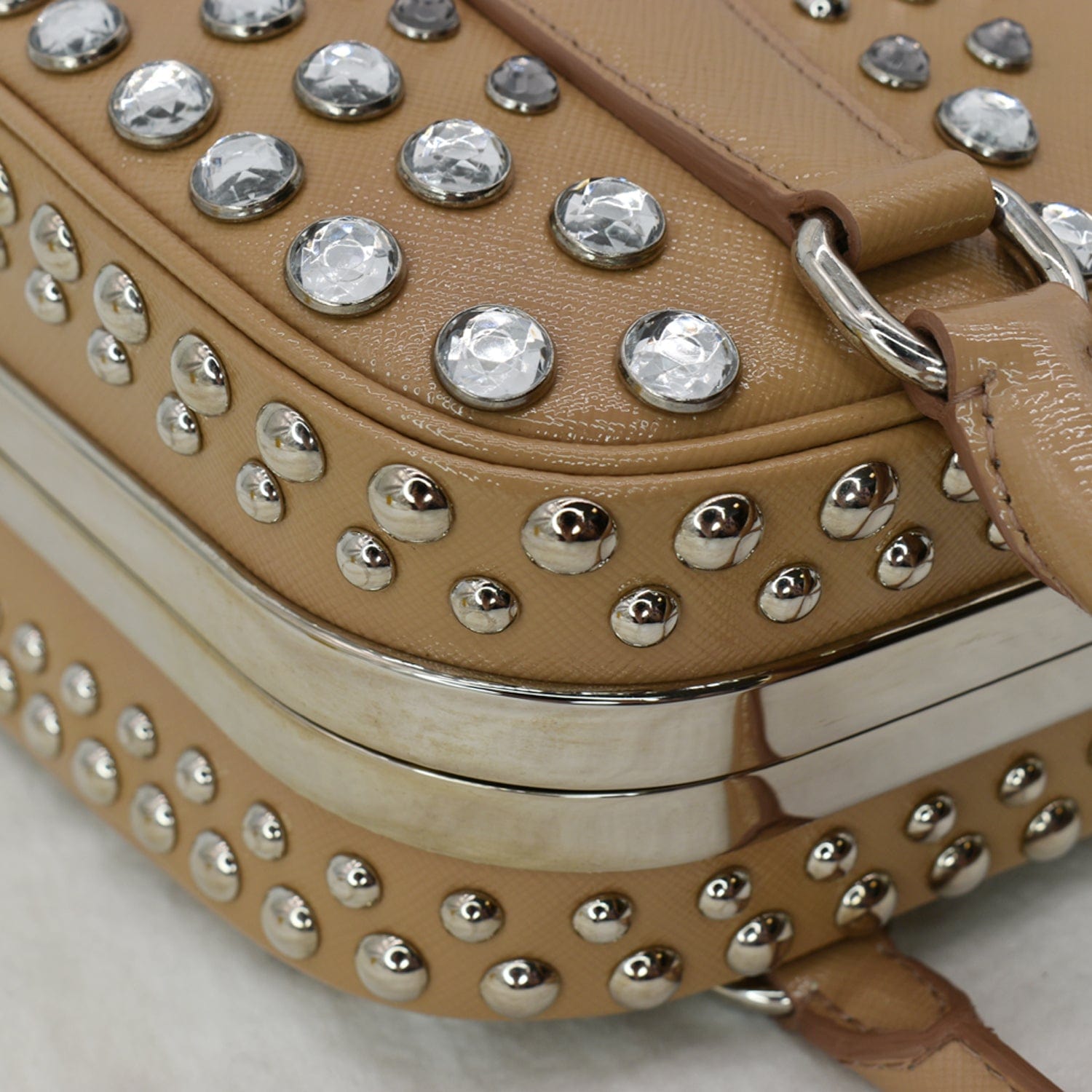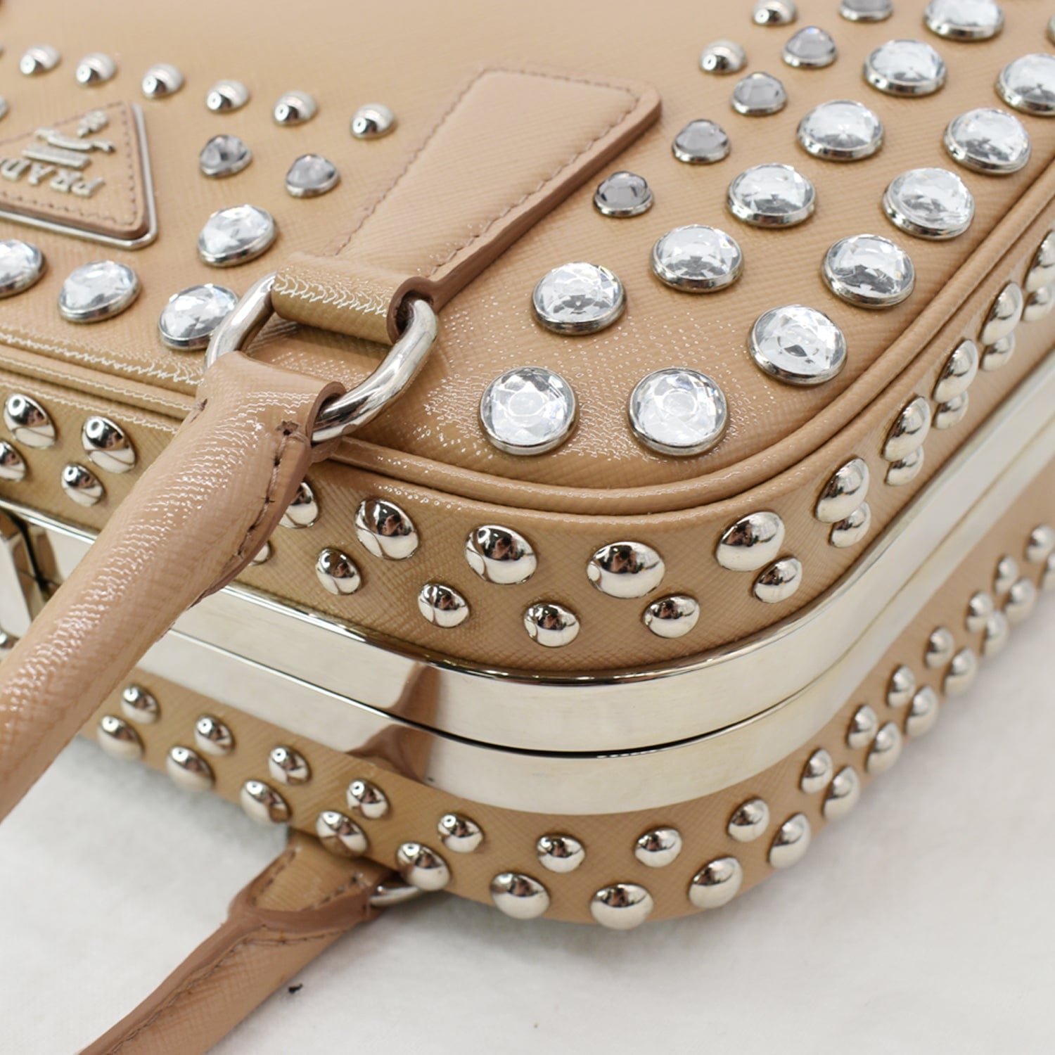 PRADA Vernice Crystal Small Frame Studded Saffiano Leather Top Handle Bag Beige