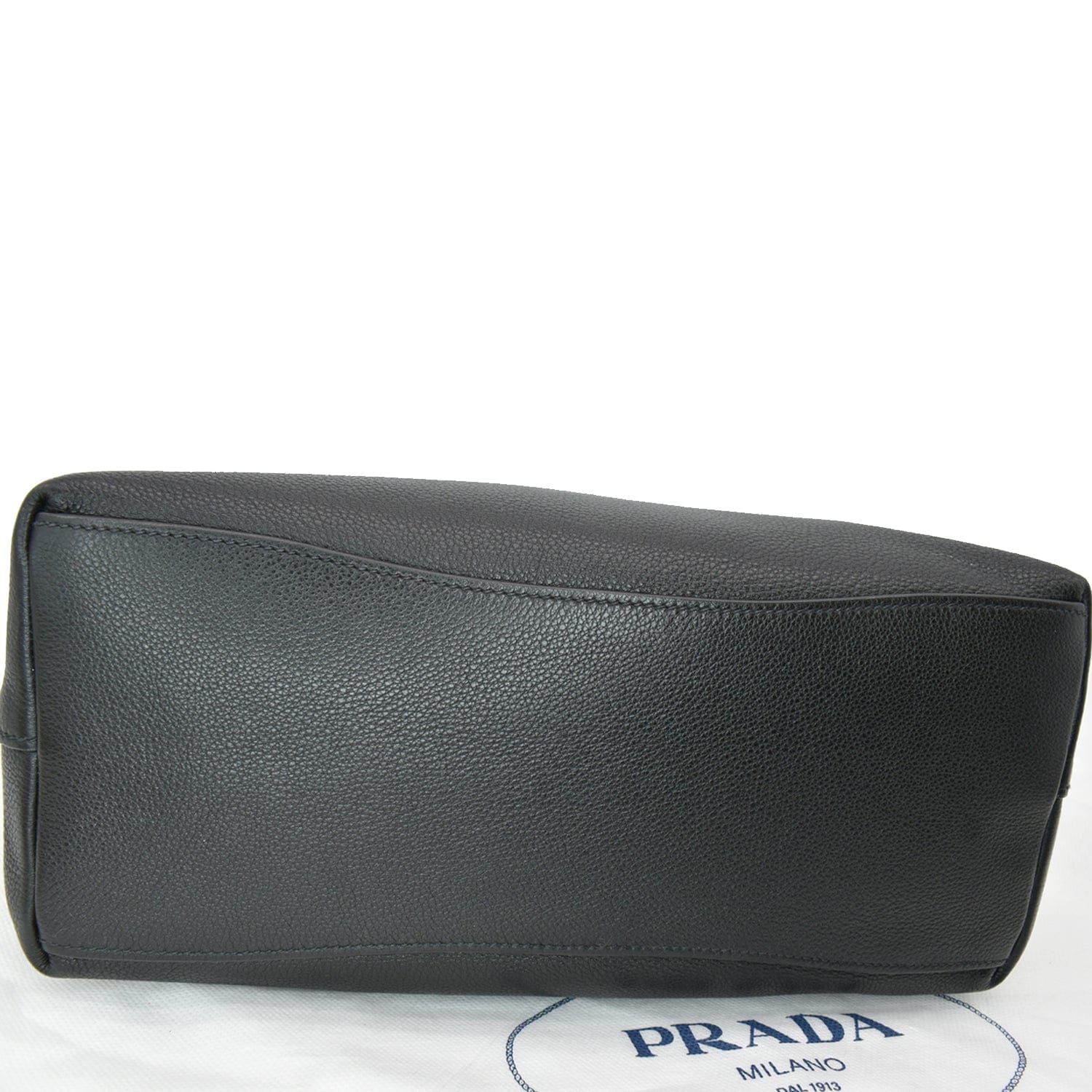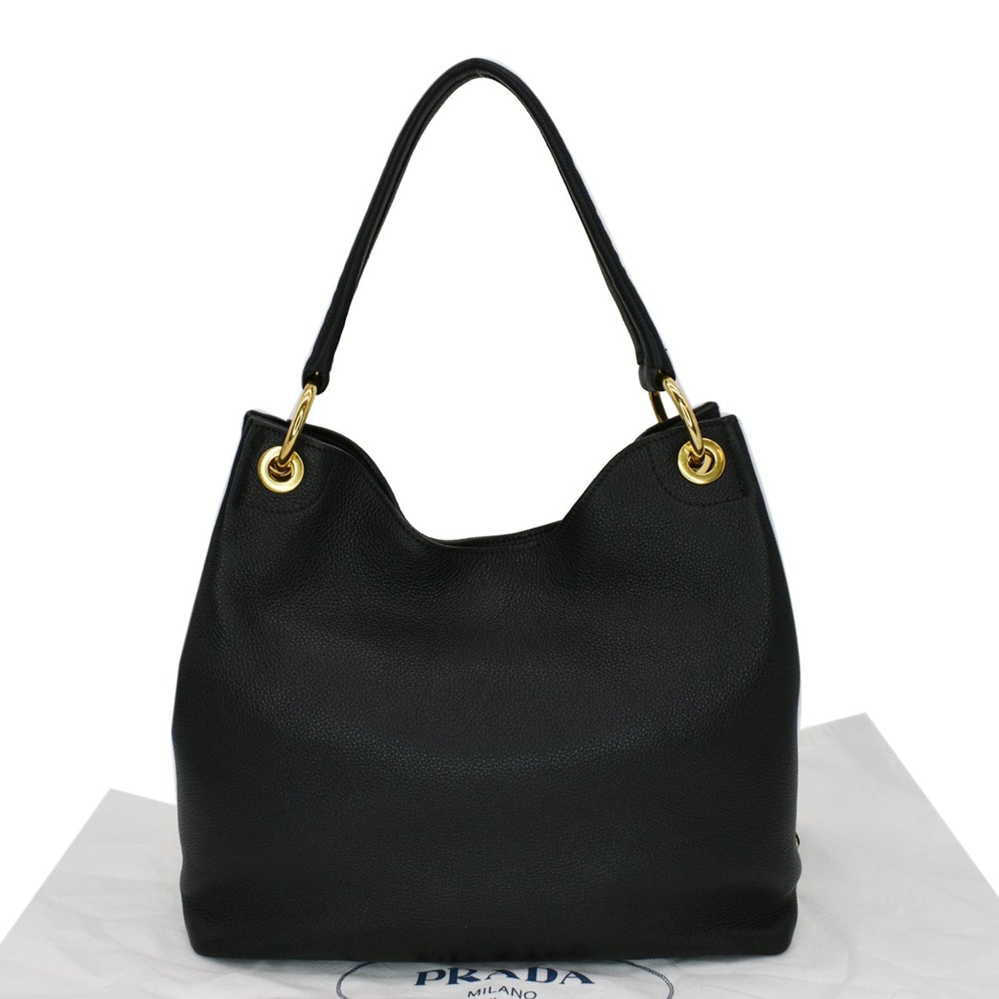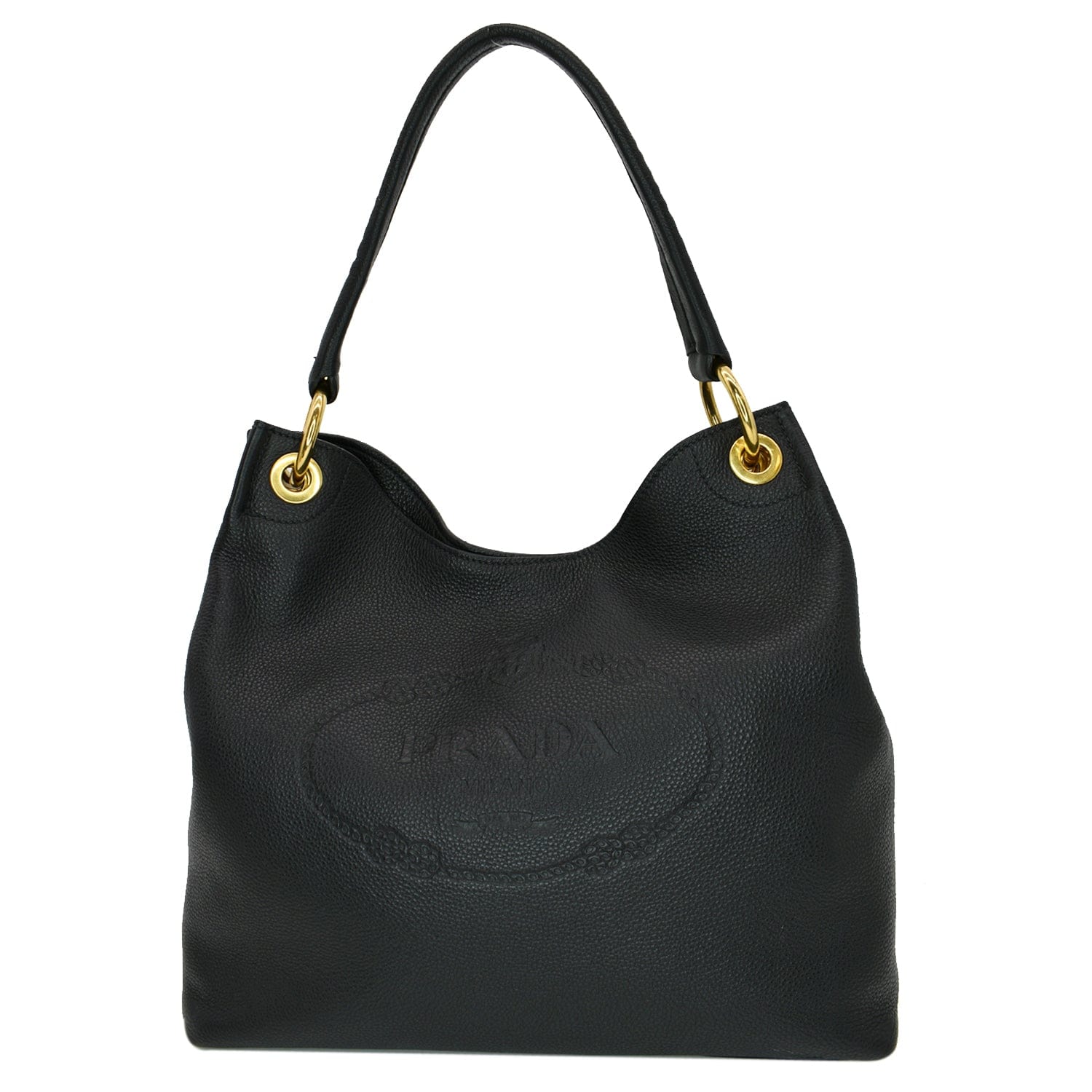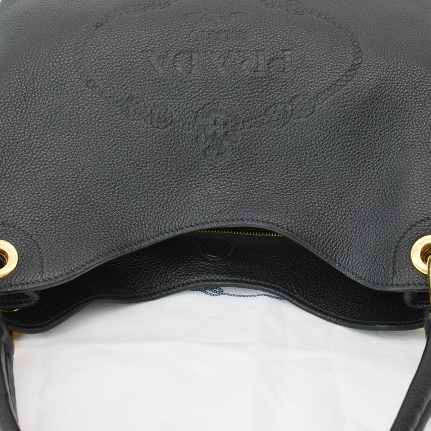 PRADA Vitello Phenix Leather Embossed Logo Hobo Bag Black