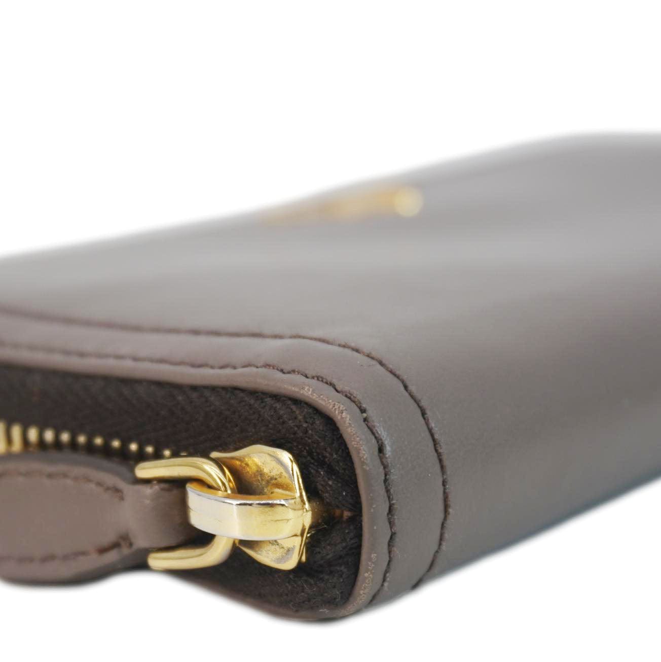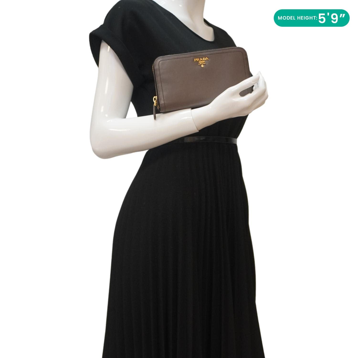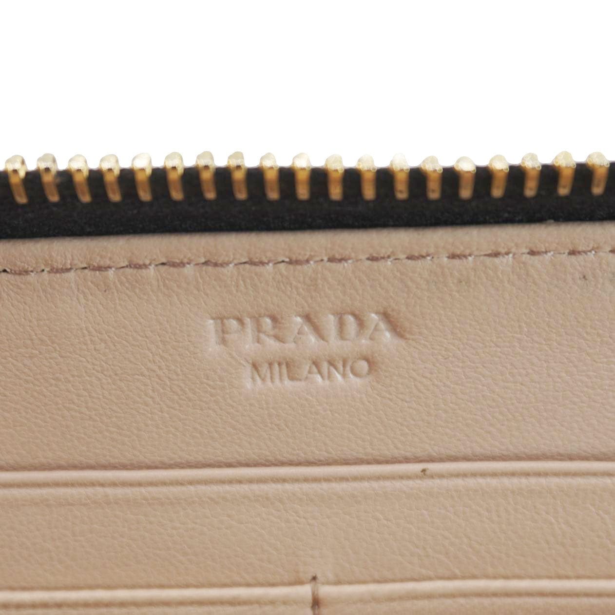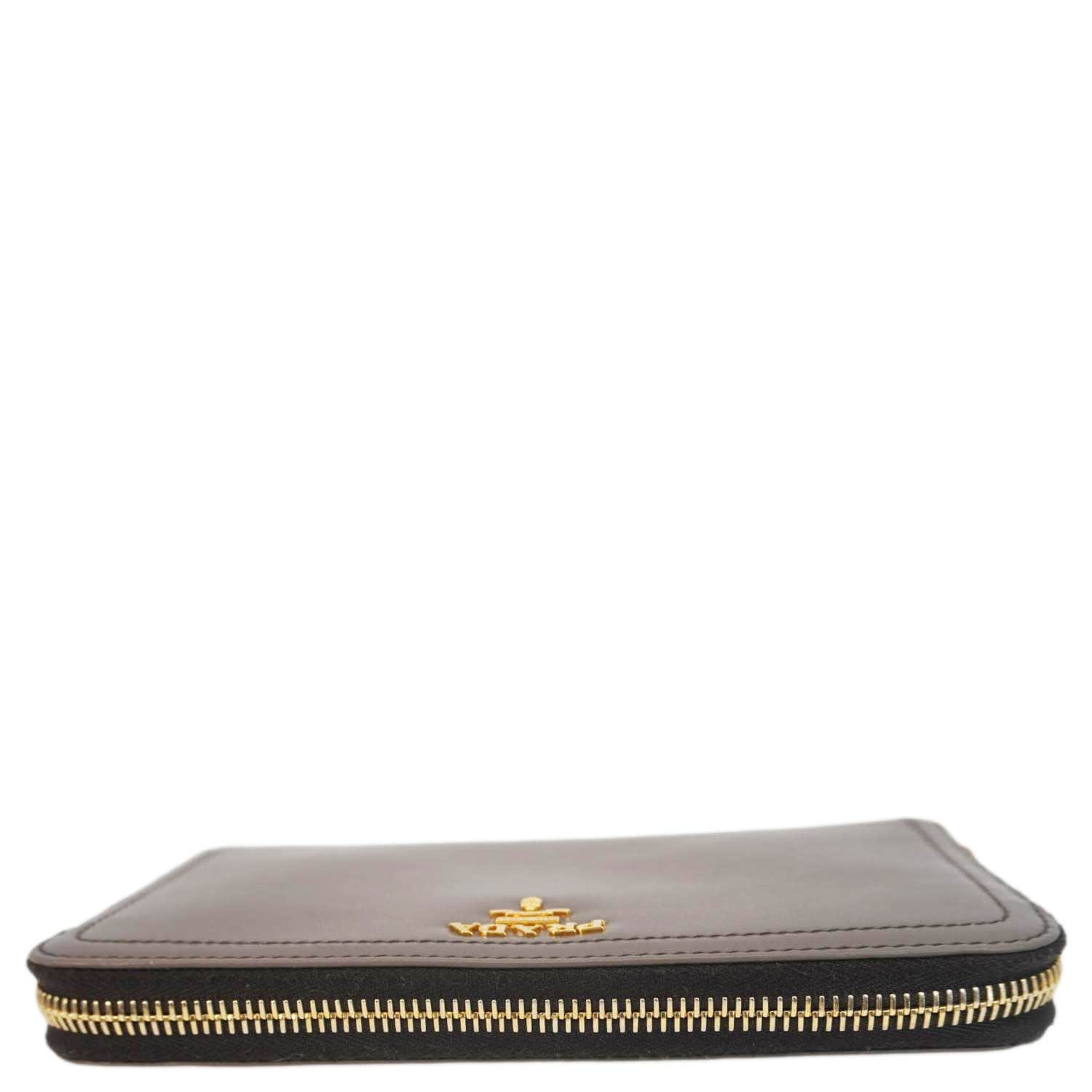 The Prada zip-around leather wallet in brown is a timeless accessory crafted from smooth leather. It features multiple compartments and card slots for organized storage, secured with a durable zip closure.